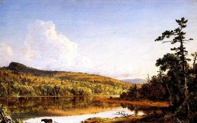 在他的作品中,似乎还见不到工业文明的痕迹,眼前尽是旷远的原野,森林,河流,瀑布,火山,冰川,多数是宇宙洪荒而少人烟的景象。哥伦布没有发现印地安的桃源世界前,这里就与文明的社会相远离,一切是原生态,也成了新移民美洲的画家大展身手的好环境,放在今天可不容易得到。