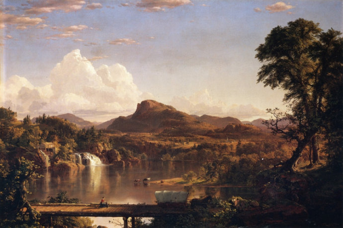 我们观赏科尔与丘奇等人的作品,与俄国巡回画派的比较,俄国的视野限制在西伯利亚那片森林,往往有时会注意视觉的焦点,近景的刻画,比如那些古怪的大树,当然丘奇等人偶尔也画近景,比如上面说的《老船》,但远观的作品占了多数,视线伸展得非常的长远,这也与美洲的地域风情有关:荒野,原始,古悠。