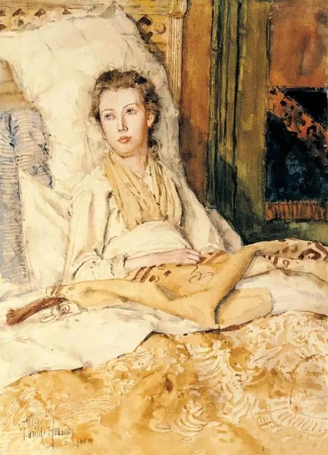因为笔触的纤细,远观时还真地看不出有多少笔触的张扬,所以显得十分的可人。艺术的世界花团锦簇,显然是艺术家的一种选择,彰显其人生美好幸福的一面,他画的花树清丽可人,而画美人时,也是花一般的梦境围绕,纵是没有画花,纤细而色彩丰富的笔触,仿佛也是隐形的花,无处不在。