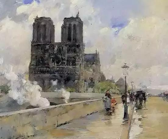 虽然哈森是美国画家,但是他的欧洲味还是太重了一点,纵使画了美国旗子,但给人的印象仍然仿佛很欧洲,而不是摩天大楼林立的美国,他的色调十分的清丽,调和,明快,而且十分的湿润,要说有点深重的就是着黑衣的有马车人群,还有巴黎圣母院的建筑吧,他的世界更多是花团锦簇的世界,凡高爱画花与树,在哈森的作品得到发扬,只不过他的笔触纤细,严谨,耐得烦,似乎在磨着色彩的洋工夫。所有的笔触像东方绘画的皴法,属于纤细的风格,近龚贤的那种作派,只不过是彩色的。