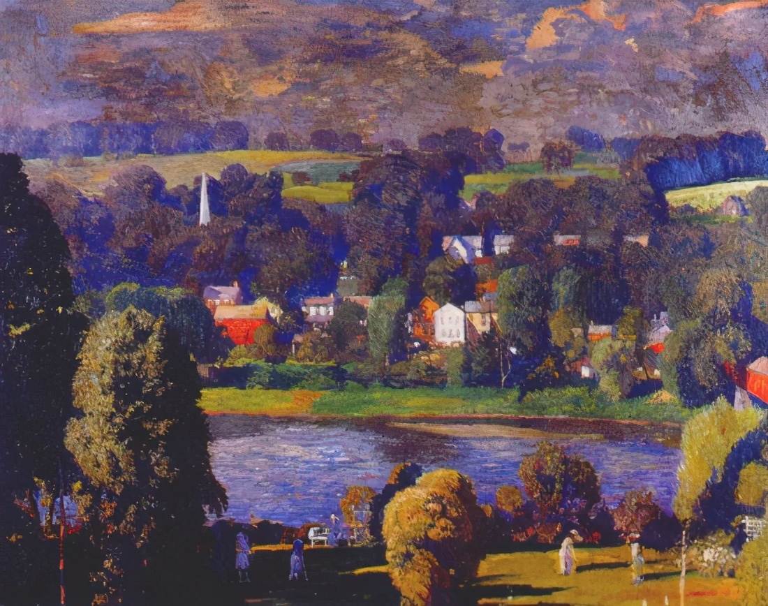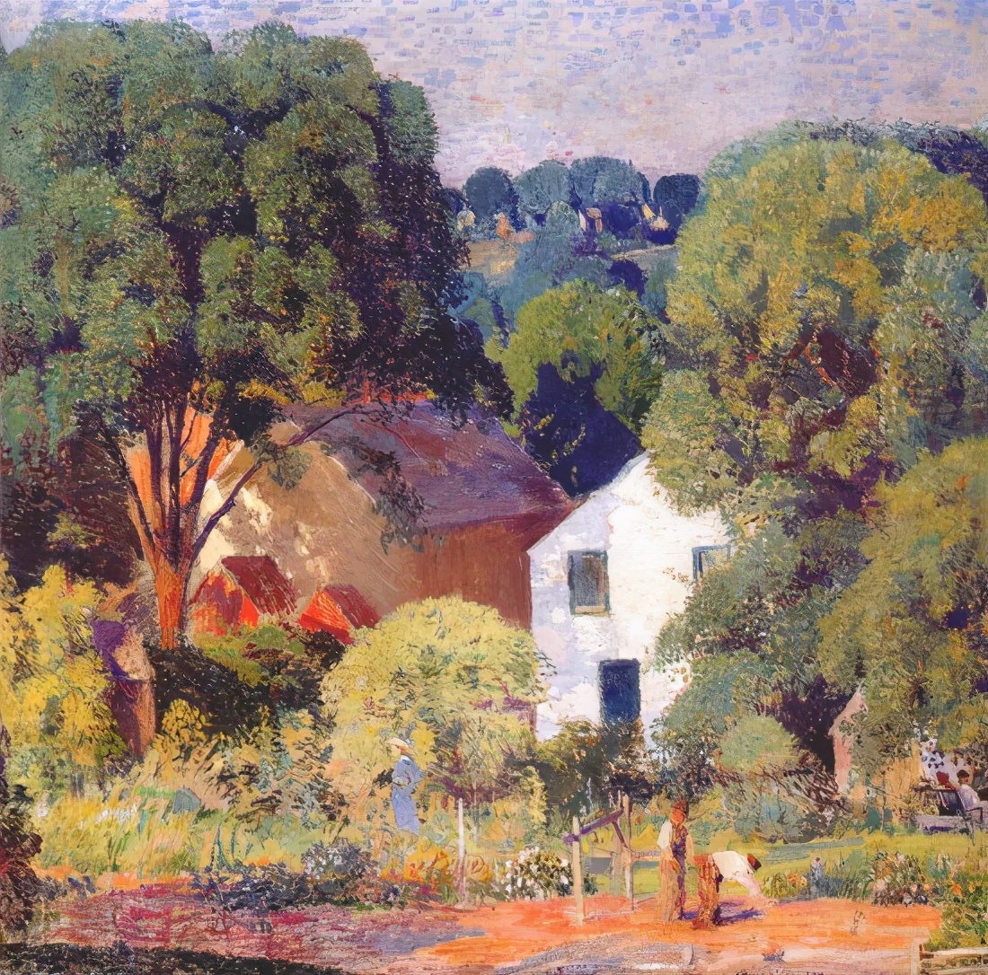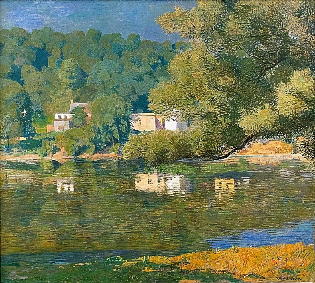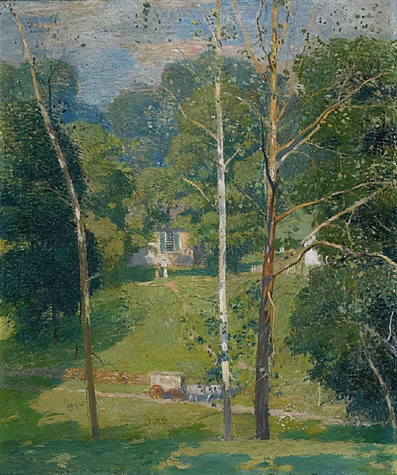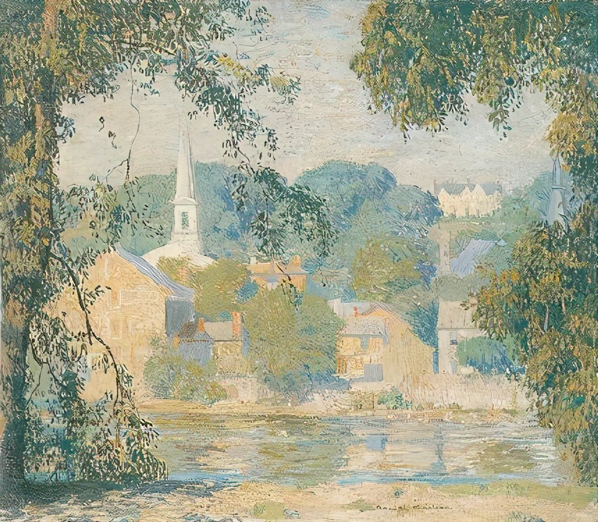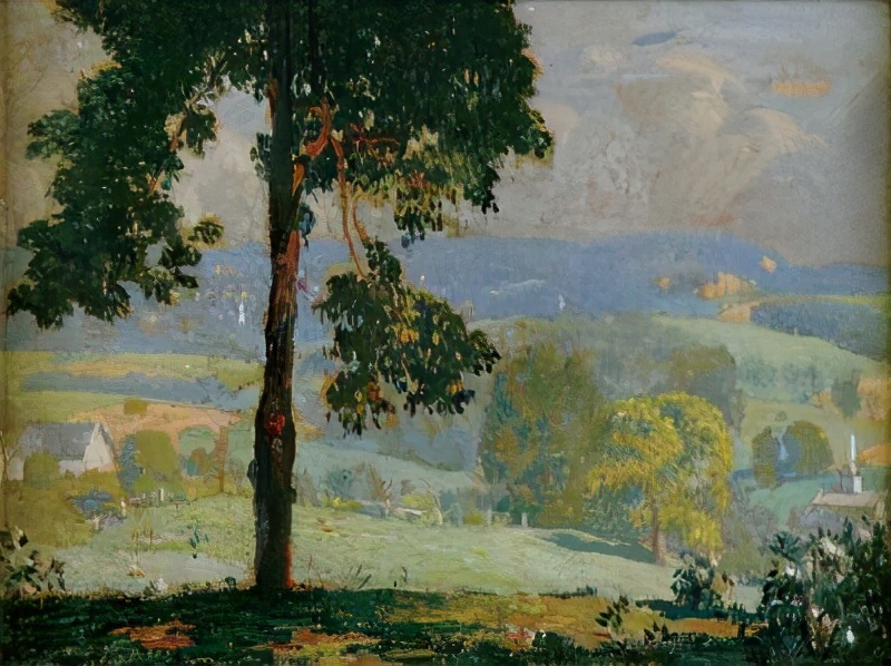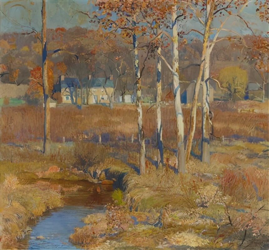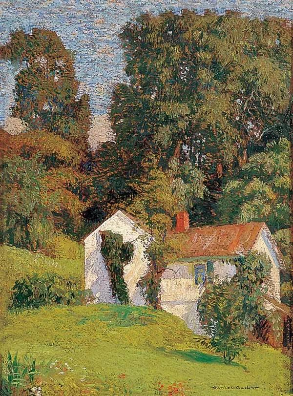 美国的印象主义的发展确实是充实了这一画派的内容与深度,不仅仅是在人物画方面,在风景画方面亦有建树。丹尼尔·加伯的乡村风情让我们回味了梵高,修拉,毕沙罗等人法国农村的那种宁静放松的韵味,他的作品似乎是在正午时分的光影效果占了多数,充满灿烂的阳光,阴影的环境色丰富微妙,尽管他的构图很满,地平线高居,似乎是密不透风,但他掩隐在树木中的房屋,多数明亮,加上明快的色调,画图不感到沉闷,总是有一种轻快的感受让人体会。