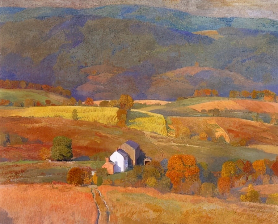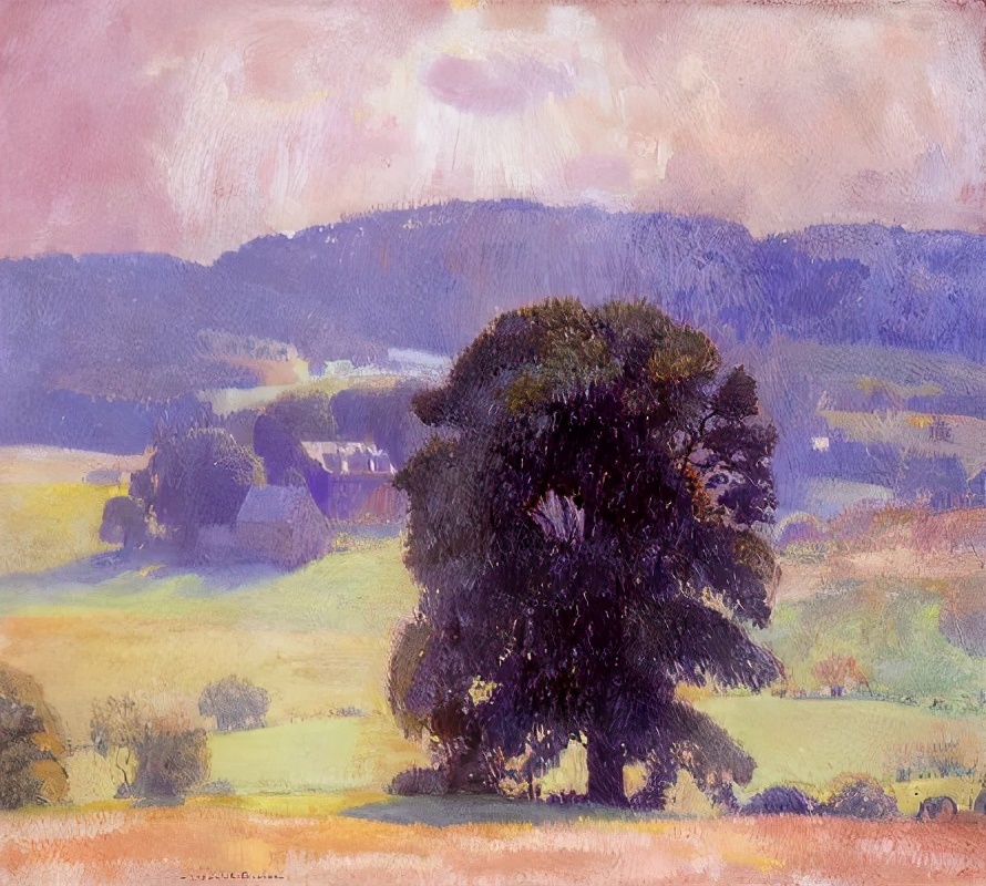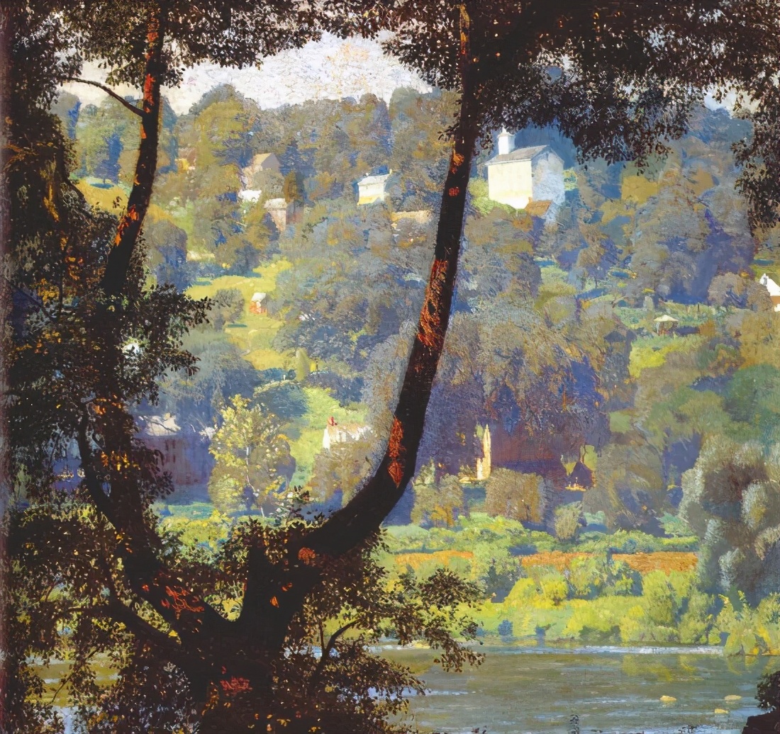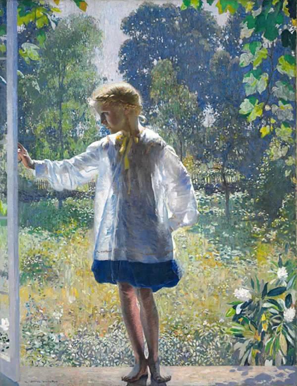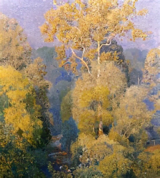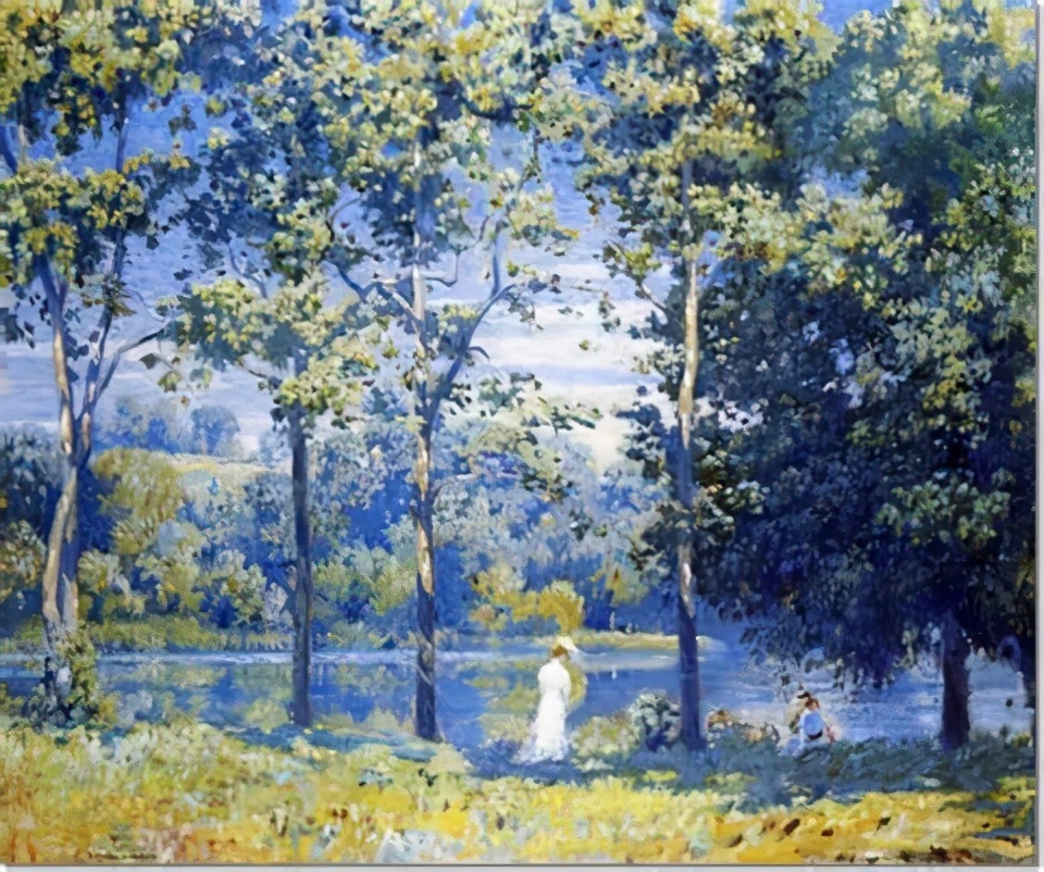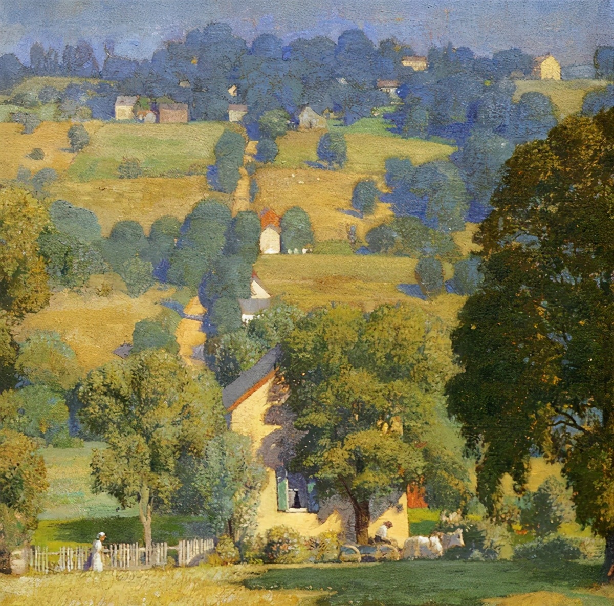 美国的印象主义的发展确实是充实了这一画派的内容与深度,不仅仅是在人物画方面,在风景画方面亦有建树。丹尼尔·加伯的乡村风情让我们回味了梵高,修拉,毕沙罗等人法国农村的那种宁静放松的韵味,他的作品似乎是在正午时分的光影效果占了多数,充满灿烂的阳光,阴影的环境色丰富微妙,尽管他的构图很满,地平线高居,似乎是密不透风,但他掩隐在树木中的房屋,多数明亮,加上明快的色调,画图不感到沉闷,总是有一种轻快的感受让人体会。