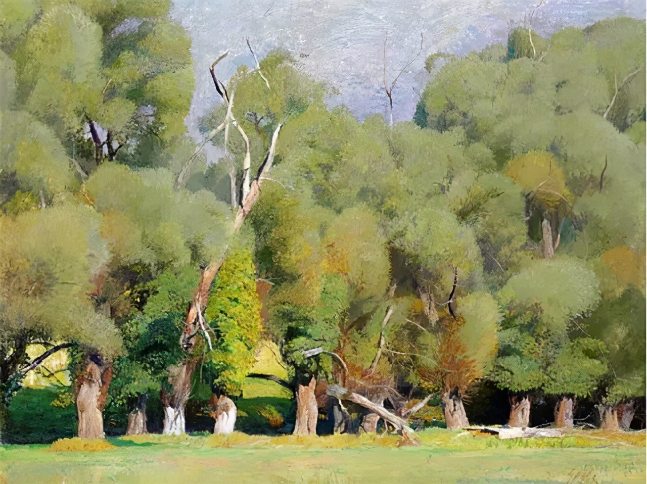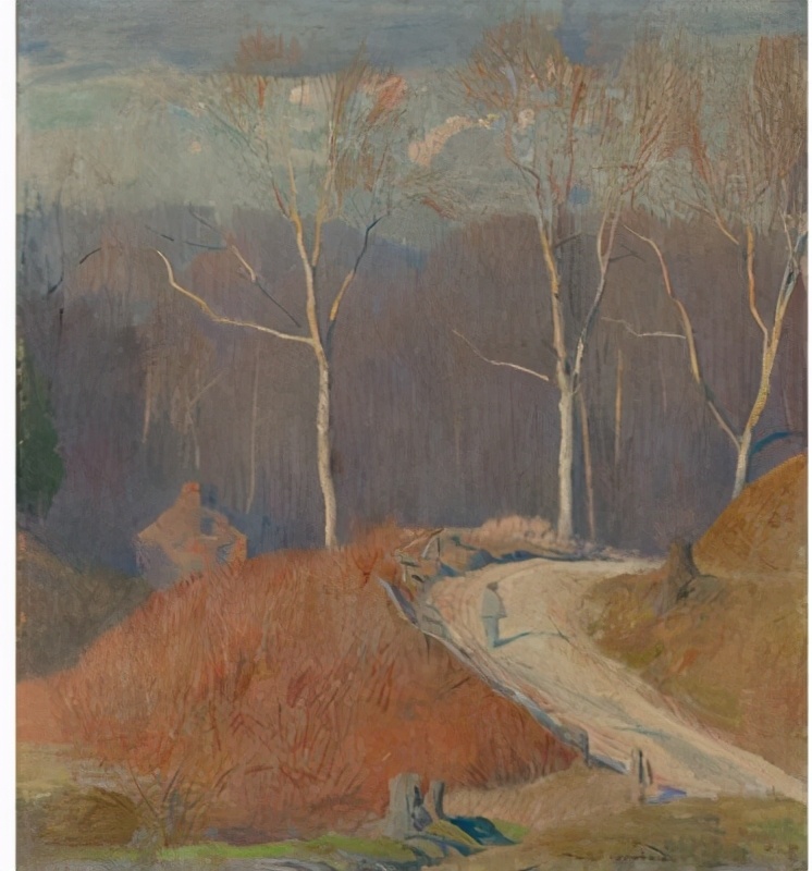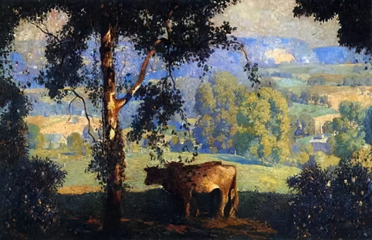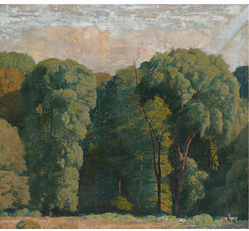 他有时会画一个佳人在林中远处,那个是柯罗最爱的构成,他有时会在树下画一头牛,这个是法国农村风景画(印象派)常常有的格调,稍远点就是追索到康斯太勃尔的作品。绘画艺术的微妙,欣赏的体会,是触类旁通的,看多了,自然也就体会一幅作品的深度,它的师承来源与借鉴对象。