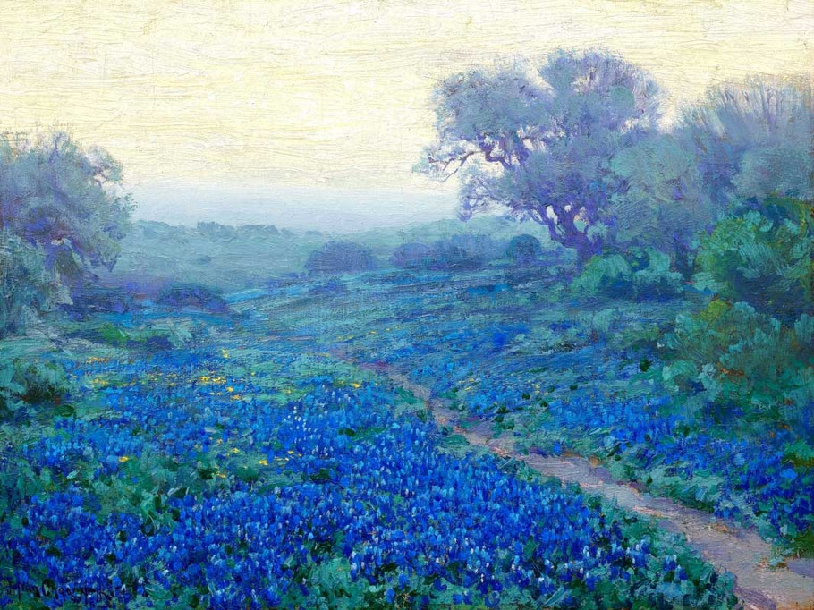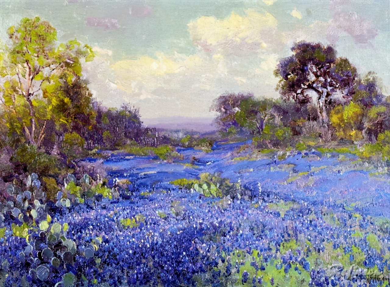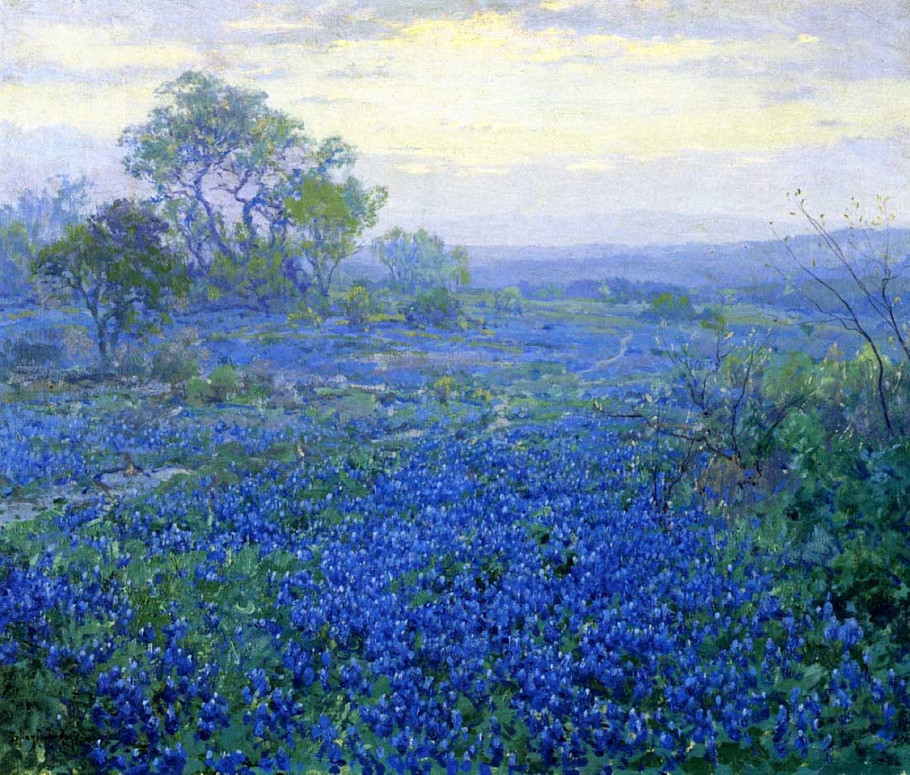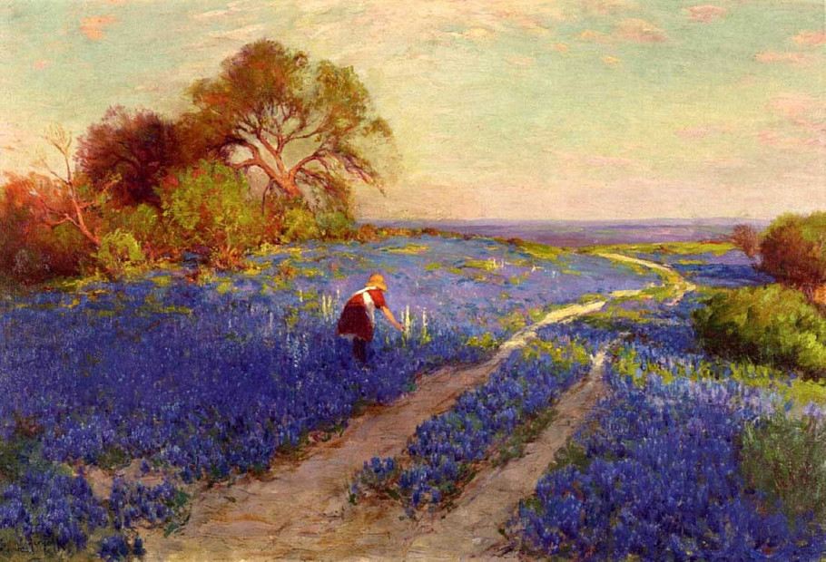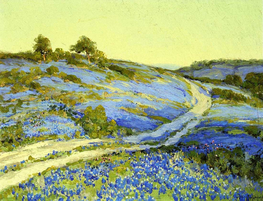 朱利安德多克(Julian Onderdonk)倾向于多用蓝色,这个应当是他心理的主体色彩,因此,他在画一幅风景画时,会选择更多有蓝色花(鸢尾花或其它蓝色的花)的场景,或者更多的是用主观颜色,而不是自然中的固有色。