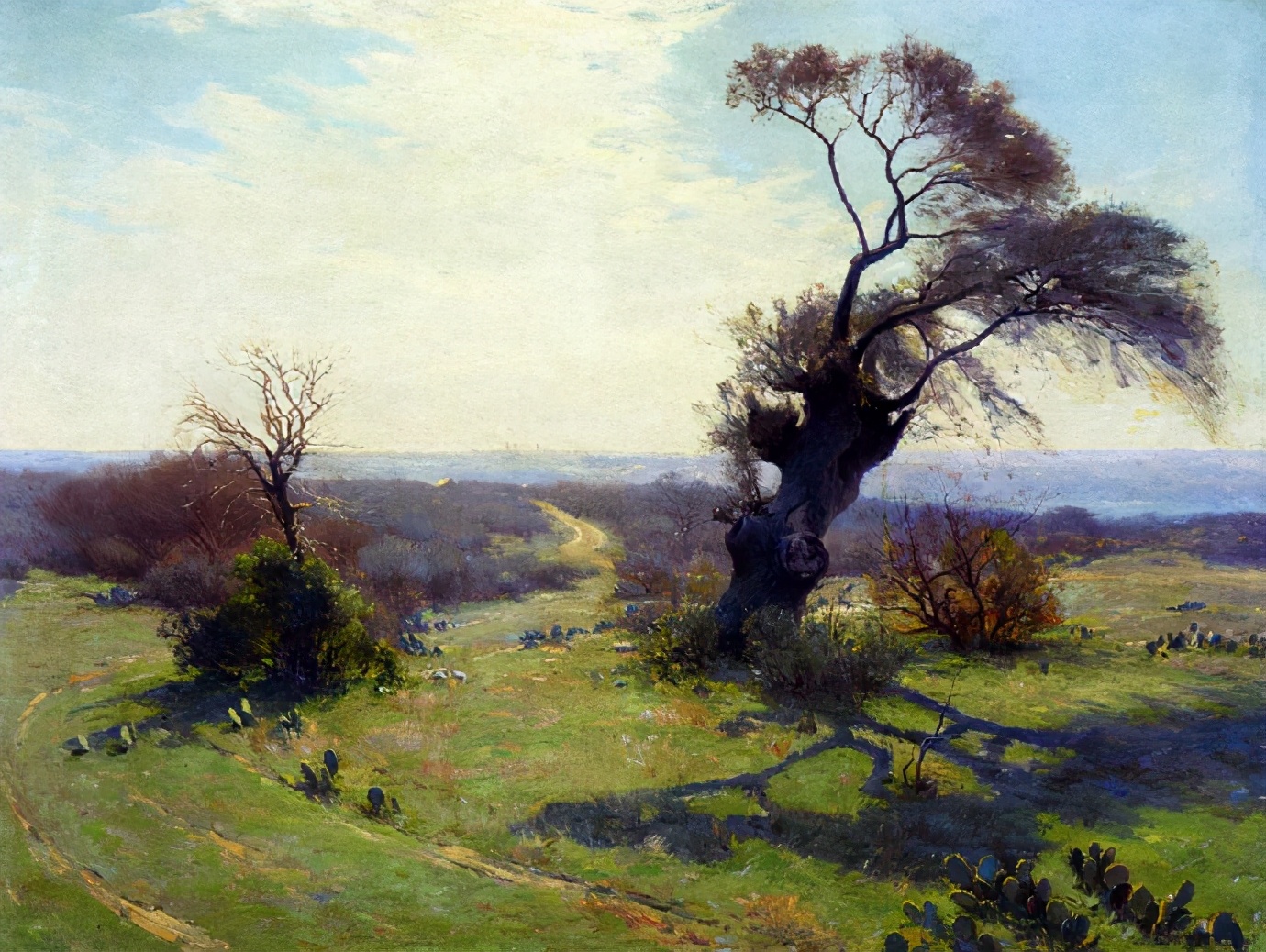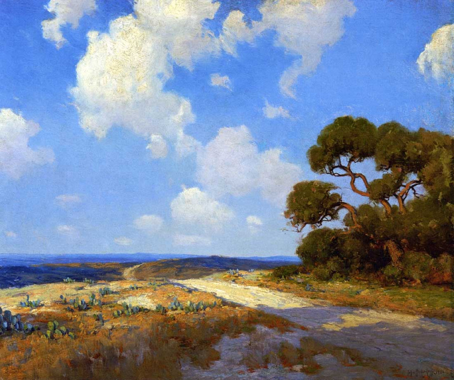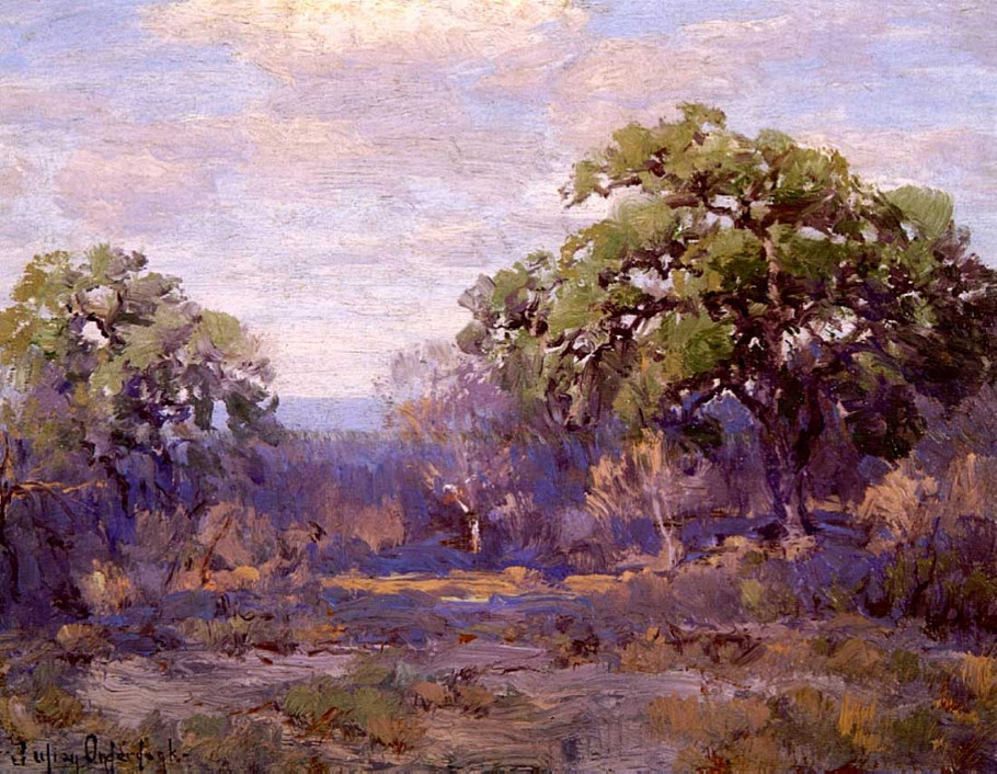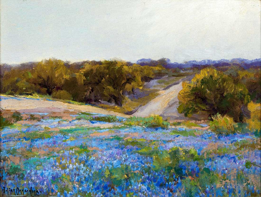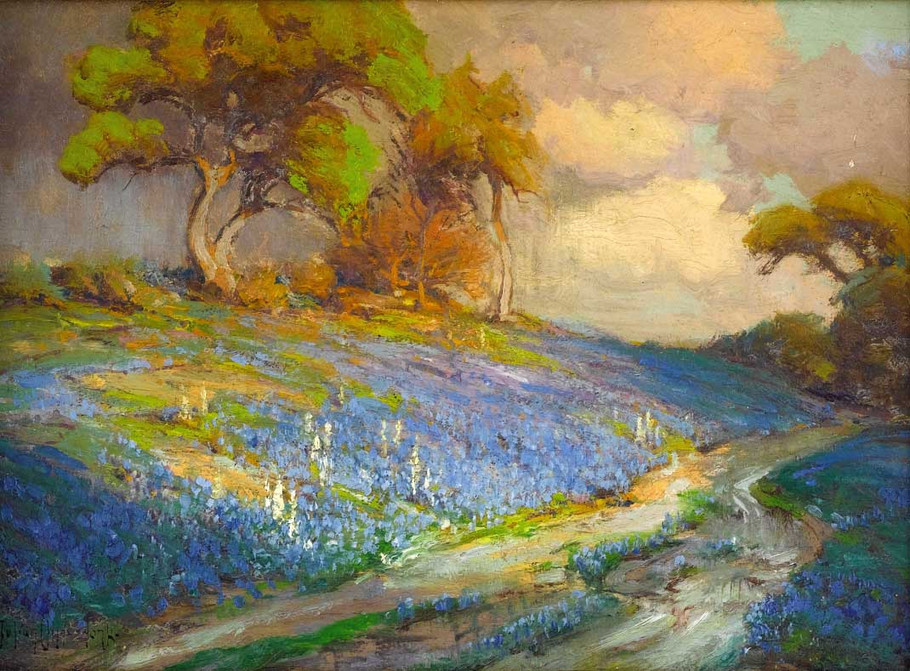 朱利安德多克(Julian Onderdonk)倾向于多用蓝色,这个应当是他心理的主体色彩,因此,他在画一幅风景画时,会选择更多有蓝色花(鸢尾花或其它蓝色的花)的场景,或者更多的是用主观颜色,而不是自然中的固有色。