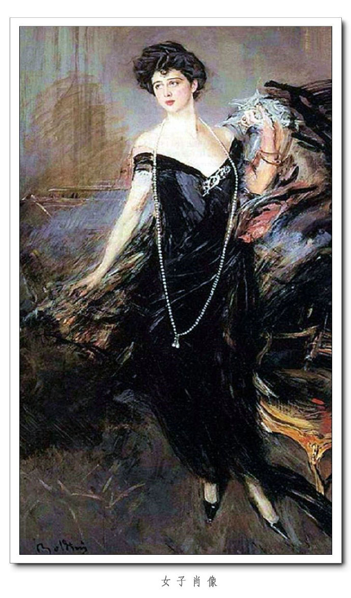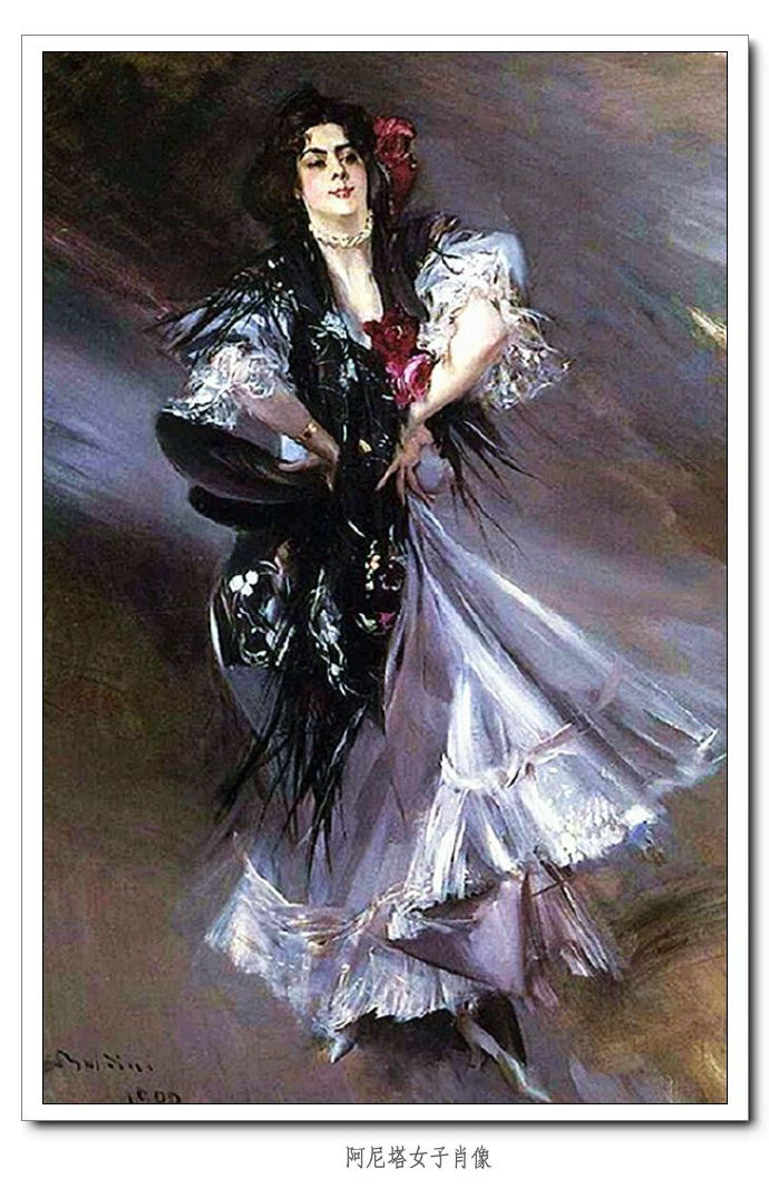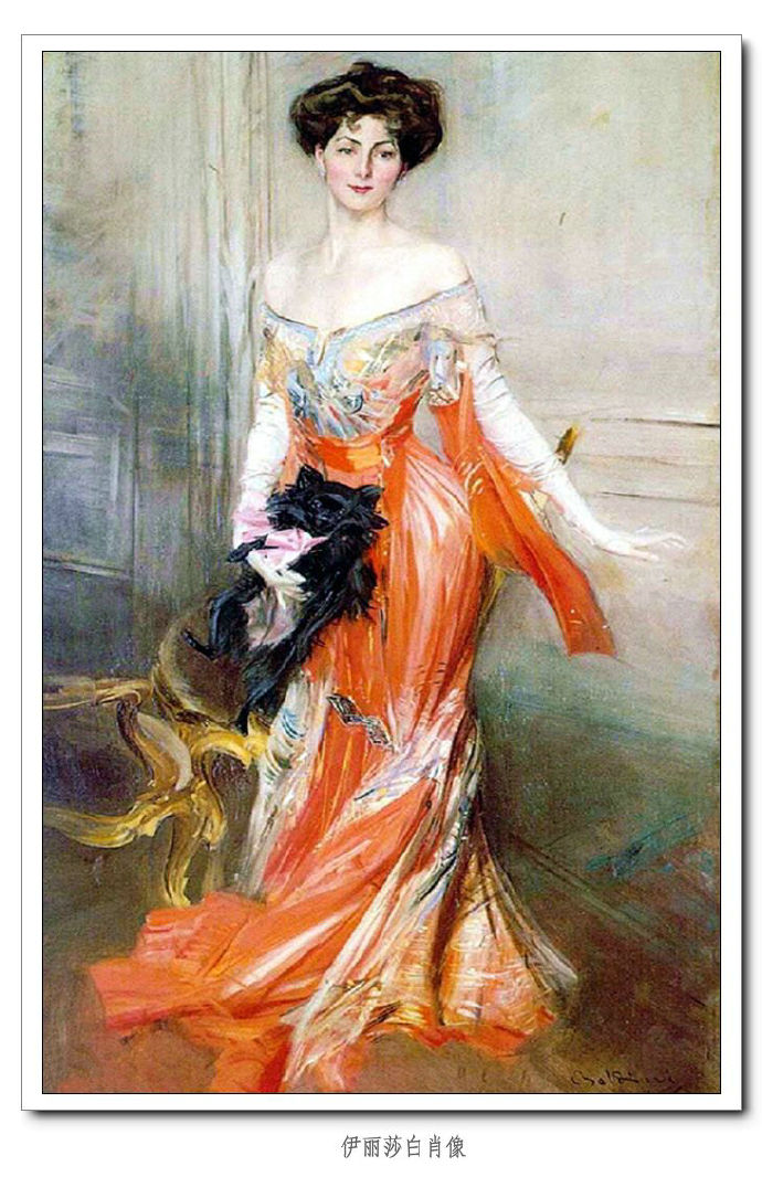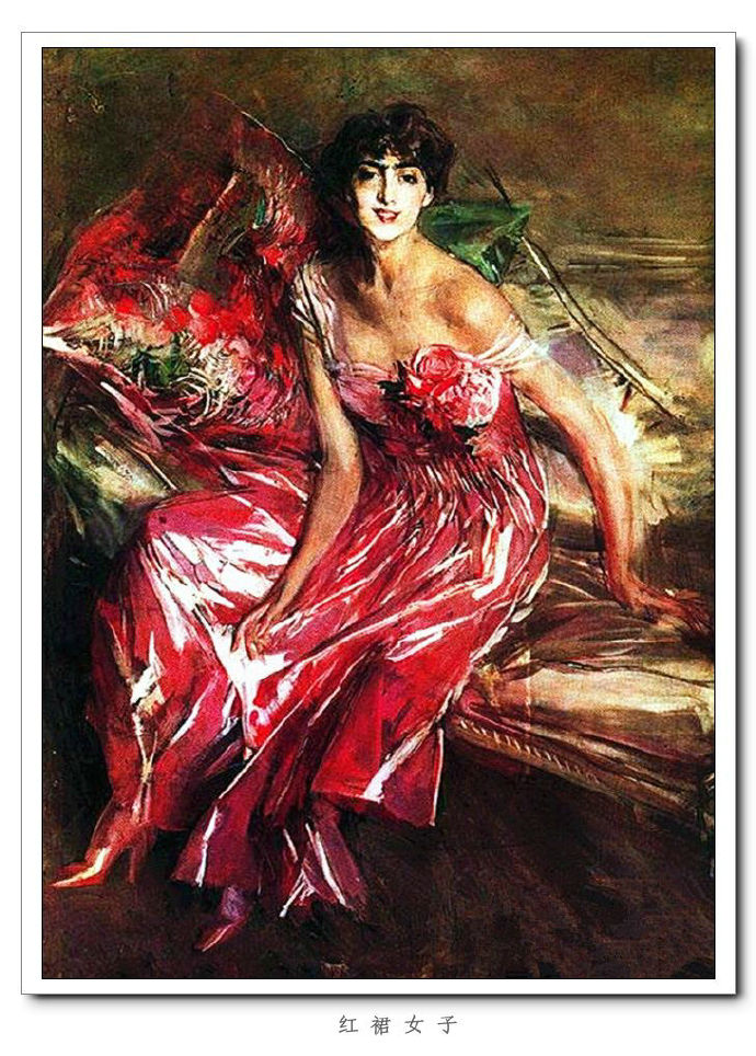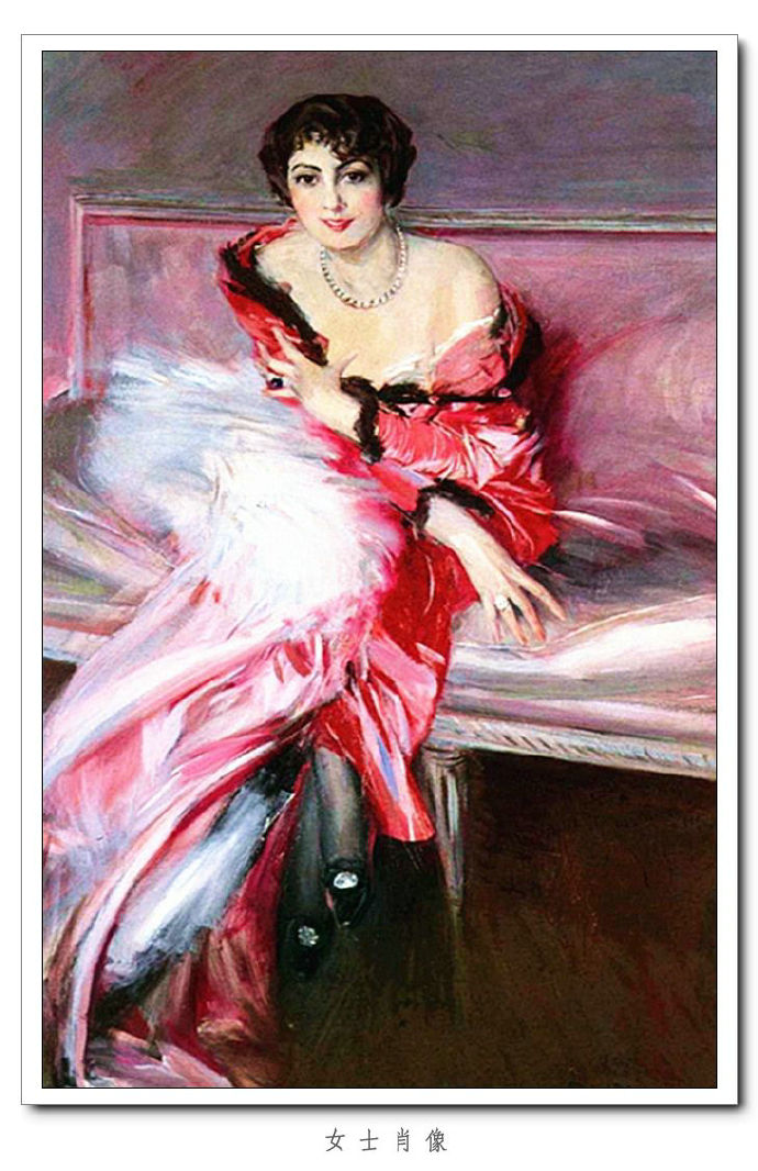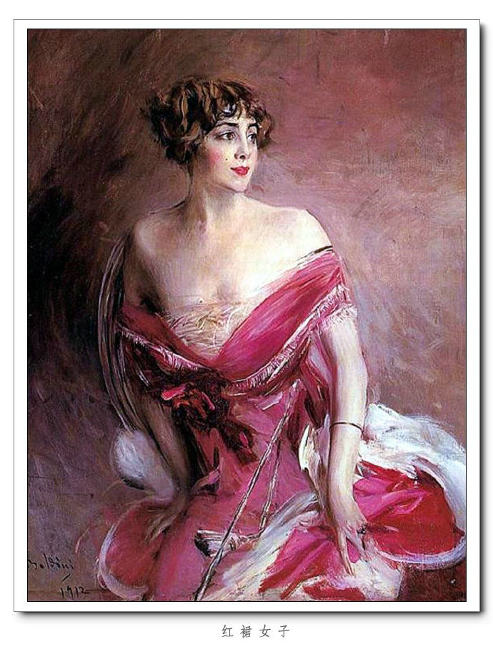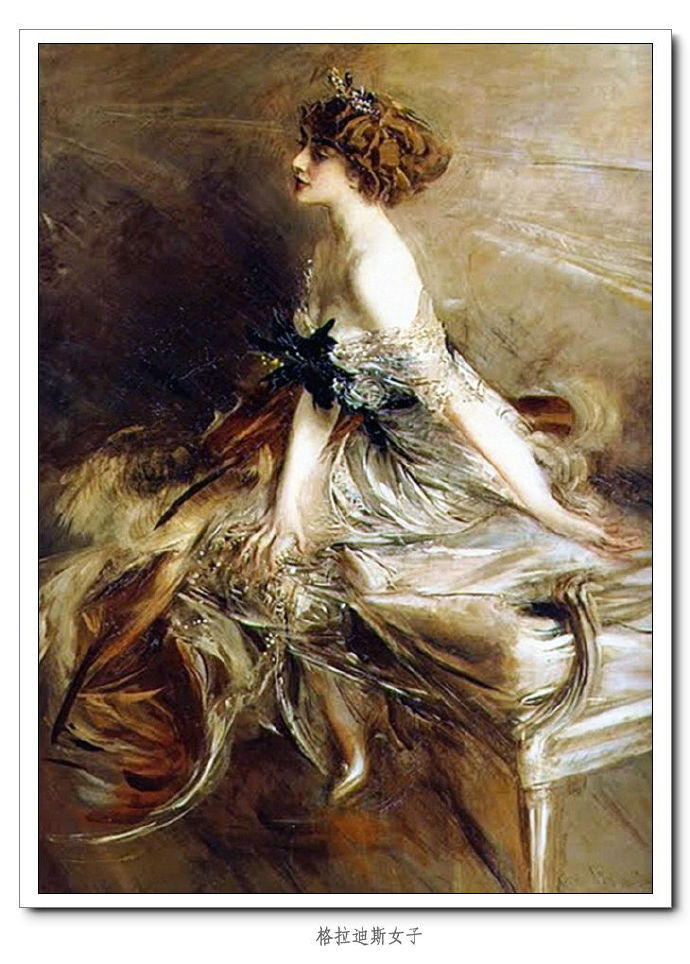 Boldini)生于意大利费拉拉,长期艺术活动在巴黎,他以画巴黎时尚性感女子为主,用笔激情奔放,往往期望展示女性四射的魅力,他的女性带有文艺复兴时期的罗马风情,看着像风尘女子,又充满贵气,对于人物的开放与收敛处理得合适。因为受印象派的影响,所以他的作品色彩丰富,但他对于造型的处理同样谨慎,对于主角用心细,背景与附加物则虚化,突出人物形象,非常具有艺术性。不同的民族进入印象主义的洗礼,展示的风姿有相近的,亦能展示独特的个性。这样,请欣赏大师的佳作吧!