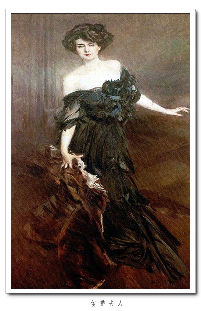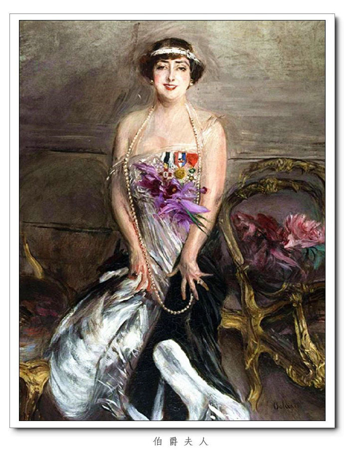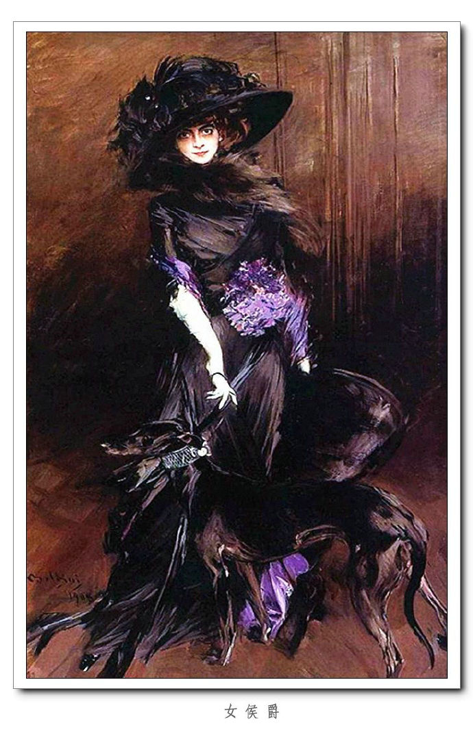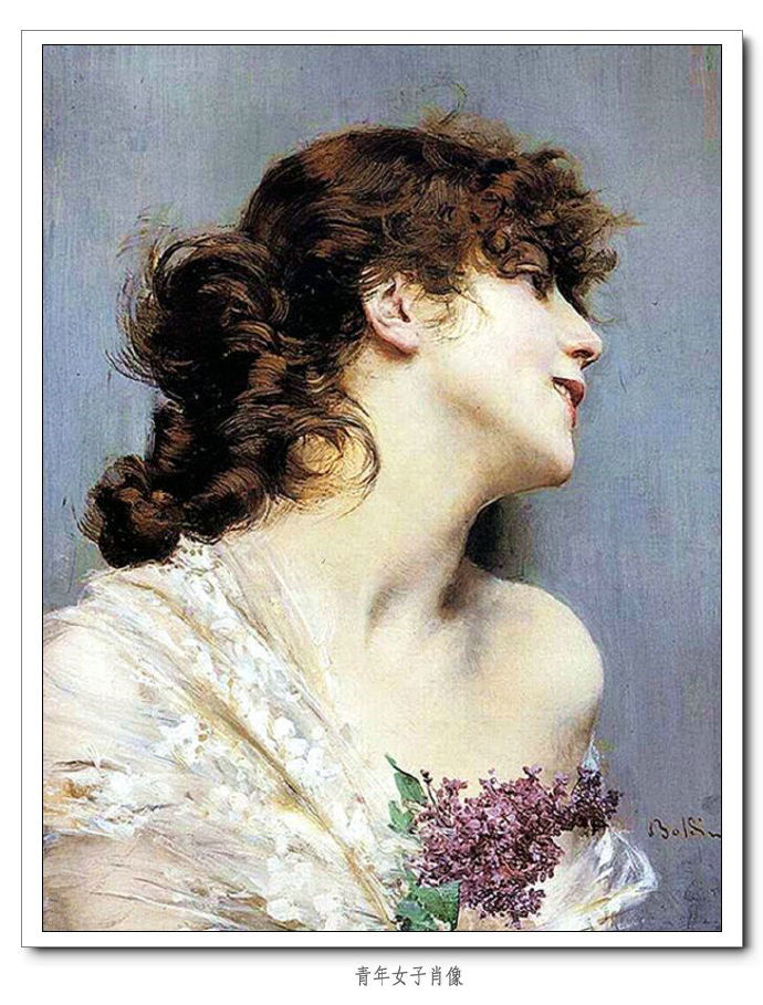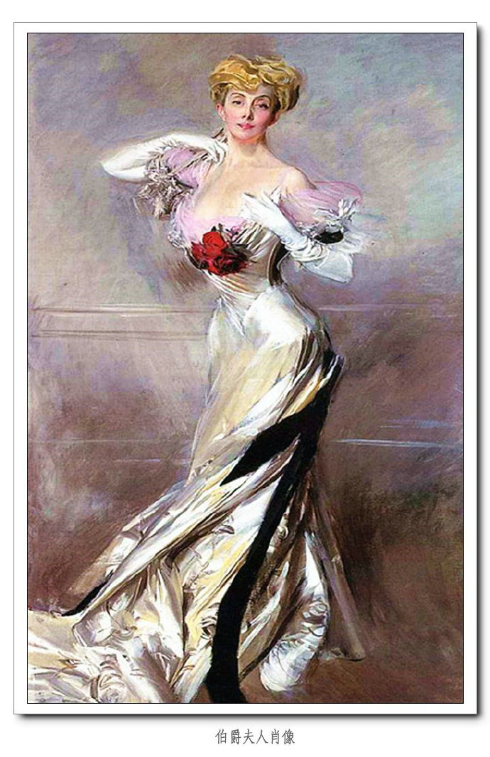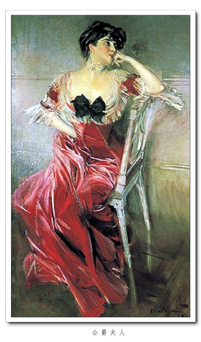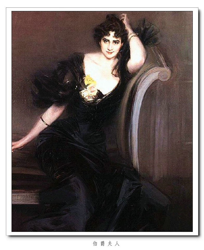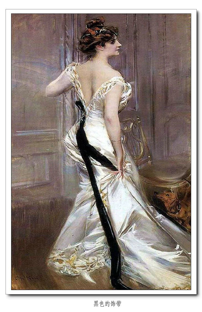 Boldini)生于意大利费拉拉,长期艺术活动在巴黎,他以画巴黎时尚性感女子为主,用笔激情奔放,往往期望展示女性四射的魅力,他的女性带有文艺复兴时期的罗马风情,看着像风尘女子,又充满贵气,对于人物的开放与收敛处理得合适。因为受印象派的影响,所以他的作品色彩丰富,但他对于造型的处理同样谨慎,对于主角用心细,背景与附加物则虚化,突出人物形象,非常具有艺术性。不同的民族进入印象主义的洗礼,展示的风姿有相近的,亦能展示独特的个性。这样,请欣赏大师的佳作吧!