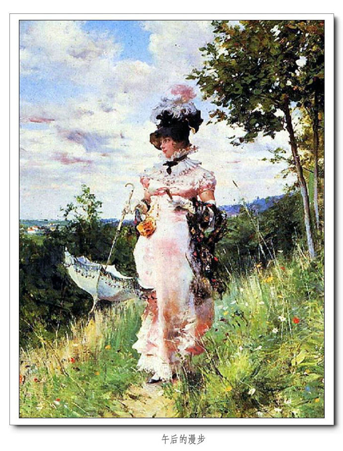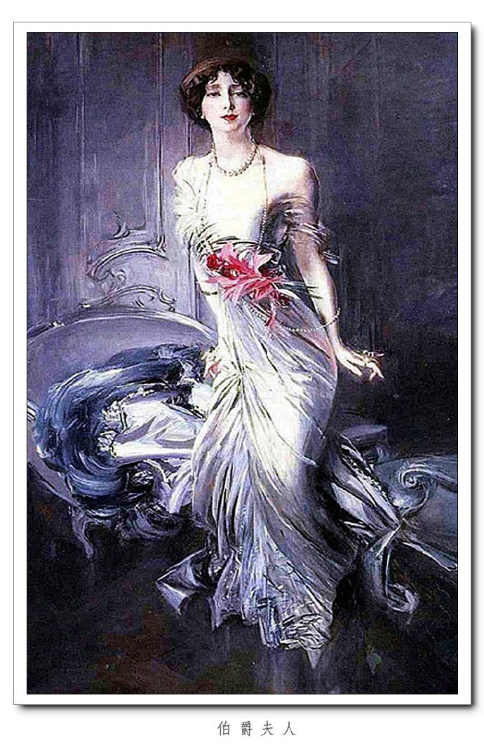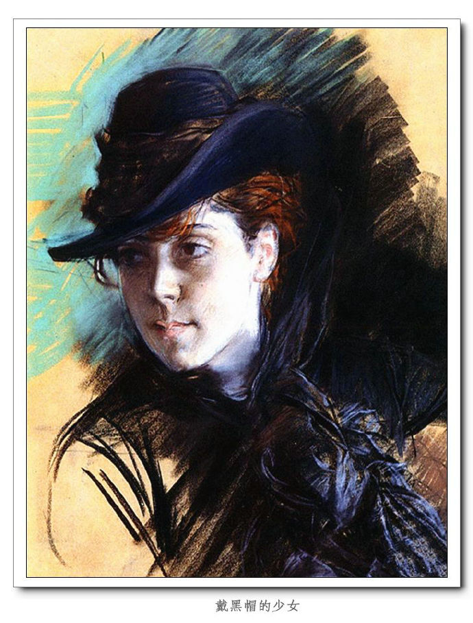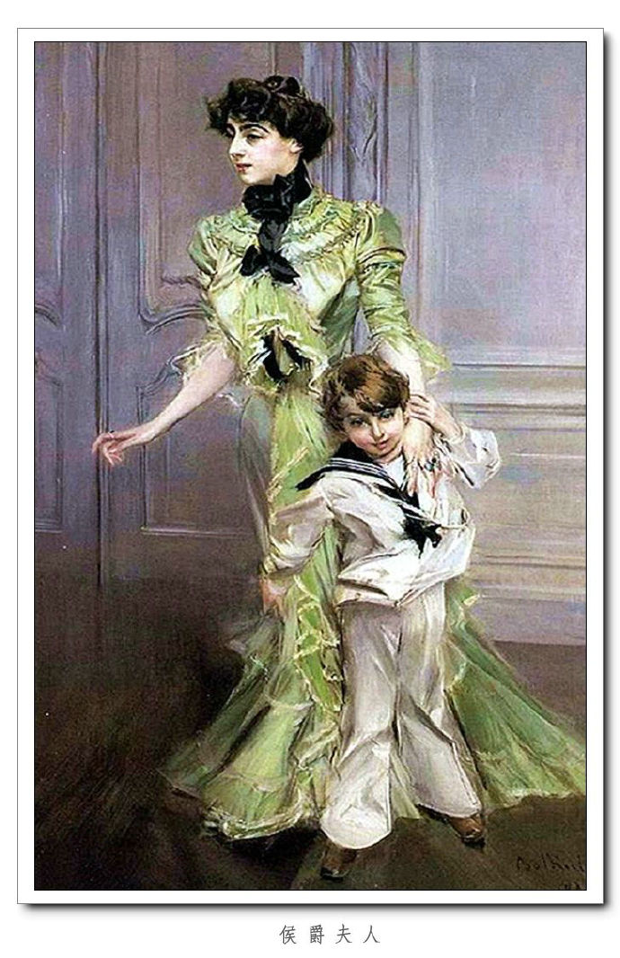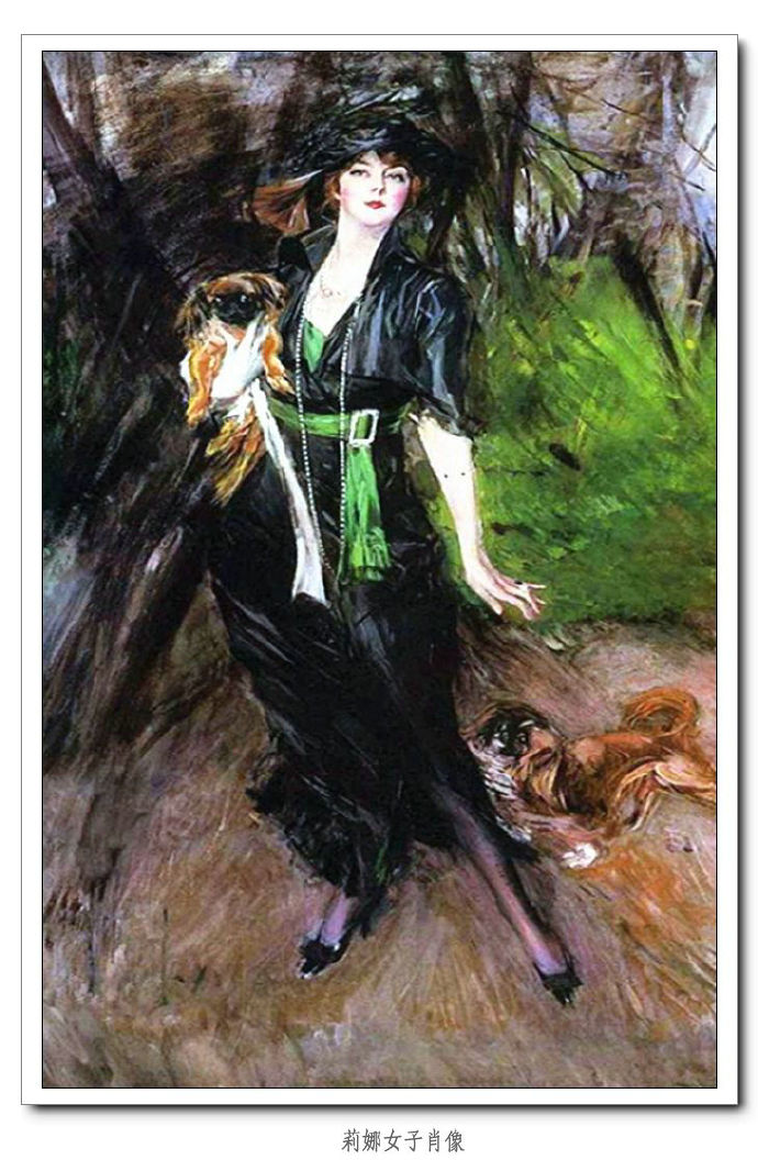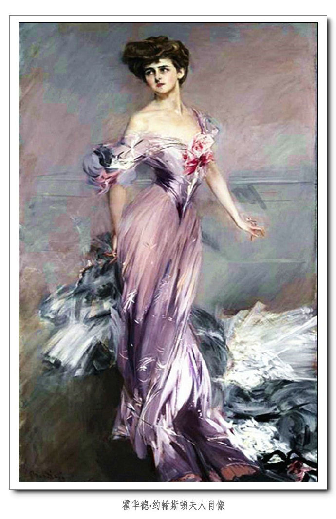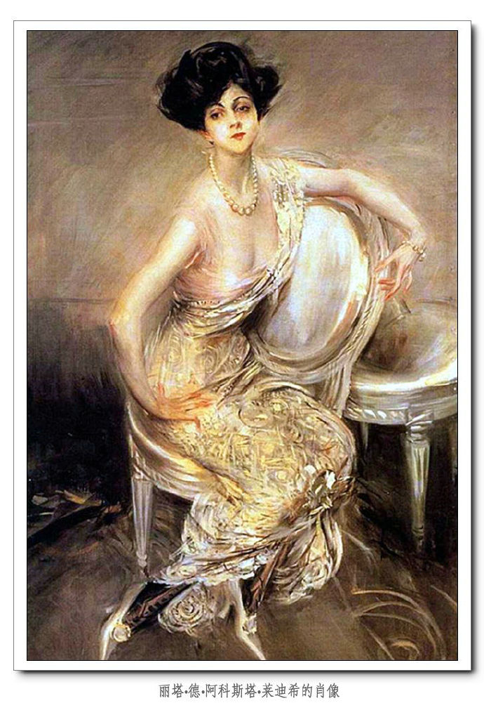 Boldini)生于意大利费拉拉,长期艺术活动在巴黎,他以画巴黎时尚性感女子为主,用笔激情奔放,往往期望展示女性四射的魅力,他的女性带有文艺复兴时期的罗马风情,看着像风尘女子,又充满贵气,对于人物的开放与收敛处理得合适。因为受印象派的影响,所以他的作品色彩丰富,但他对于造型的处理同样谨慎,对于主角用心细,背景与附加物则虚化,突出人物形象,非常具有艺术性。不同的民族进入印象主义的洗礼,展示的风姿有相近的,亦能展示独特的个性。这样,请欣赏大师的佳作吧!