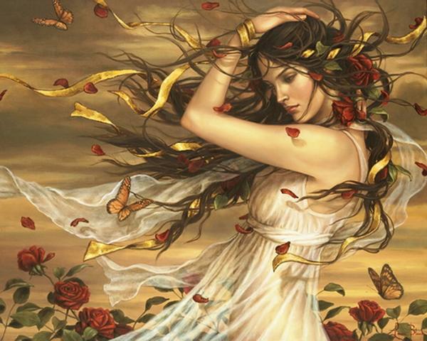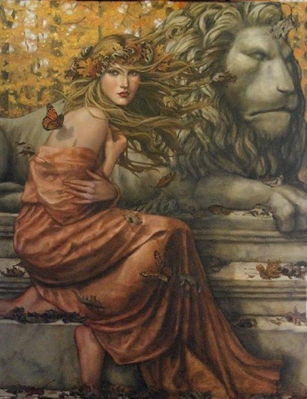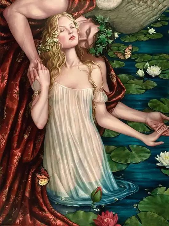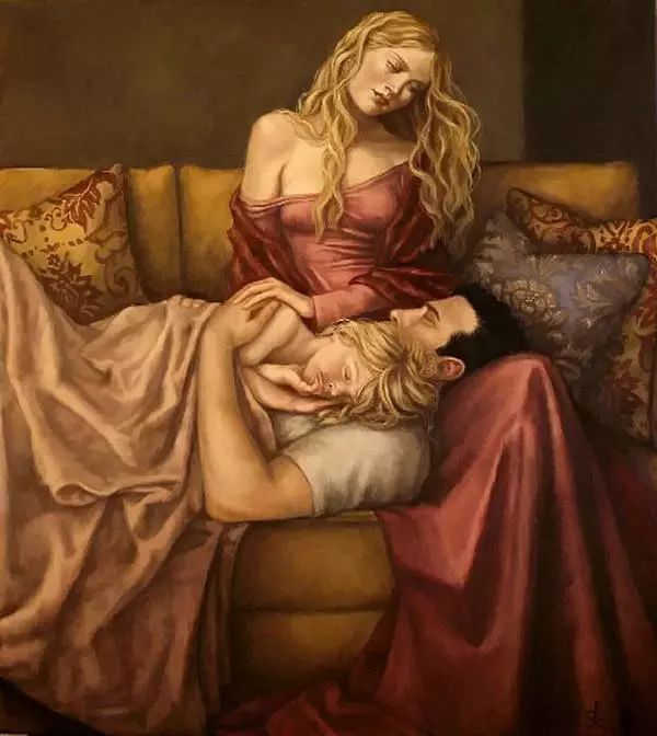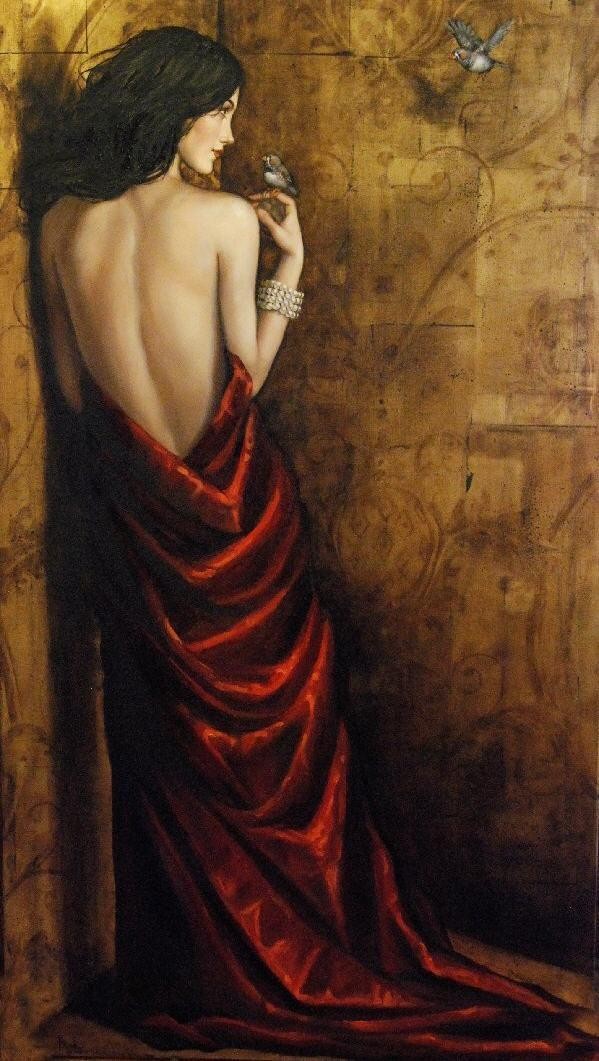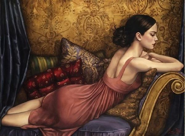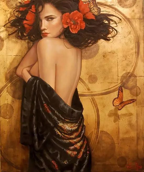 欧洲的唯美主义绘画,从文艺复兴中发源,我们看到的波提切利的作品,拉菲尔的作品,还有英国前拉菲尔派的作品,都是充满唯美的意味。美国女画家LauriBlank传承了这一风情,她的画面集聚诸多美的意象,形成一种媚与丽的画面,这种画面往往是用鲜花,蝴蝶,飞鸟,孔雀的羽毛诸多美好的意象与佳人的造型融合无间,这种刻意追求美与华丽的意趣,与自然生活现实是有相当的距离的,它是艺术家铸造的一个梦境,当然这种梦境是有文学性的:罗密欧,朱丽叶,月光下的爱情,反映现代画家的怀旧与对于传统的执着,不仅仅是的艺术的形式,还有它的文学性,对于传统文学流传的故事的题材的坚持。