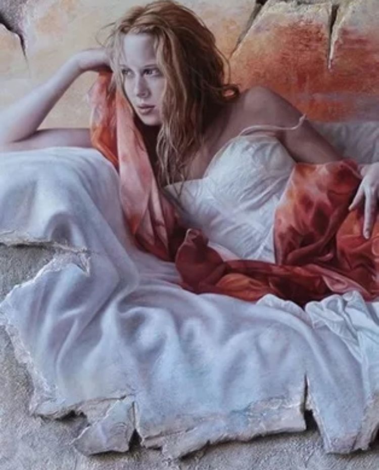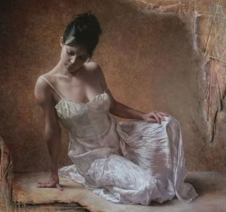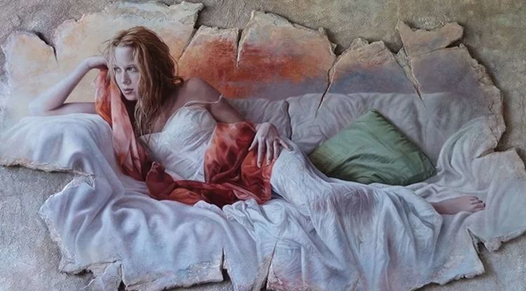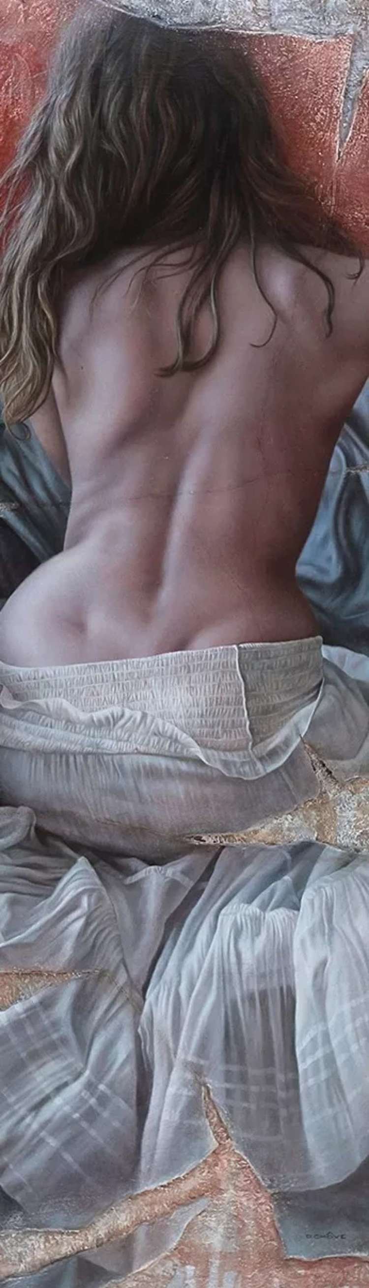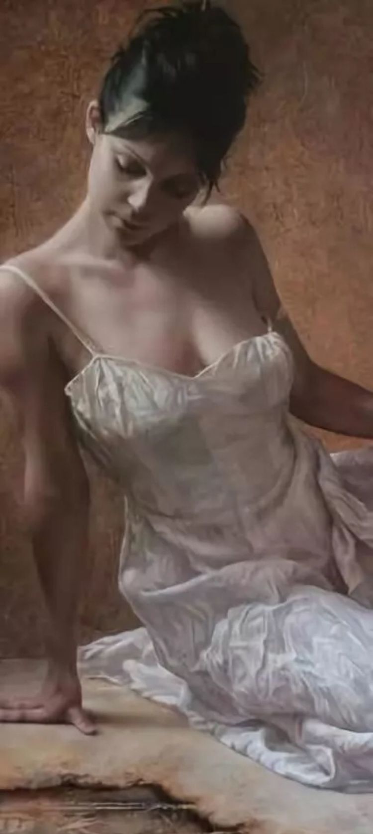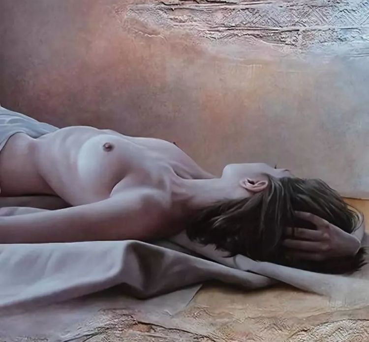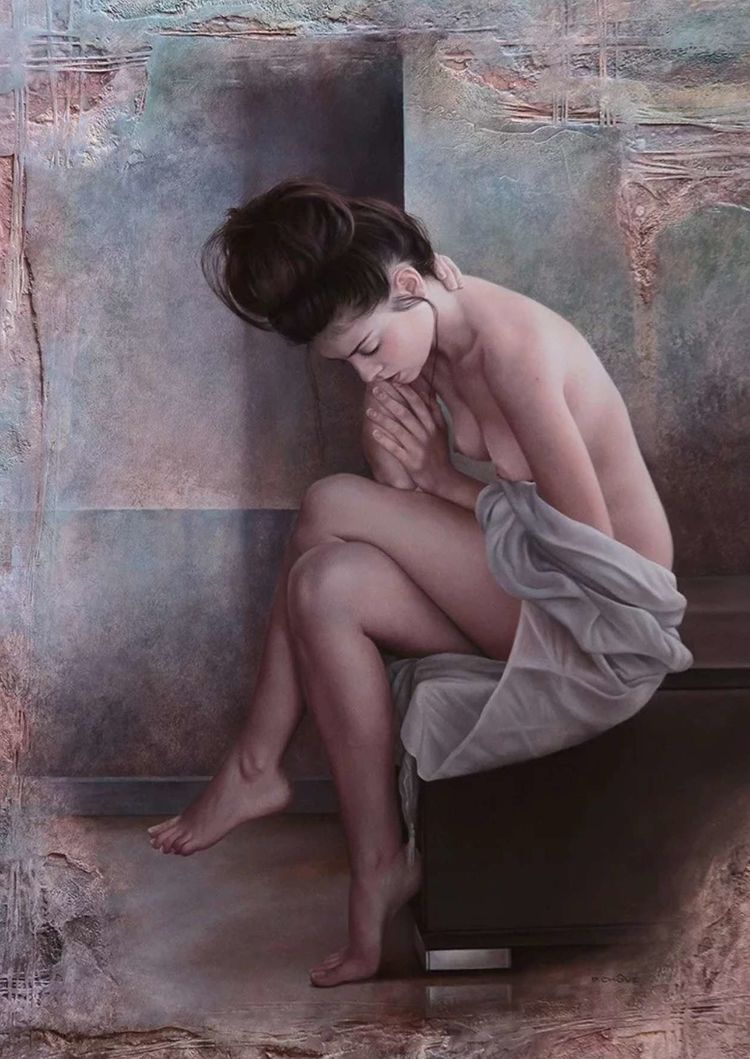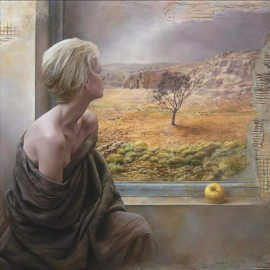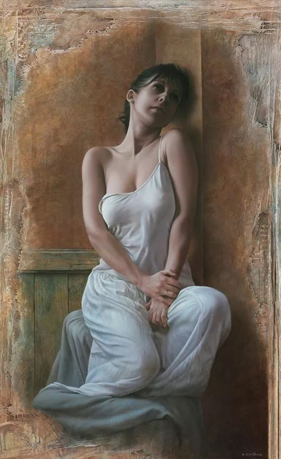 1655年法国科学家帕斯卡写到:“人只不过是一株芦苇,本质上是最脆弱的东西,但他是一株会思考的芦苇。……所以我们所有的尊严都在于思考……通过思考,我们理解世界。”。作为法国艺术家的帕斯卡·乔夫 (1968年--)就是会思考的人,尽管他把对象画得很具象,很精确,很细腻,但是,我们不觉得每一幅是照片,相反地,我们感觉到一种古悠的梦境,所有的对象,主要是人体,置身于一个荒古的坏墙前,淡化了现实的真实情形,而进入一个需要沉思的情境中,他的古老的墙体,是一种超越时空的载体,而且这种载体本身,具备斑驳残缺的美,而且还有人文的元素,比如一幅古风的风景油画,呈现多重的时光空间。在这种背景下的前景的人物越真实,越细腻,也越能显示出绘画作品的深度与艺术价值。过分惊叹他的匠心,细节的精雕,不应当是画者的本意,而是感觉色调和谐的古质风情的整个情境,思考它的隐含意味。