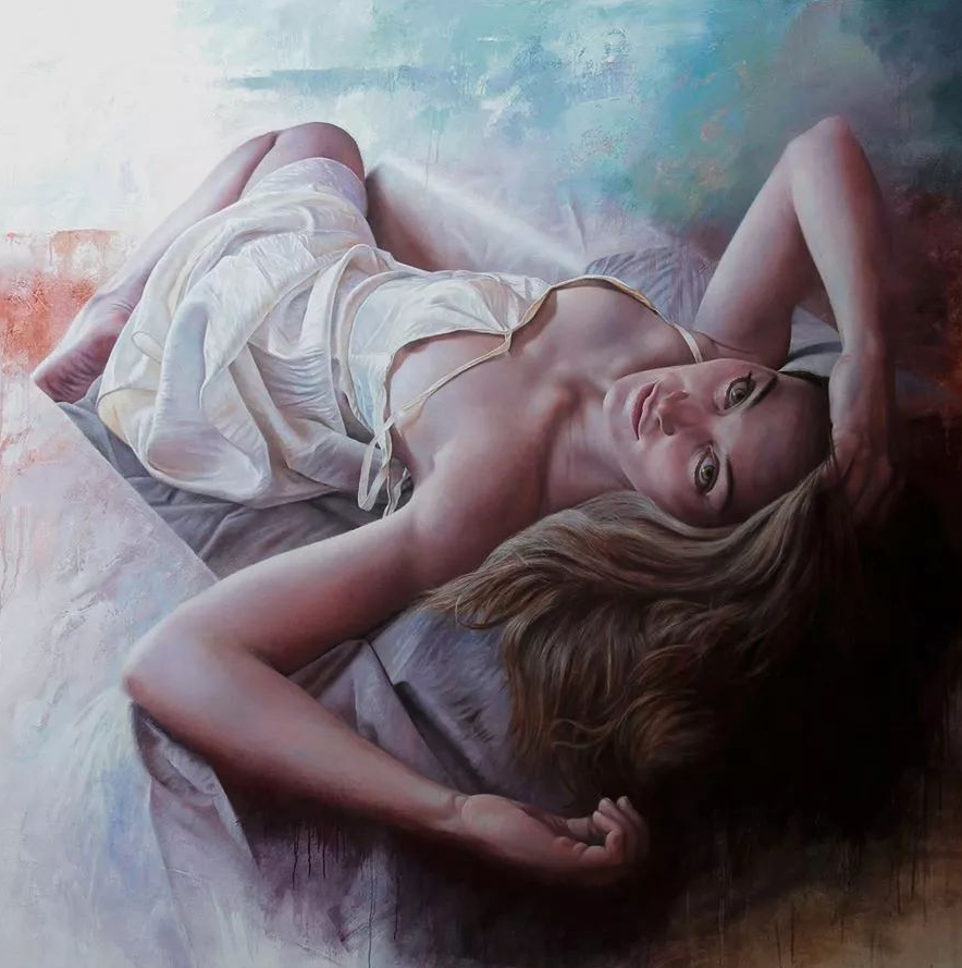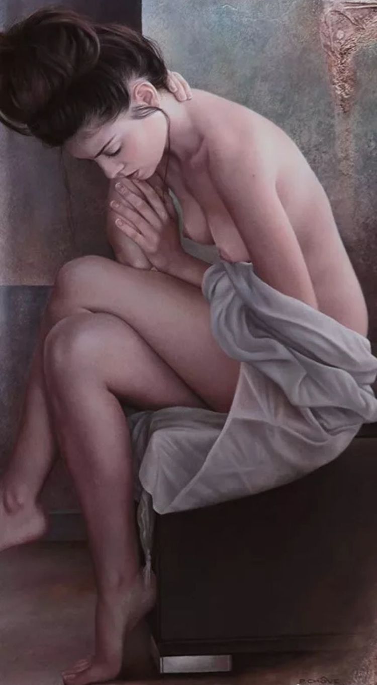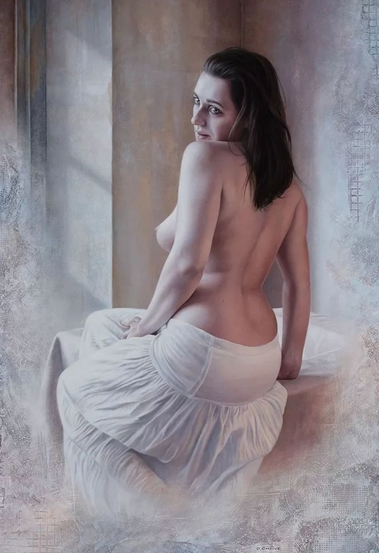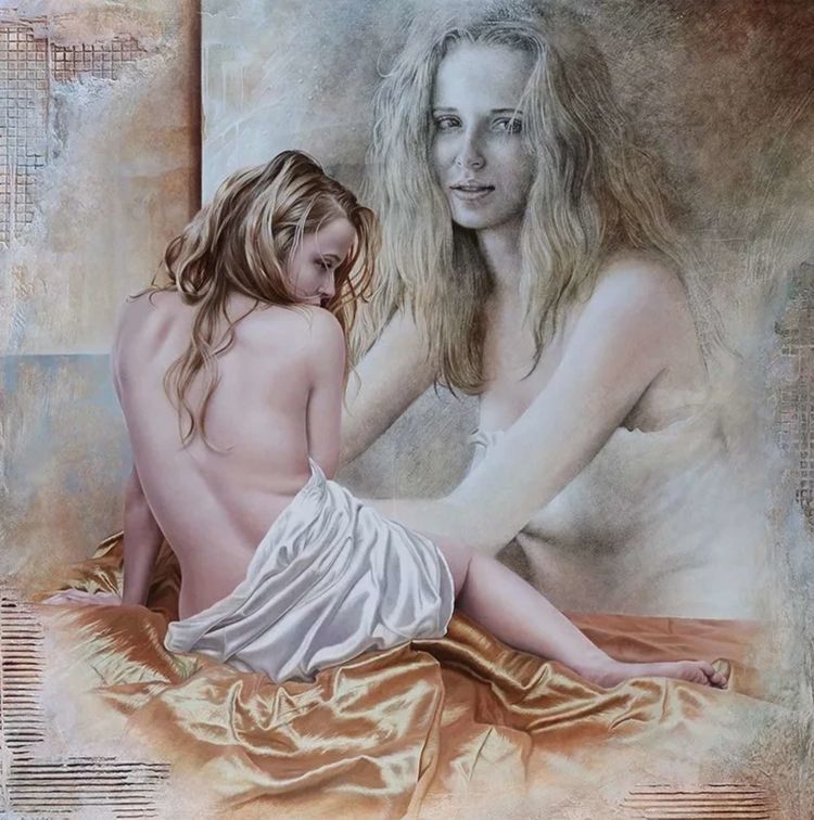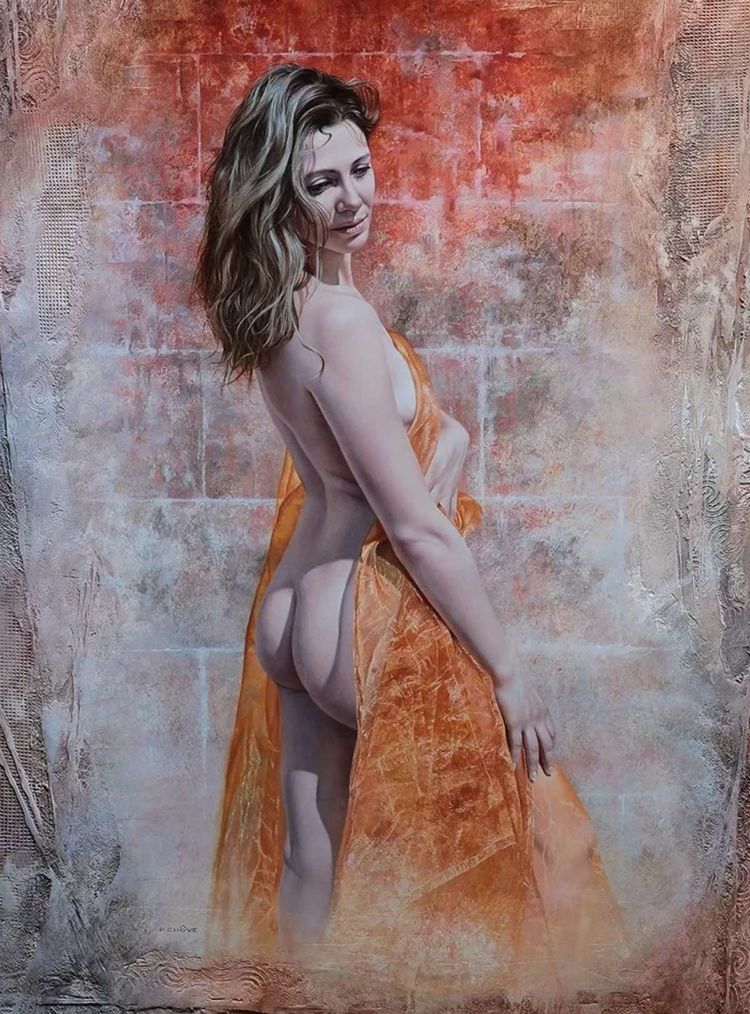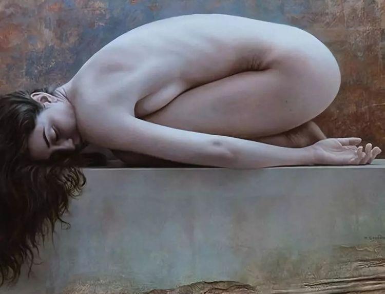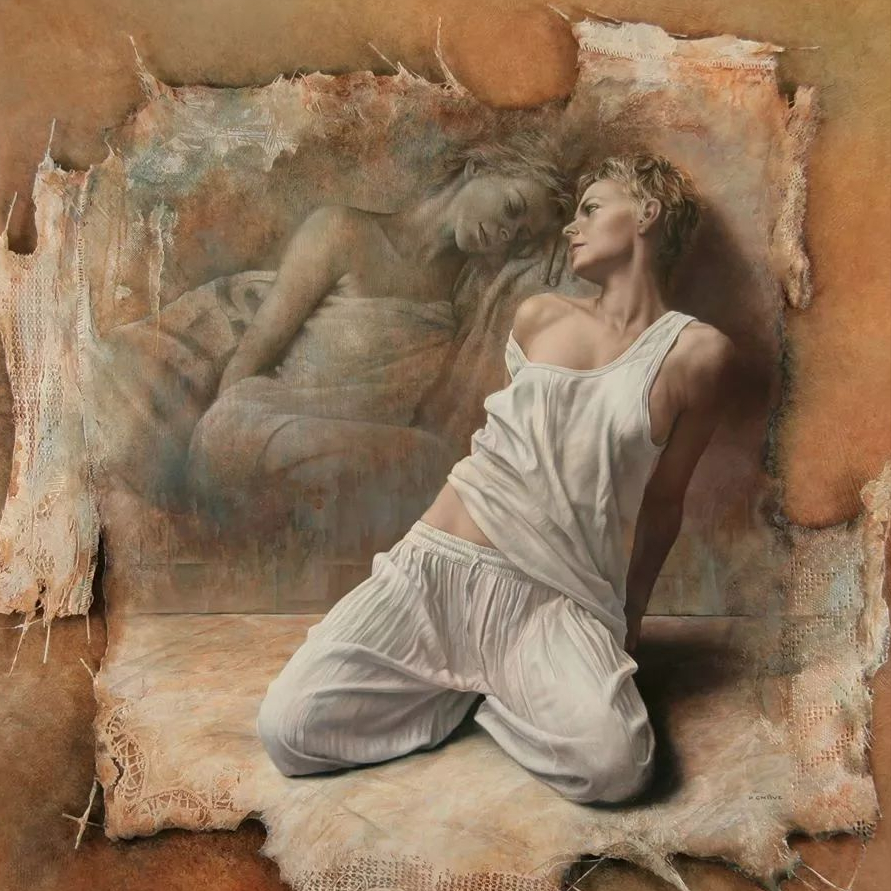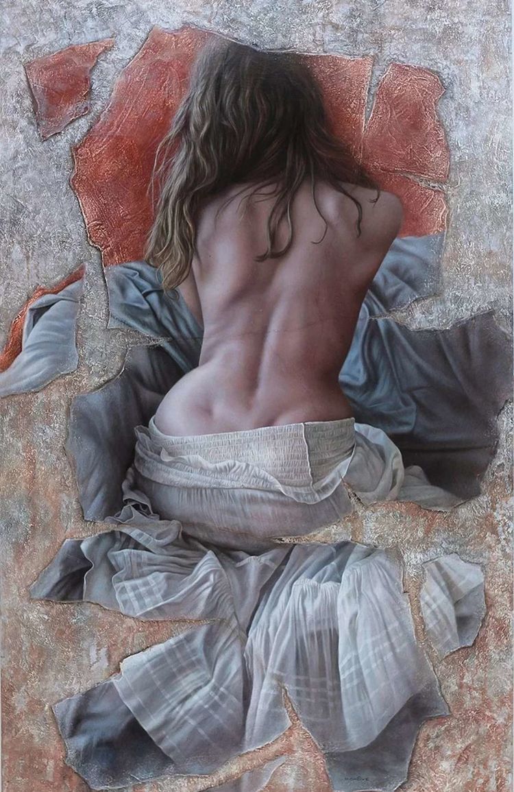 1655年法国科学家帕斯卡写到:“人只不过是一株芦苇,本质上是最脆弱的东西,但他是一株会思考的芦苇。……所以我们所有的尊严都在于思考……通过思考,我们理解世界。”。作为法国艺术家的帕斯卡·乔夫 (1968年--)就是会思考的人,尽管他把对象画得很具象,很精确,很细腻,但是,我们不觉得每一幅是照片,相反地,我们感觉到一种古悠的梦境,所有的对象,主要是人体,置身于一个荒古的坏墙前,淡化了现实的真实情形,而进入一个需要沉思的情境中,他的古老的墙体,是一种超越时空的载体,而且这种载体本身,具备斑驳残缺的美,而且还有人文的元素,比如一幅古风的风景油画,呈现多重的时光空间。在这种背景下的前景的人物越真实,越细腻,也越能显示出绘画作品的深度与艺术价值。过分惊叹他的匠心,细节的精雕,不应当是画者的本意,而是感觉色调和谐的古质风情的整个情境,思考它的隐含意味。