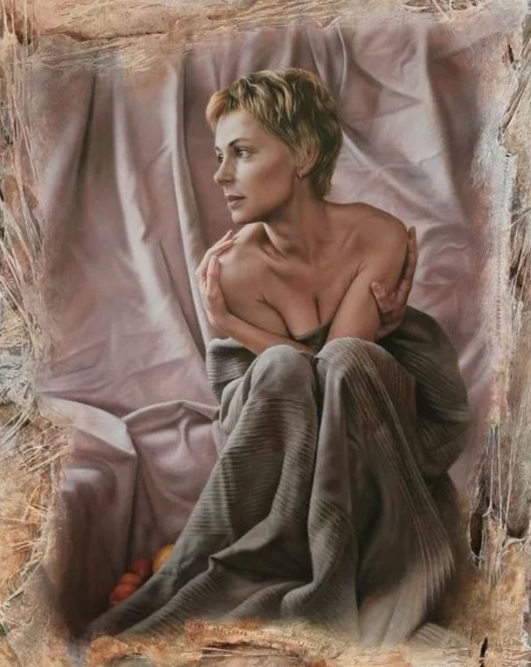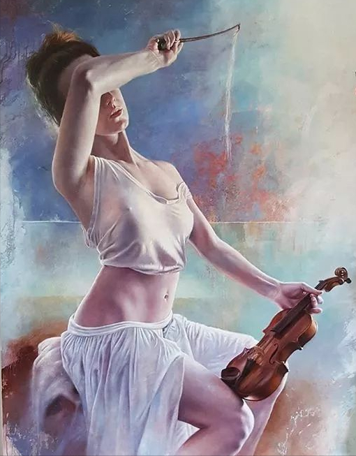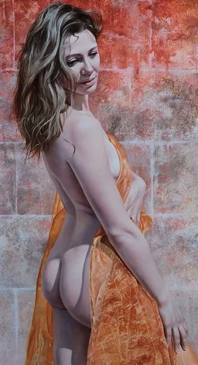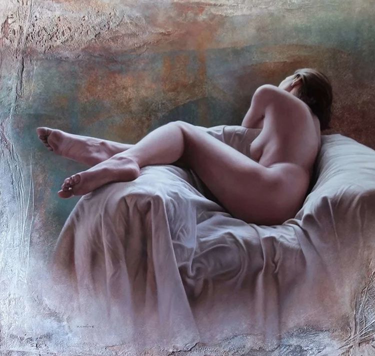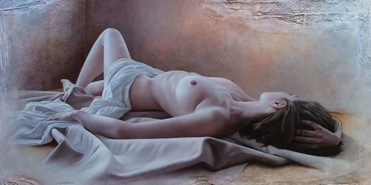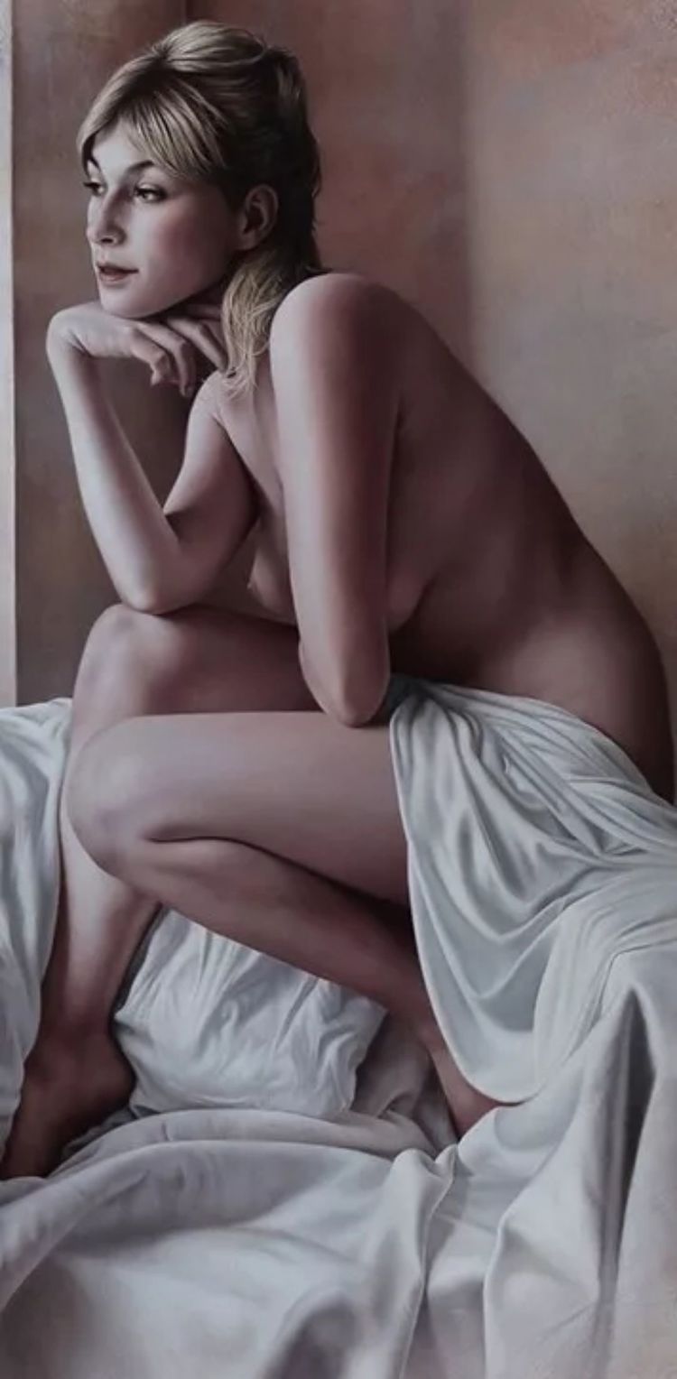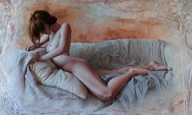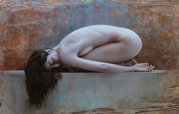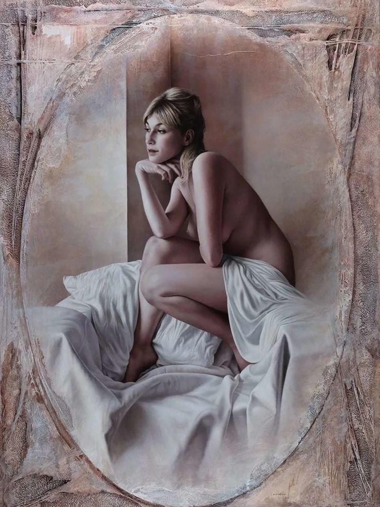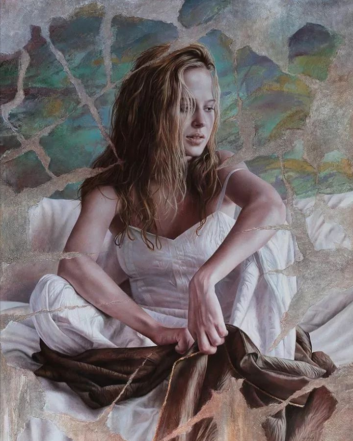 1655年法国科学家帕斯卡写到:“人只不过是一株芦苇,本质上是最脆弱的东西,但他是一株会思考的芦苇。……所以我们所有的尊严都在于思考……通过思考,我们理解世界。”。作为法国艺术家的帕斯卡·乔夫 (1968年--)就是会思考的人,尽管他把对象画得很具象,很精确,很细腻,但是,我们不觉得每一幅是照片,相反地,我们感觉到一种古悠的梦境,所有的对象,主要是人体,置身于一个荒古的坏墙前,淡化了现实的真实情形,而进入一个需要沉思的情境中,他的古老的墙体,是一种超越时空的载体,而且这种载体本身,具备斑驳残缺的美,而且还有人文的元素,比如一幅古风的风景油画,呈现多重的时光空间。在这种背景下的前景的人物越真实,越细腻,也越能显示出绘画作品的深度与艺术价值。过分惊叹他的匠心,细节的精雕,不应当是画者的本意,而是感觉色调和谐的古质风情的整个情境,思考它的隐含意味。