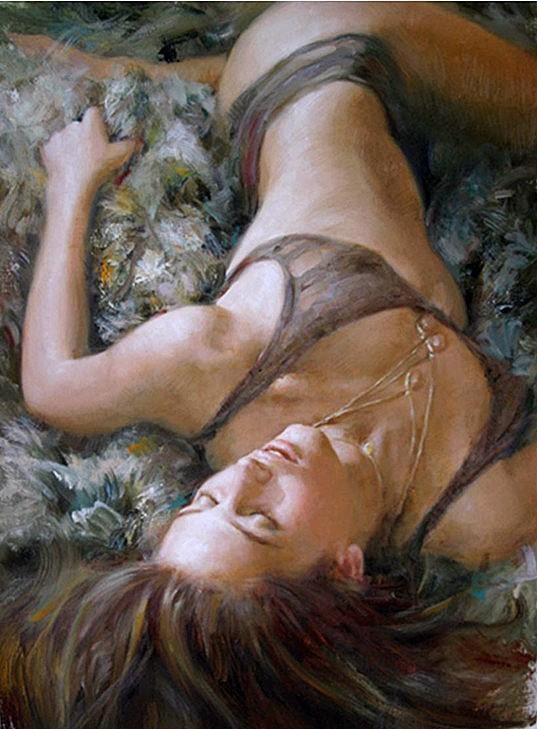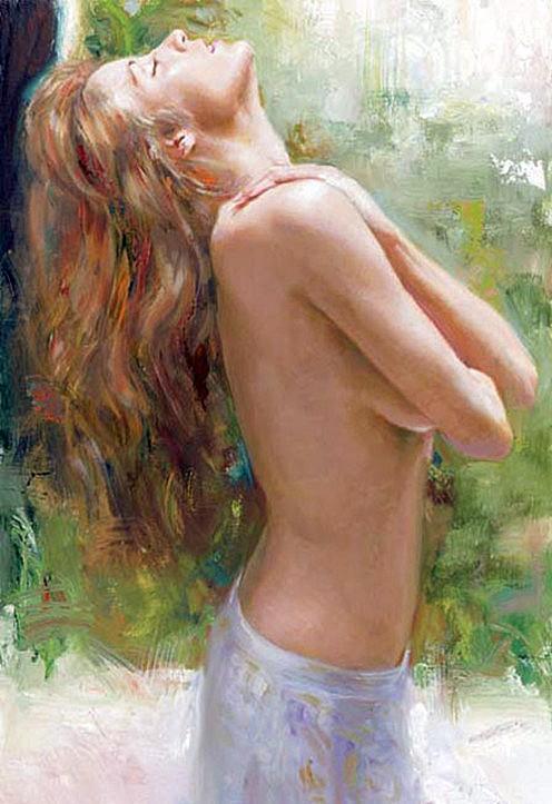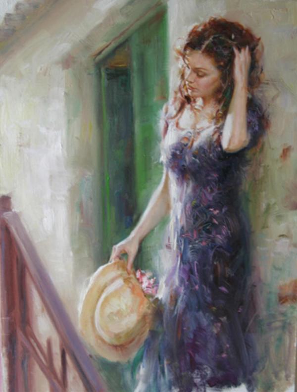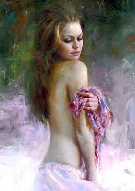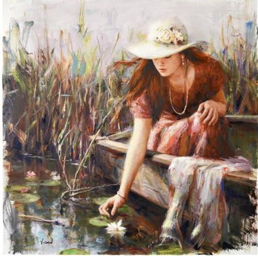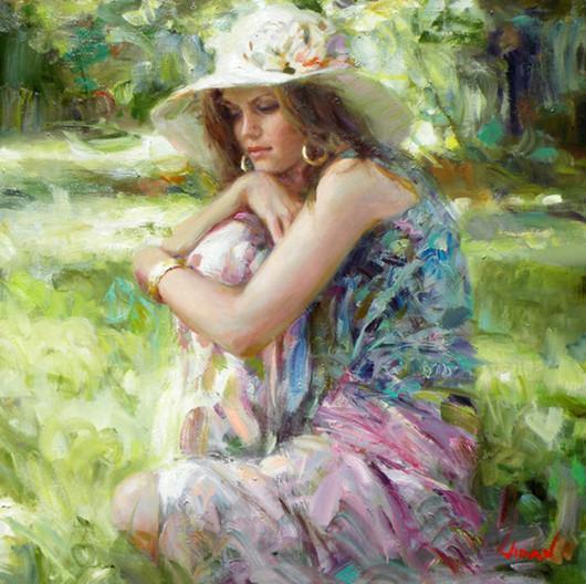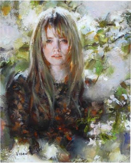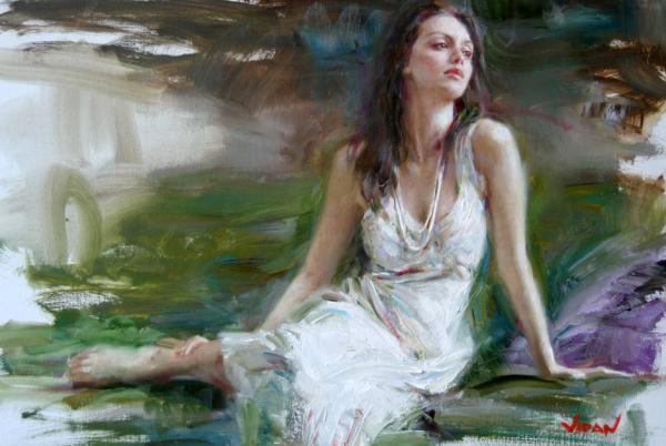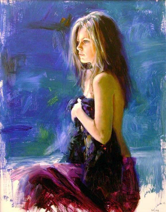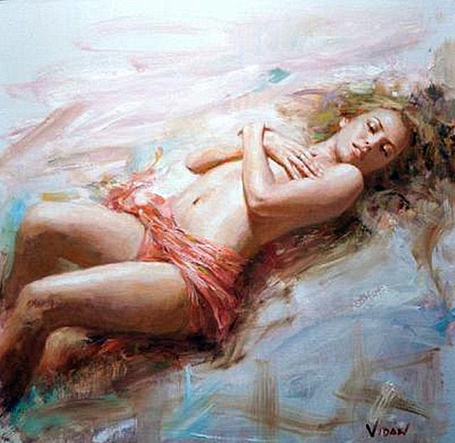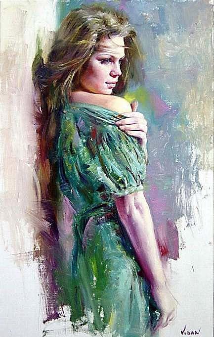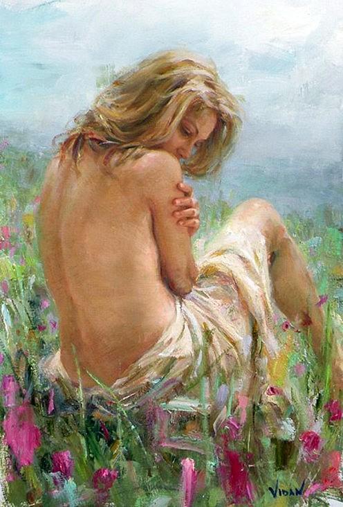 意大利画家Vidan的作品不像那些超写实主义的作品,不过分刻画细节的逼真,而是抒情与写意,保留原初笔触的轨迹,背景的笔触有时是十分的张扬,他喜欢把他的描绘美人置身有鲜花布满的荒草地,情境是在一种有诗意的自然境界中,而且他的色彩迷幻,丰富而温婉,保留张扬的笔触,虽然用笔有点狂野,也彰显自己的个性。情调上有一点的迷朦,不是特别的清晰,也保持了浓郁的绘画的感觉。