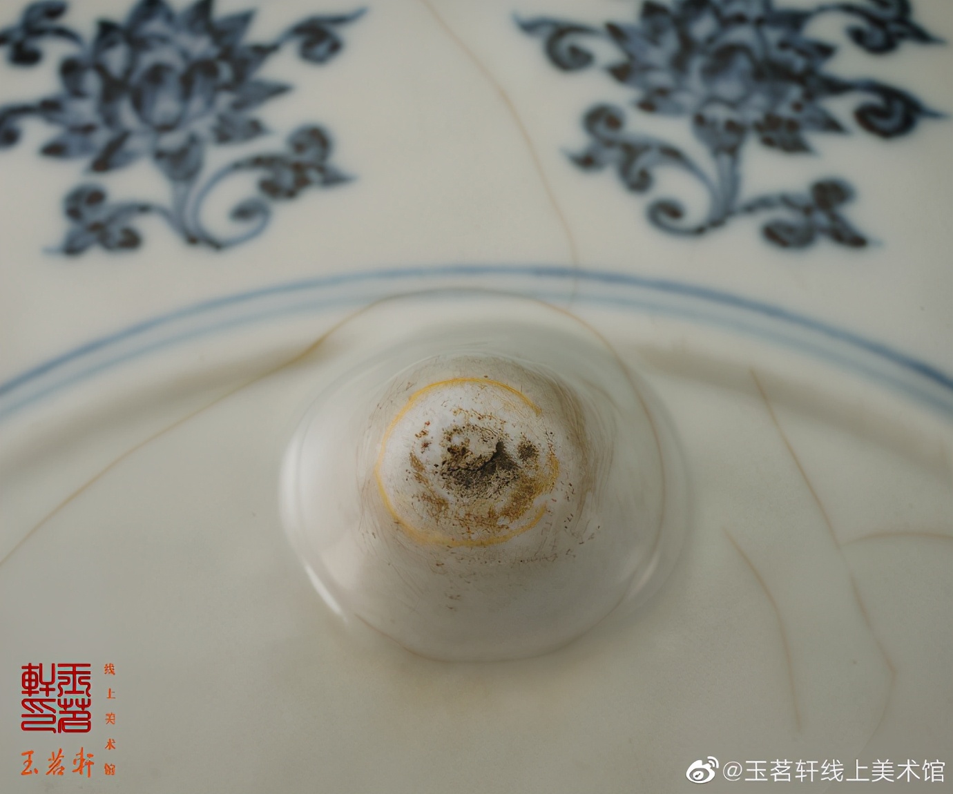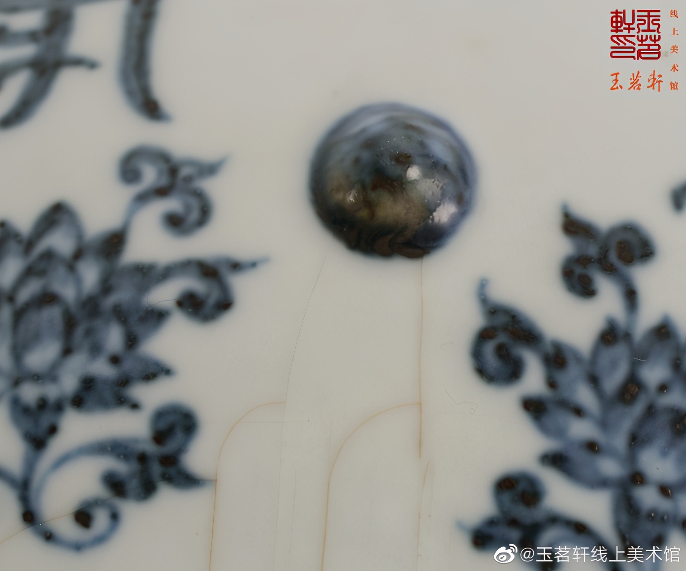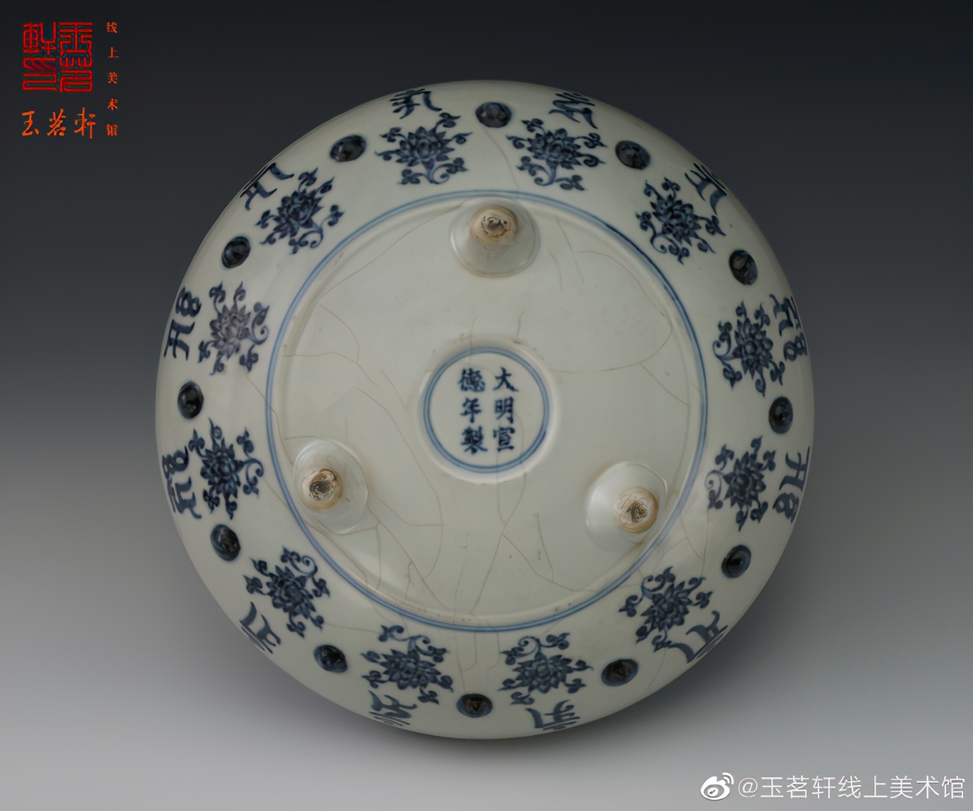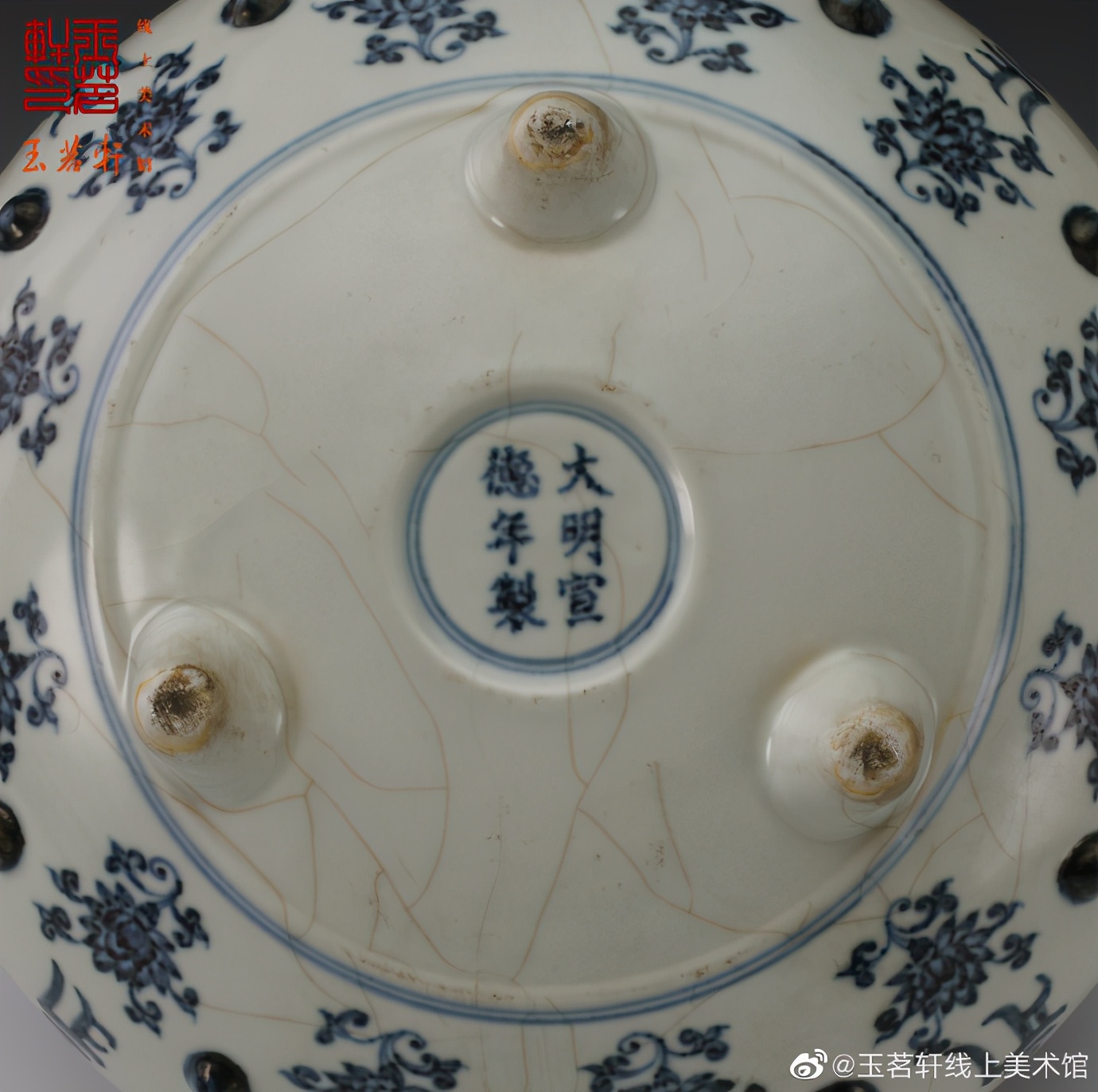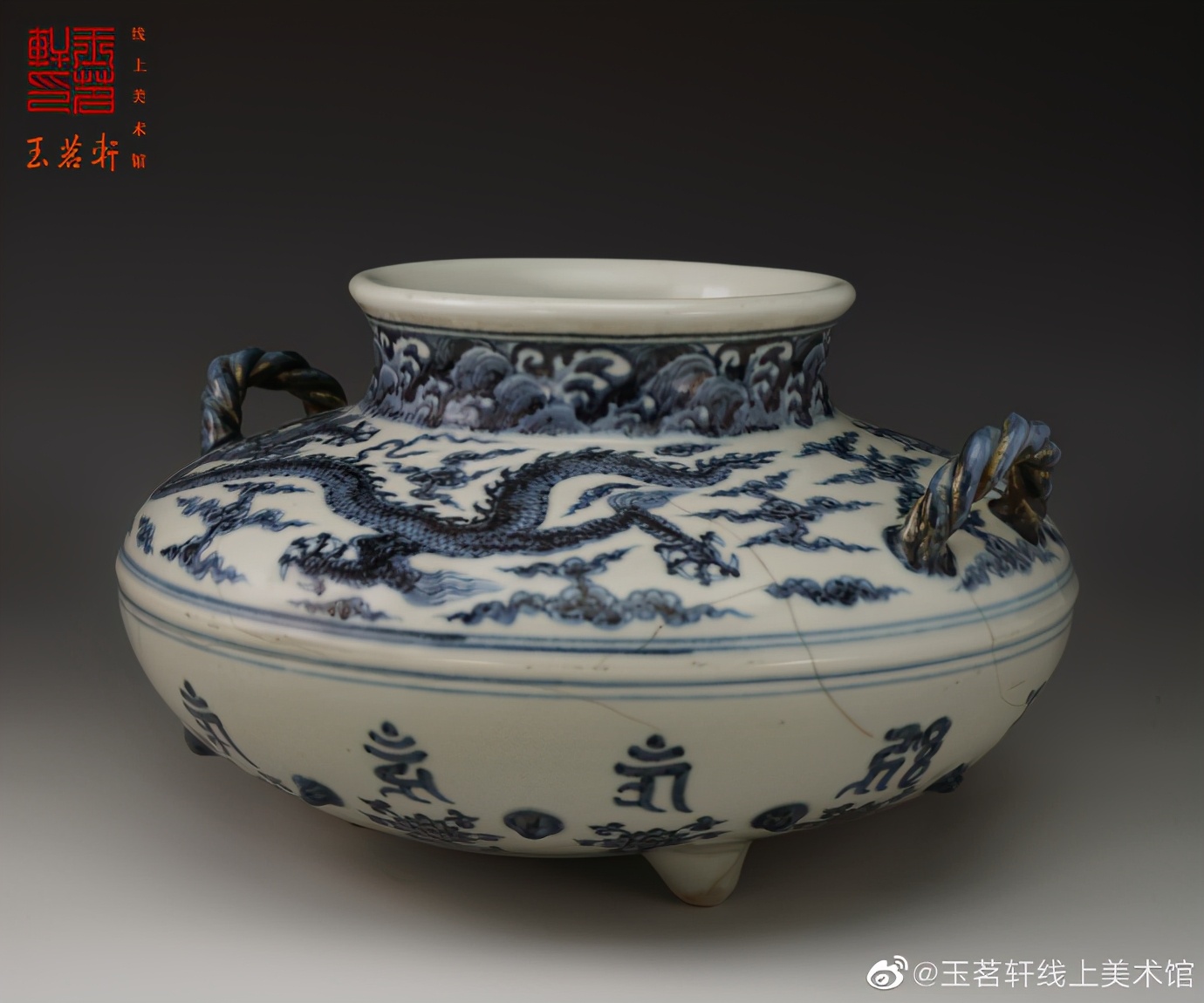 玉茗轩美术馆瓷器赏析:明宣德青花海水龙纹宝相花梵文鼓钉三足花囊