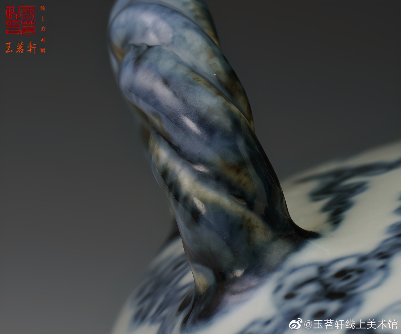 此青花花囊颈部绘海水纹,肩部绘双龙及云纹,弦纹上下各绘双圈,腹部绘宝象花纹并书梵文咒语一周,鼓钉敷青花,贴近乳足外边绘青花双圈,器身有些许疏朗开片纹。整器釉色醇厚温润,画艺超脱内敛,苏麻离青发色沉稳妥帖,青花深色处铁锈斑痕及橘皮纹密布,器型至雅,浑厚古朴,寻遍坊间,尚无二器,为宣德青花可遇而不可求之孤品。(文:黄楷夫)