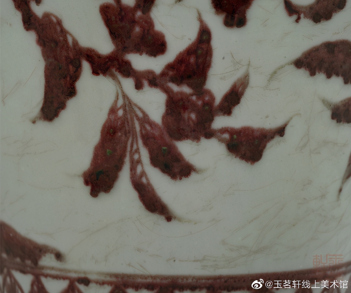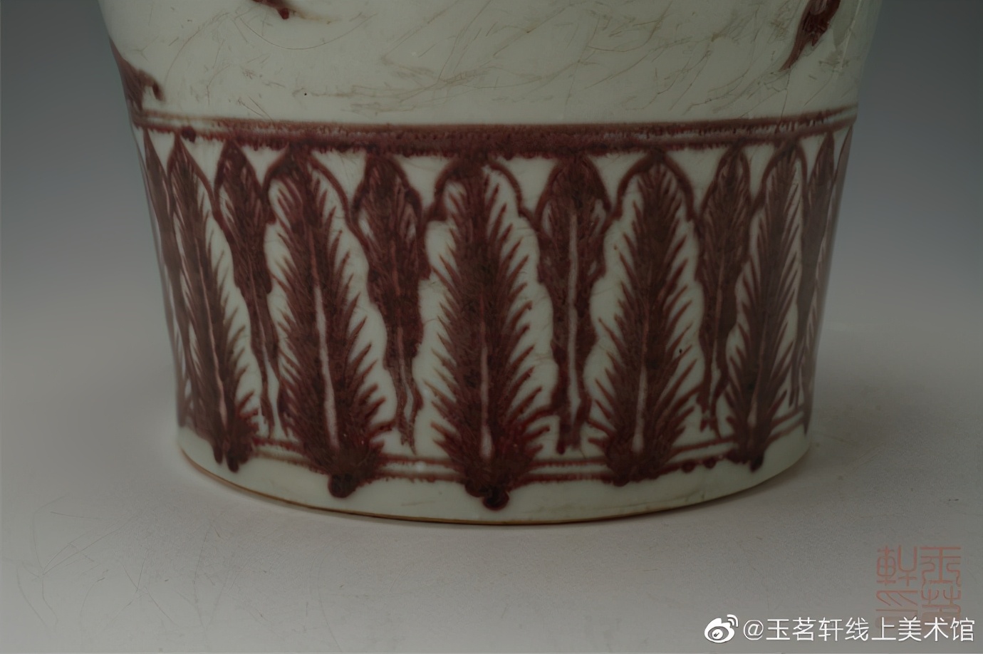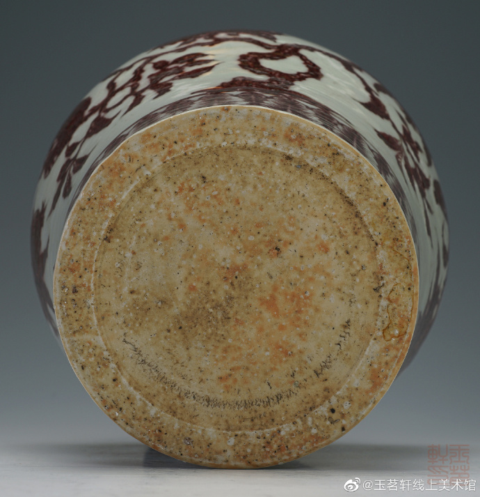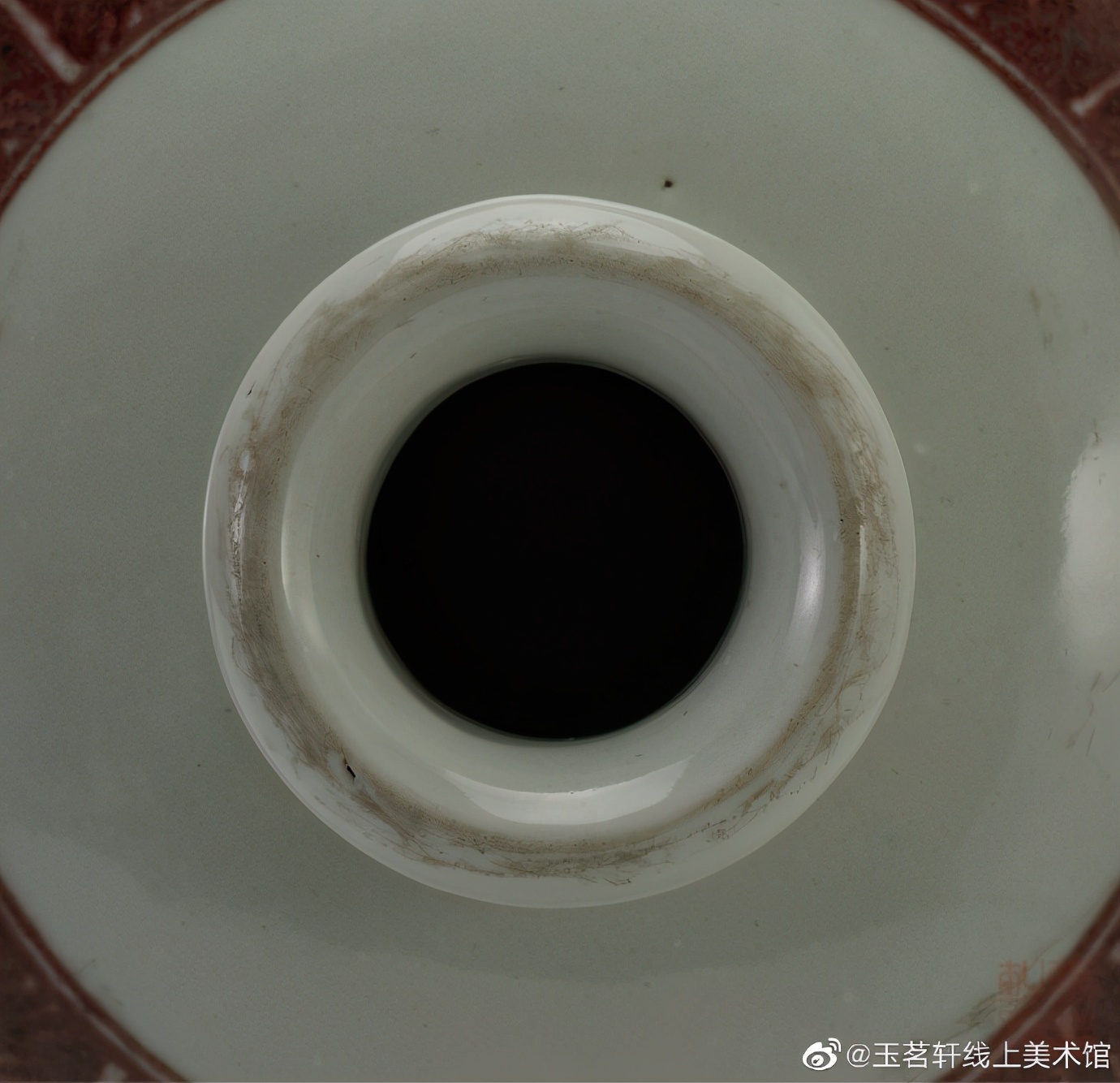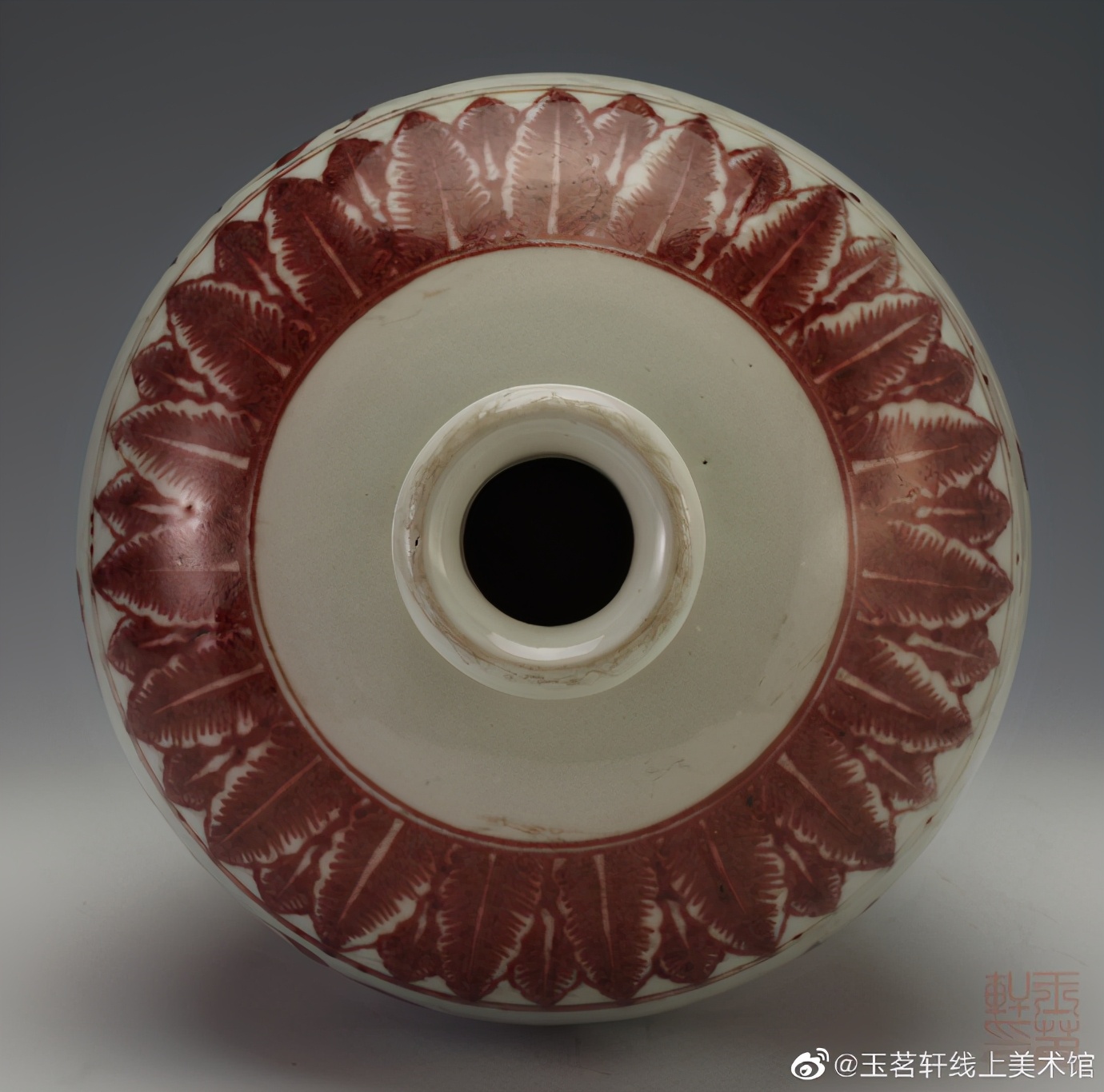 此釉里红梅瓶凸显永乐朝一贯的拓扑少文风格,从器形到绘画,结体恢弘,神丰骨挺,大气浑然,绘画法度严谨,不拘小节,于平实中见严谨洒脱。釉里红绘画从技法到窑温发色控制俱佳。