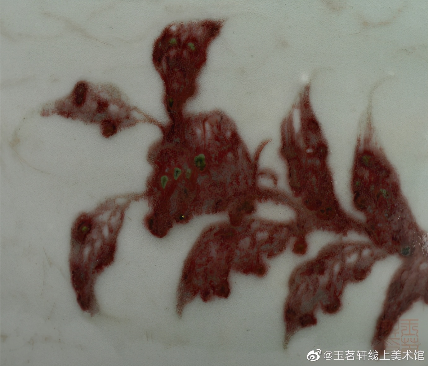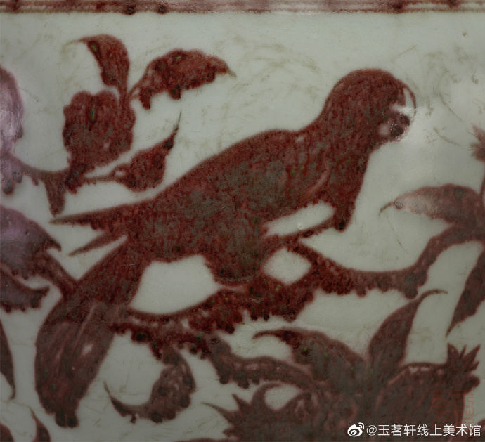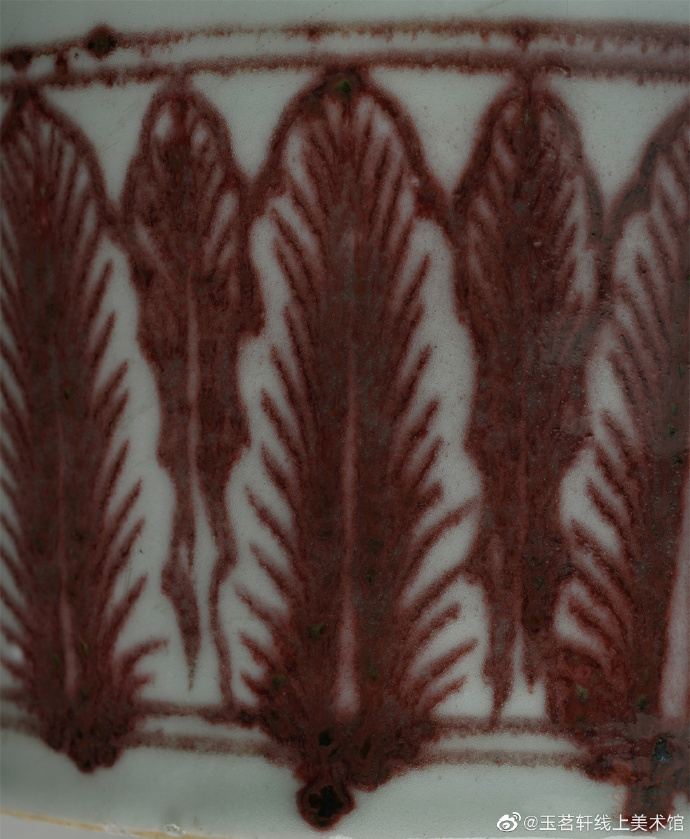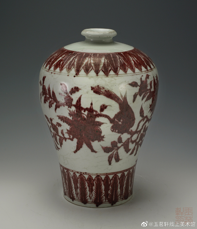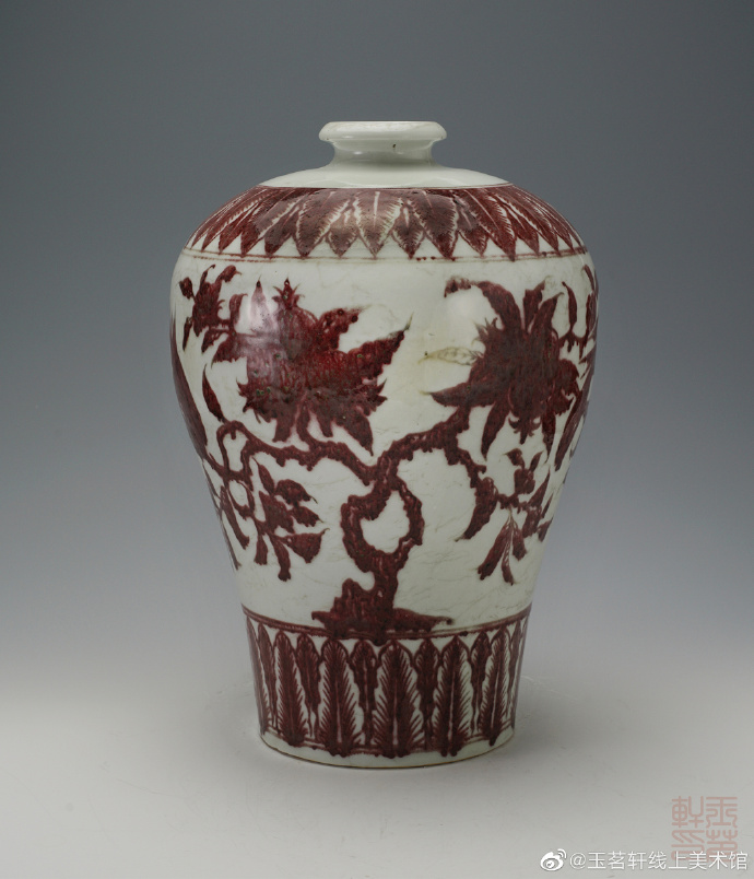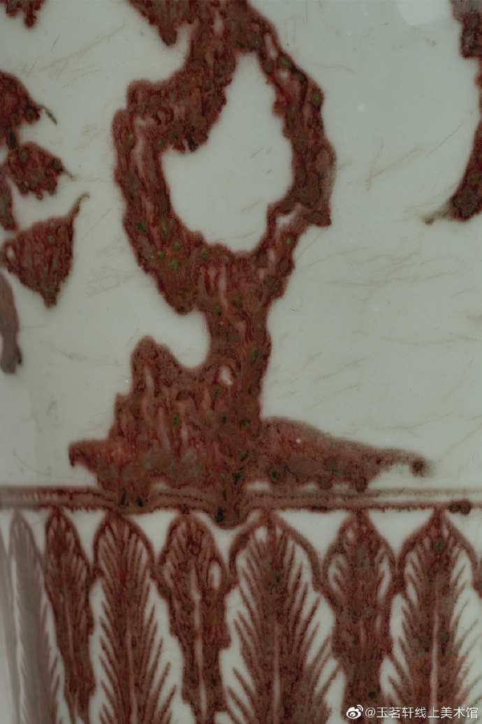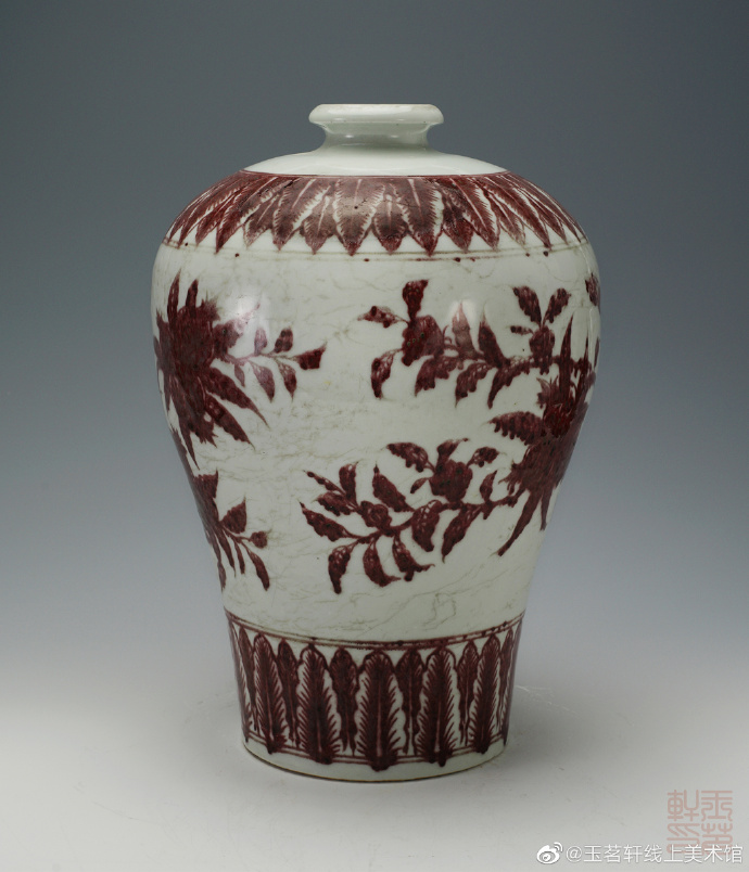 此釉里红梅瓶凸显永乐朝一贯的拓扑少文风格,从器形到绘画,结体恢弘,神丰骨挺,大气浑然,绘画法度严谨,不拘小节,于平实中见严谨洒脱。釉里红绘画从技法到窑温发色控制俱佳。
