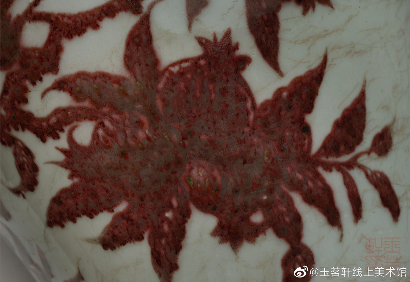 由此梅瓶所绘石榴、鹦鹉、枝桠,观照明代绘画,不禁想到徐渭的《榴实图》、《杂花图》等作品。梅瓶上,釉里红的红色浓厚稳重,单一色彩在高温烧制后产生了细腻丰富的冷暖和深浅变化,颜色倾向也在不同光线下流转。所画物体轮廓线条连贯轻松,自然灵动。在徐渭的书画作品里,笔下墨色的晕染,奔放淋漓,以面带线,以线衬面,结构与转折跃然纸上。水墨中潇洒地留白,釉里红里依托窑温和烧造产生的灰绿色斑点,两者在丰富物体的层次感上创造了不同技艺下相似的美感。