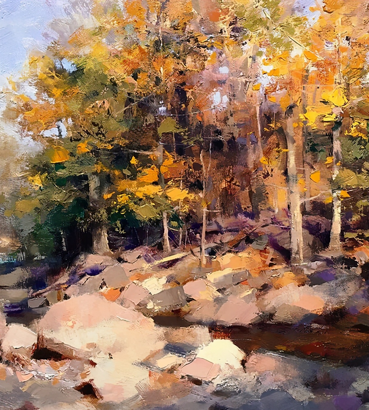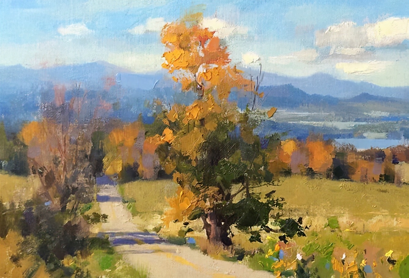 Mark Boedges(1973-)美国画家,他是户外写生的力行者,能够把现实的场景的感受画出来,显然他的作品保持了张扬的笔触,色彩是现实加主观,强化了对象色彩的明度,诸多景物的色彩很艳丽,只是强化了生活中的色彩的鲜明性,但他的色调十分柔和,大的块面上,是运用了油画刀,也就是调色刀,加上张扬的笔触,绘画感觉极强。过于迷幻的色彩可许是在强烈的阳光的刺激下的激情表达方式,也是户外美景对于画者激情的唤起。这种色彩的主观性,其实使得画面事实上有现实印象主义合体的情形,两者似乎融合为一体的风格特征。户外的写生在时间上有点急促,景观的变化快,捕捉瞬间的场景成了画家的一项技能。
