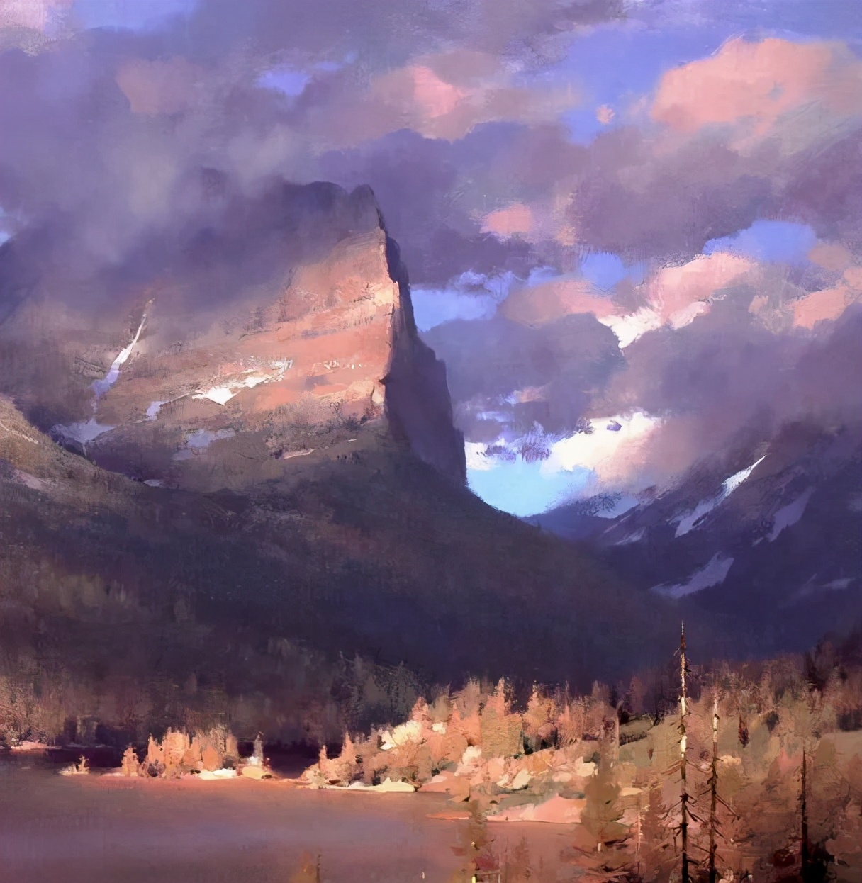 上图这种似乎像夕阳返照的山石云烟景象,更能体现画者敏感的捕捉能力,把这种奇观胜景凝固化,在构成与明暗处理上,富于节奏感,空间的近深,虚实的变化运用自如 ,这种绘画的场景,细节不是特别的深入,却能做到整体的和谐统一。