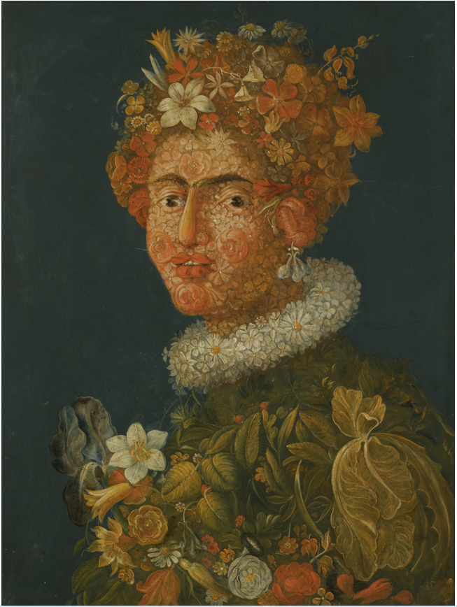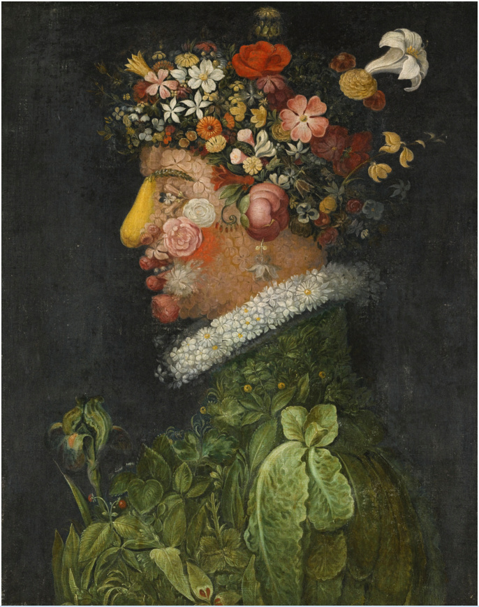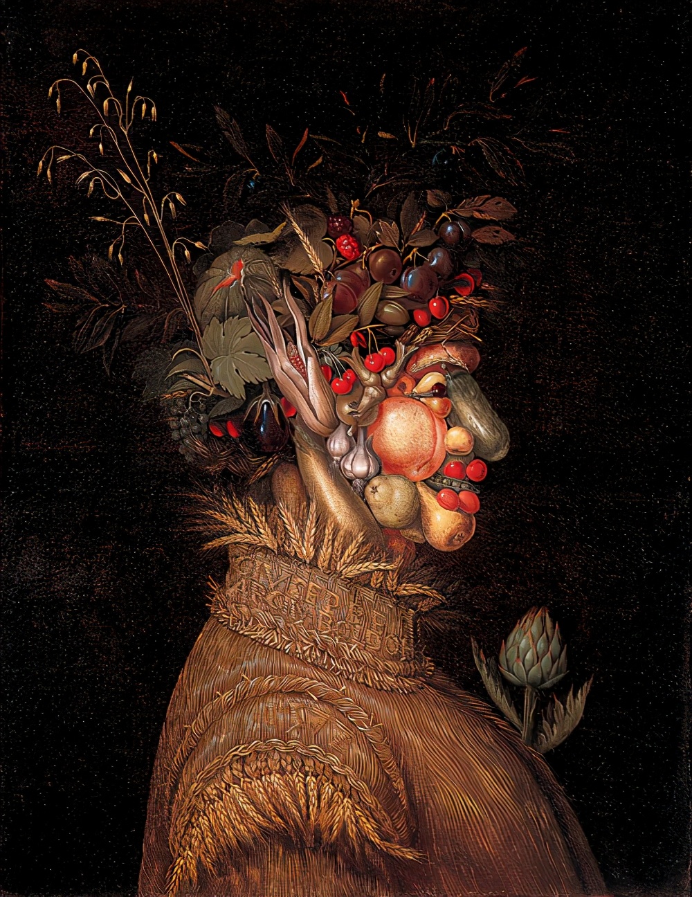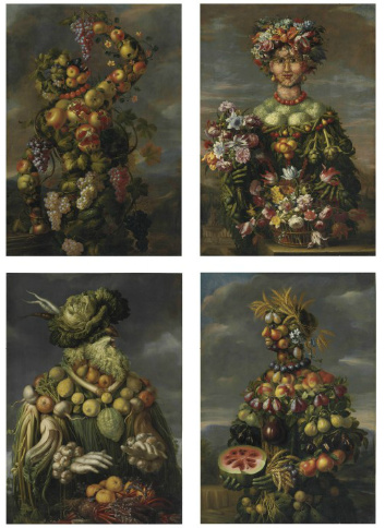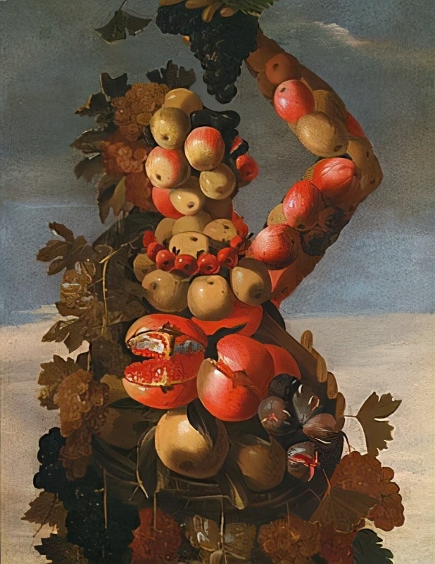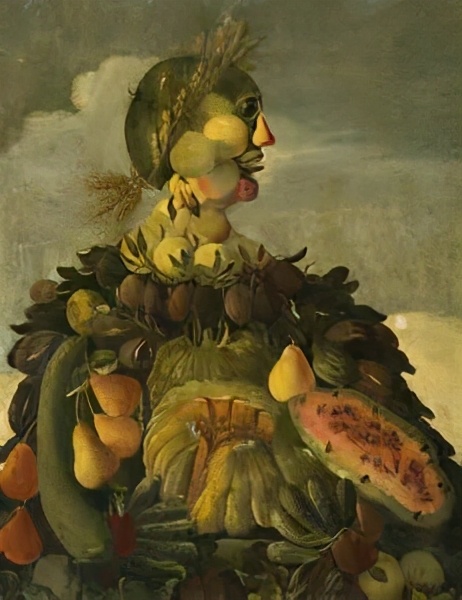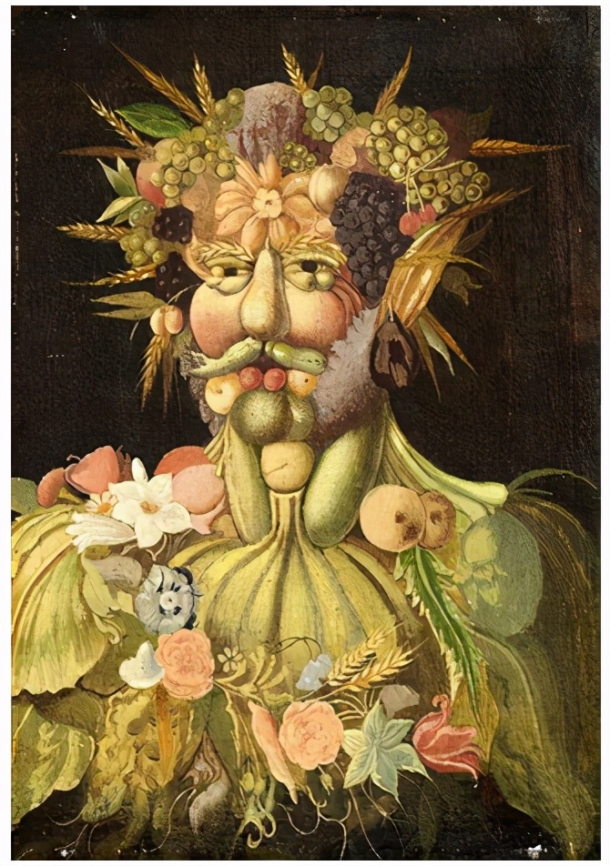 Giuseppe Arcimboldo (1527–1593)意大利画家,他画人,却是用花卉果子鱼鸟等等堆集而成,他画花卉果子鱼鸟动物,看着象一个人像,这样画比较费神费工夫,这也是他的绘画的高明与独特之处,陶潜就说过“连林人不觉,独树众乃奇。”艺术的不凡就是与他人不一样,因为我们知道的西洋画家画花卉静物,个个尖顶,大家都画得一样,那其实也没什么意思。Giuseppe Arcimboldo的画已经有现代主义,诸如立体主体,超现实主义的意味,属于一个前瞻性的画者,这个可是十六世纪的画家啊,是不是太神奇了。而且这种前超现实主义的画,观者接受程度应当是远超达利等现代风格的超现实主义者,因为他的构成元素是人们喜爱的花卉植物动物果菜等等,而且这些元素的构成一个人形是具有幽默感,引人开心,这里面唤起的只有食欲,而不是其它,这种在当时前卫的绘画,也许给欧洲人的思想改变,起到一定的作用吧,因为艺术的作用往往是潜移默化的,它在影响人们,别老生常谈,试着改变一下,实质上社会就是不断变革中前进的。