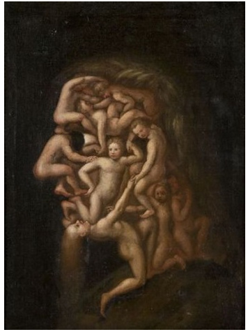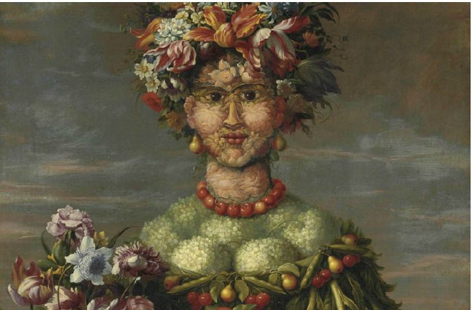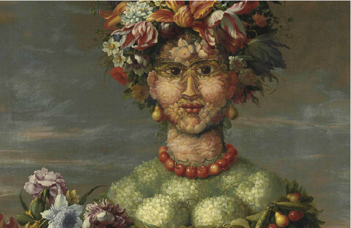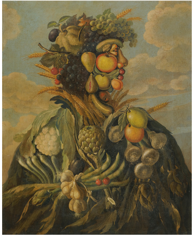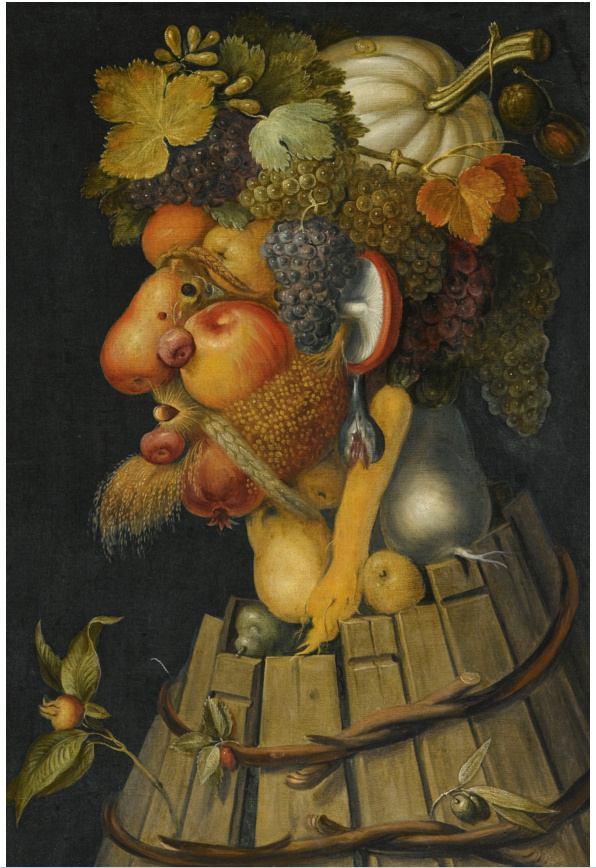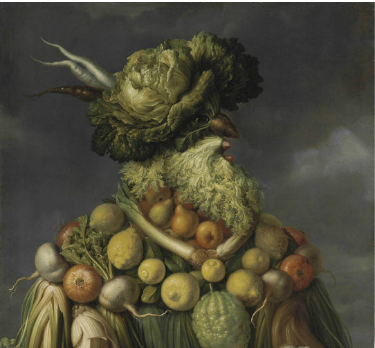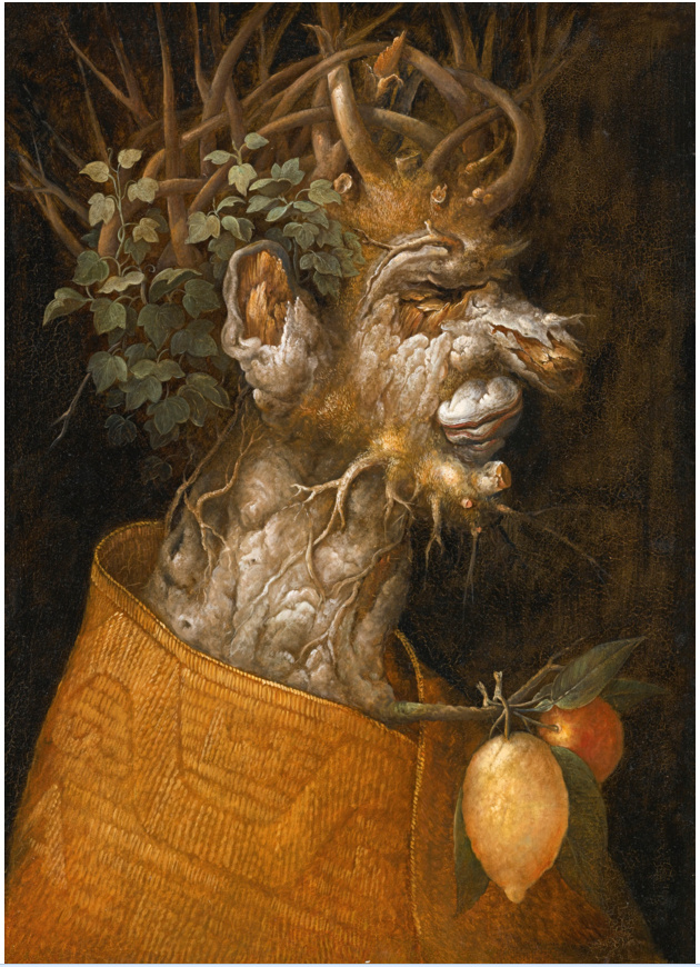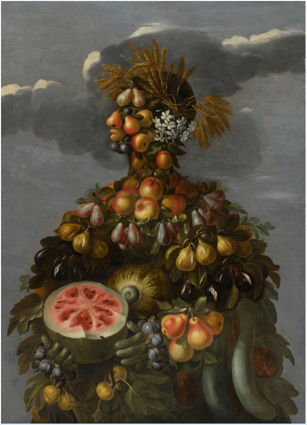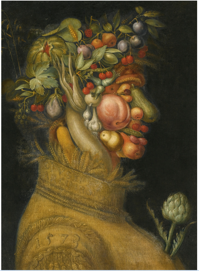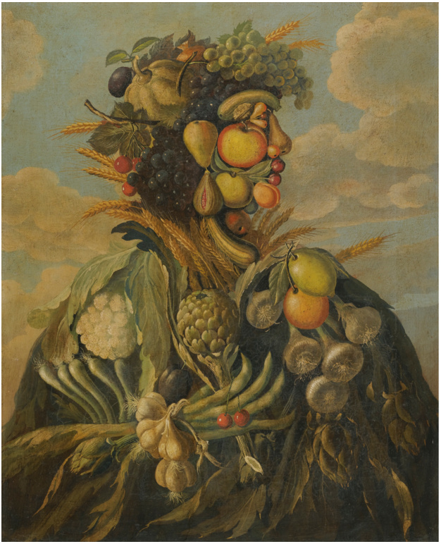 Giuseppe Arcimboldo (1527–1593)意大利画家,他画人,却是用花卉果子鱼鸟等等堆集而成,他画花卉果子鱼鸟动物,看着象一个人像,这样画比较费神费工夫,这也是他的绘画的高明与独特之处,陶潜就说过“连林人不觉,独树众乃奇。”艺术的不凡就是与他人不一样,因为我们知道的西洋画家画花卉静物,个个尖顶,大家都画得一样,那其实也没什么意思。Giuseppe Arcimboldo的画已经有现代主义,诸如立体主体,超现实主义的意味,属于一个前瞻性的画者,这个可是十六世纪的画家啊,是不是太神奇了。而且这种前超现实主义的画,观者接受程度应当是远超达利等现代风格的超现实主义者,因为他的构成元素是人们喜爱的花卉植物动物果菜等等,而且这些元素的构成一个人形是具有幽默感,引人开心,这里面唤起的只有食欲,而不是其它,这种在当时前卫的绘画,也许给欧洲人的思想改变,起到一定的作用吧,因为艺术的作用往往是潜移默化的,它在影响人们,别老生常谈,试着改变一下,实质上社会就是不断变革中前进的。