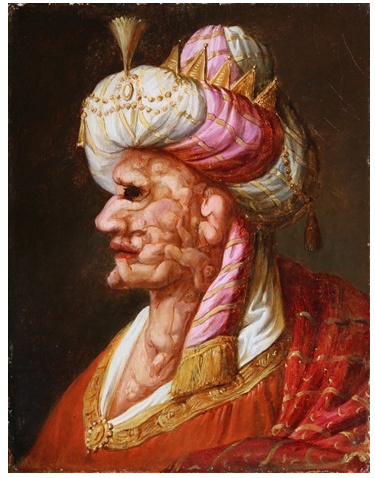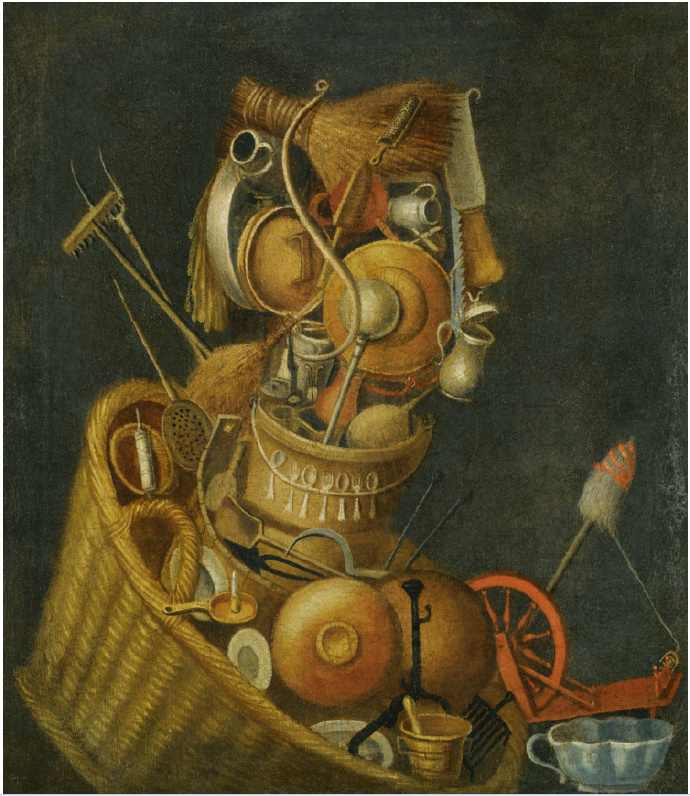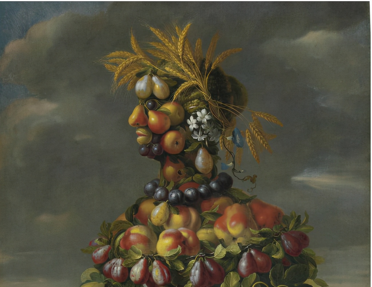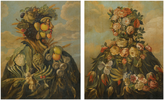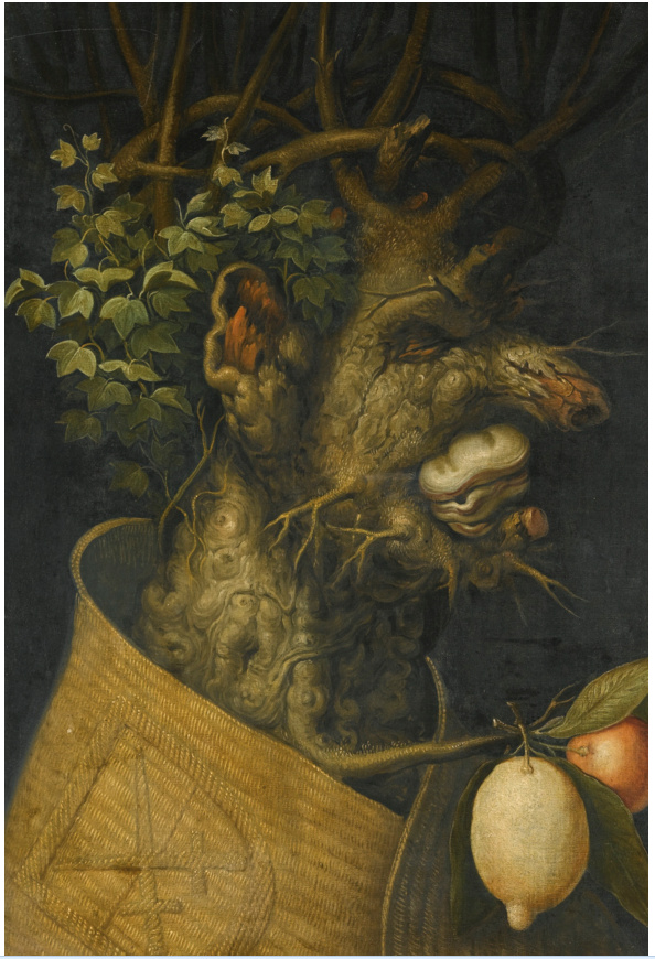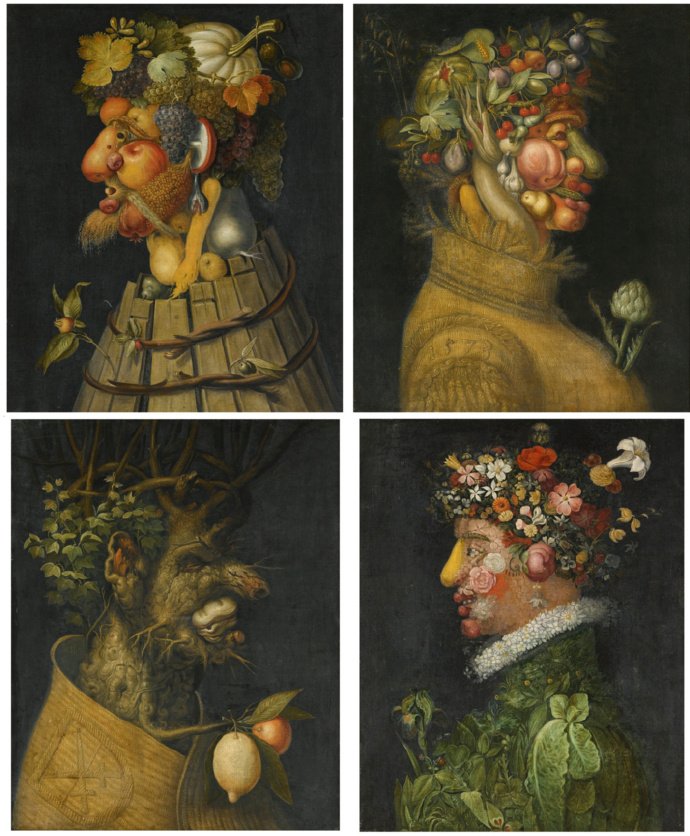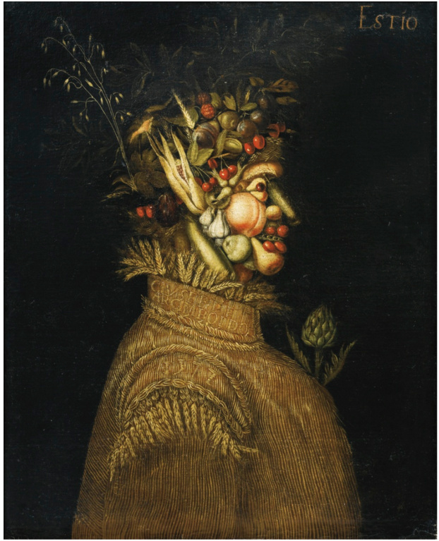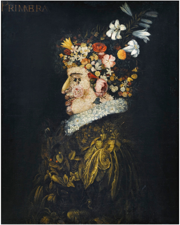 Giuseppe Arcimboldo (1527–1593)意大利画家,他画人,却是用花卉果子鱼鸟等等堆集而成,他画花卉果子鱼鸟动物,看着象一个人像,这样画比较费神费工夫,这也是他的绘画的高明与独特之处,陶潜就说过“连林人不觉,独树众乃奇。”艺术的不凡就是与他人不一样,因为我们知道的西洋画家画花卉静物,个个尖顶,大家都画得一样,那其实也没什么意思。Giuseppe Arcimboldo的画已经有现代主义,诸如立体主体,超现实主义的意味,属于一个前瞻性的画者,这个可是十六世纪的画家啊,是不是太神奇了。而且这种前超现实主义的画,观者接受程度应当是远超达利等现代风格的超现实主义者,因为他的构成元素是人们喜爱的花卉植物动物果菜等等,而且这些元素的构成一个人形是具有幽默感,引人开心,这里面唤起的只有食欲,而不是其它,这种在当时前卫的绘画,也许给欧洲人的思想改变,起到一定的作用吧,因为艺术的作用往往是潜移默化的,它在影响人们,别老生常谈,试着改变一下,实质上社会就是不断变革中前进的。