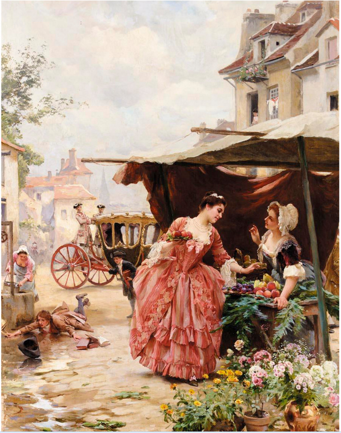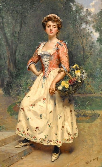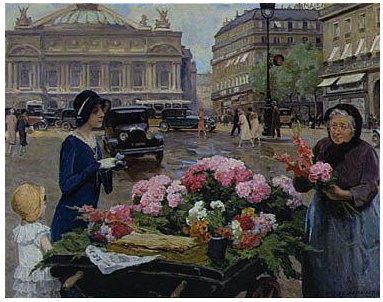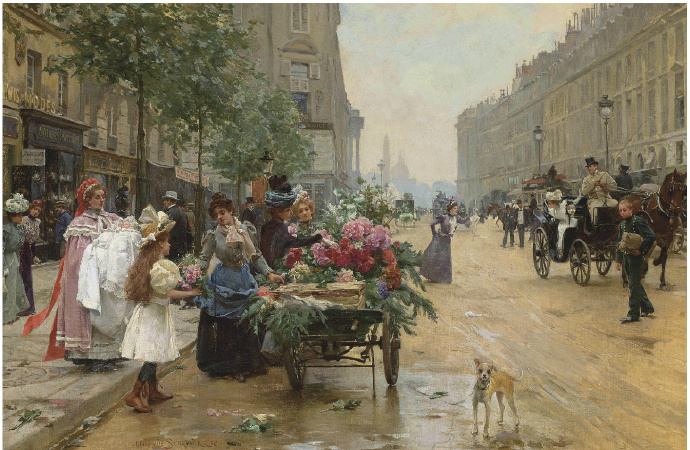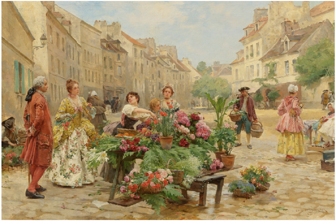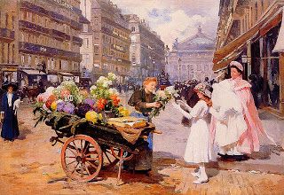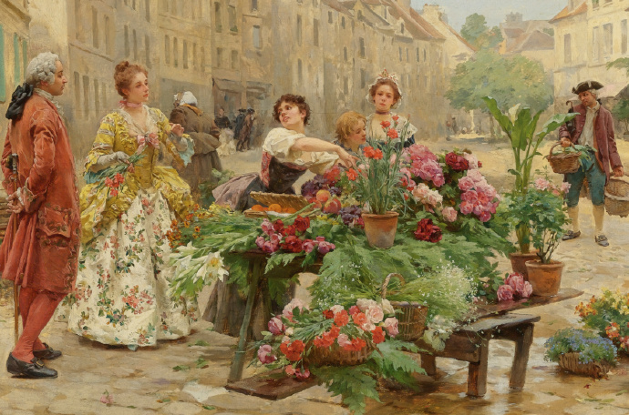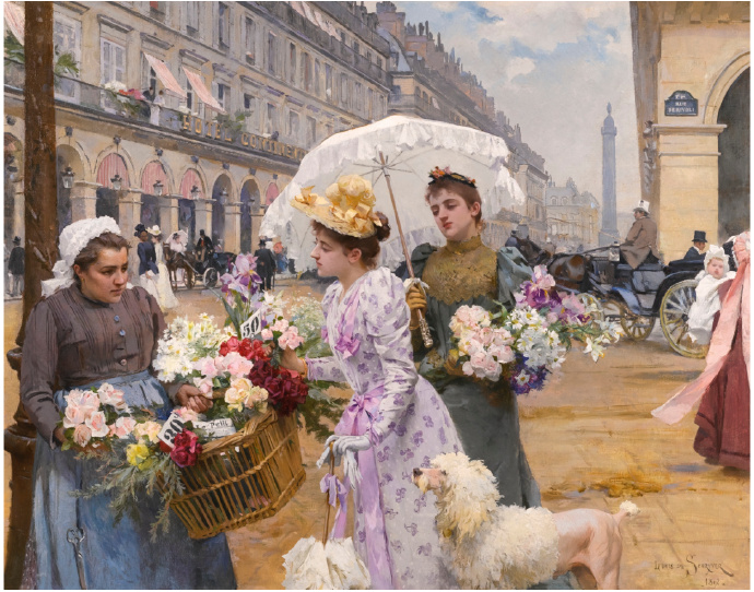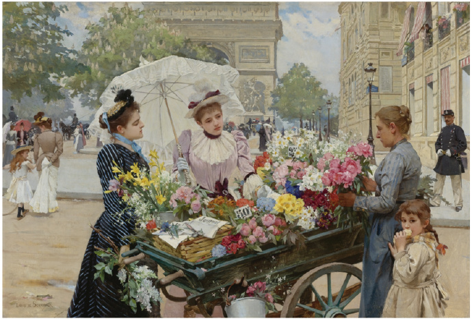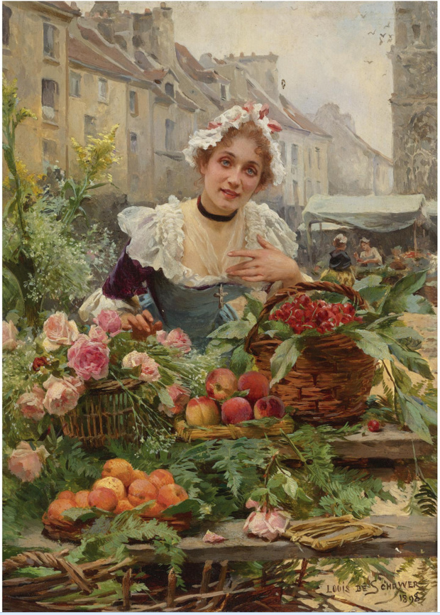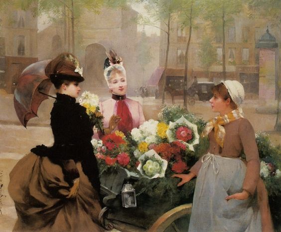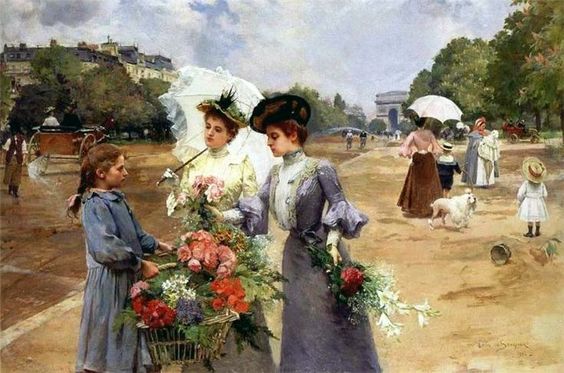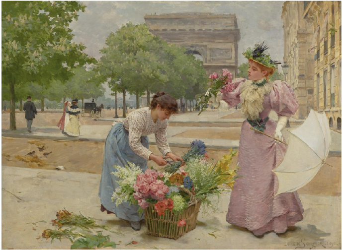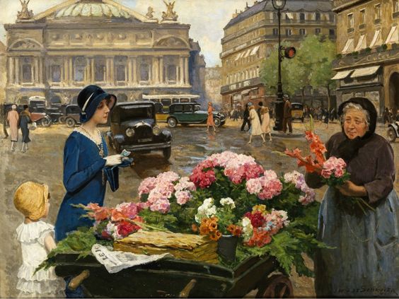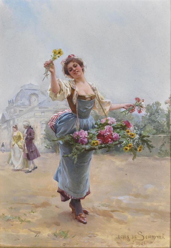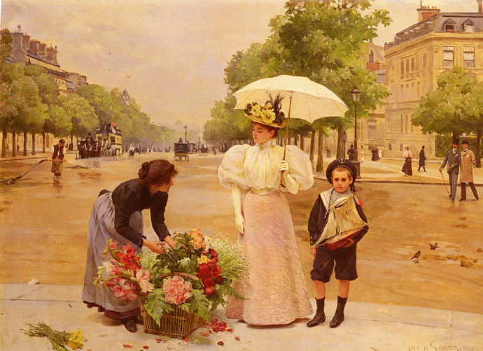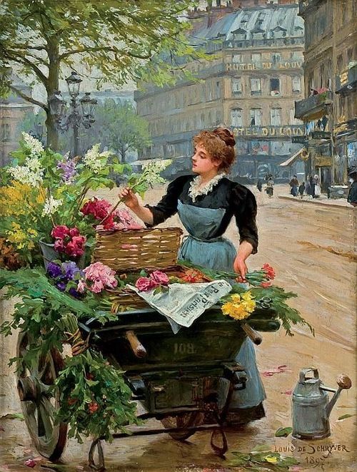 Louis Marie de Schryver 路易斯·玛丽·德斯力瓦(1862–1942)法国画家,路易斯的作品呈现一种全能,人物画,静物画,风景画综合在一个巴黎街市卖花买花的场景中,显然巴黎的卖花姑娘也太轻松了,巴黎也太落后了,显然没有城管,这种自由卖场与买场的风尚,保存在绘画艺术里还是不错了,但对于一个城市管理来说未免太落后了。闲话少说,对于卖花姑娘题材的作品,我所见的也不多,路易斯是难得专注此类题材的画家,而且也相当成功,在他的画面上的巴黎街市景观,美人 ,贵妇,绅士,加上鲜花,集合成美好一画面,确实十分养眼的艺术场景。在我被洗脑的记忆里,韩国的卖花姑娘有多美,又有多惨,其实,没那么回事,许多卖花姑娘生意做好了成了大老板,苦劳致富吗,看看今天的南非闹革命,打砸抢,老天都看不下去了,还是巴黎这种劳动与和谐市场的场景方是美好的,猫论带给我们今天富足宁静的生活,就象巴黎的这种场景一样。