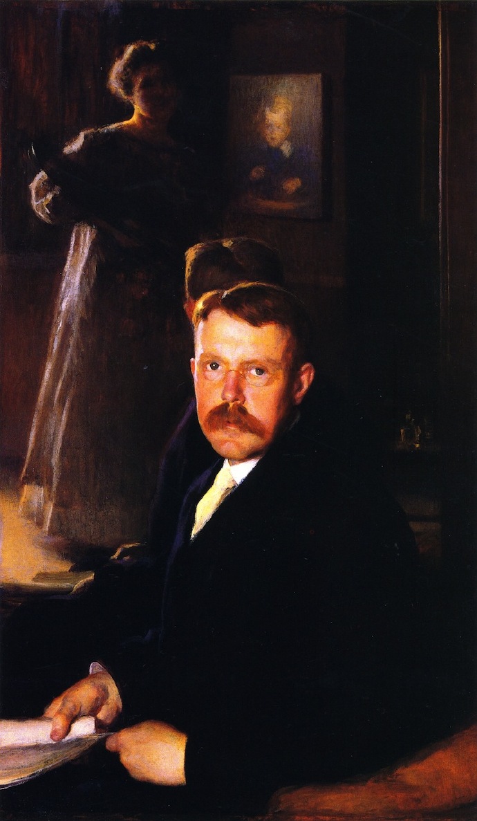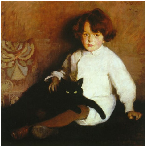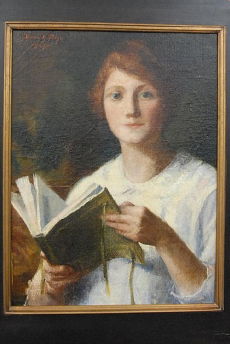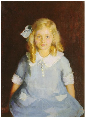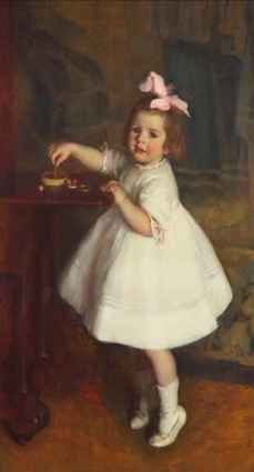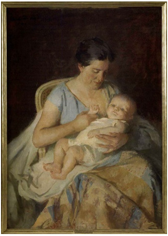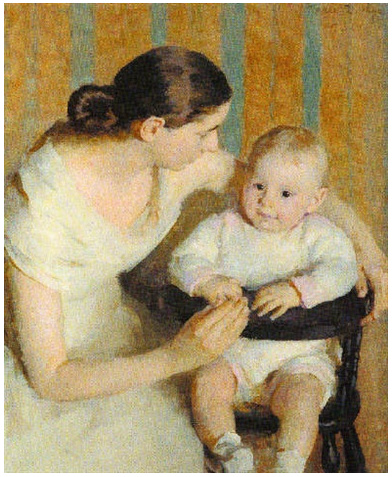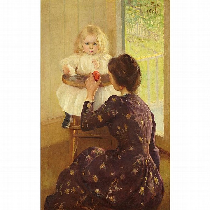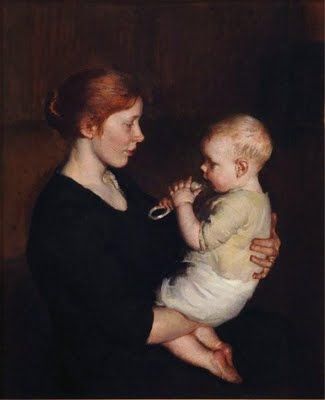 Marie Danforth Page (1869–1940)美国女画家,长于写实肖像画,善画美人与童子,女性画家,通常在母亲与婴儿的题材上,有特别的优势与长,一些著名的画家,莫里索,卡萨特,都是画母子题材的好手,玛丽同样体现了这种优势与长处,画得特别的激动人心,首图可以说是精品,她用尖金字塔构图来组织这个画面,色调用纯洁的白,当然不是单纯的白,下身的裙子有点状纹的,稍微带米黄色的白,虽然轻盈的白块占主流,但用头发的椅子的深色稳住画面,不至于轻飘。画面的婴儿深入梦境中,而漂亮的母亲却不敢放松,稳抱着婴儿,目光有神,这样是充满慈祥的爱意。背景用了条状的墙体,也是白色调,条状的优势就是对于画面的空间的视觉伸张有上下延长的纵深感觉。显然她的艺术风格也是印象写实主义融合体,两者的合理因素都拿来,获得一种完美,使她成了成功的肖像画家。