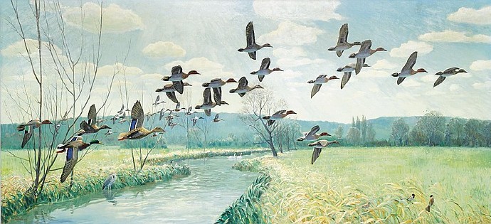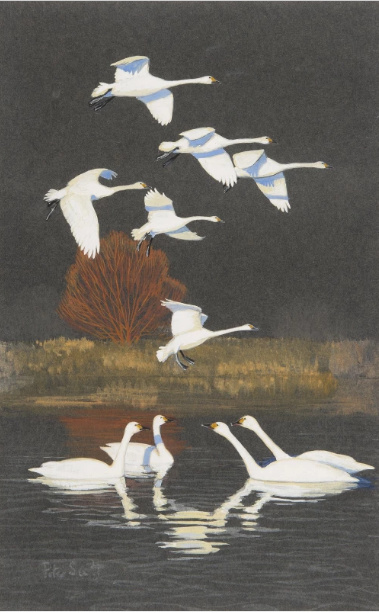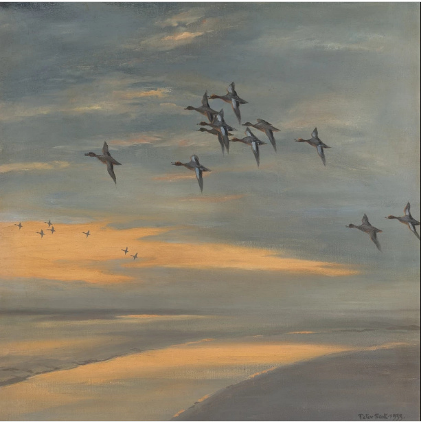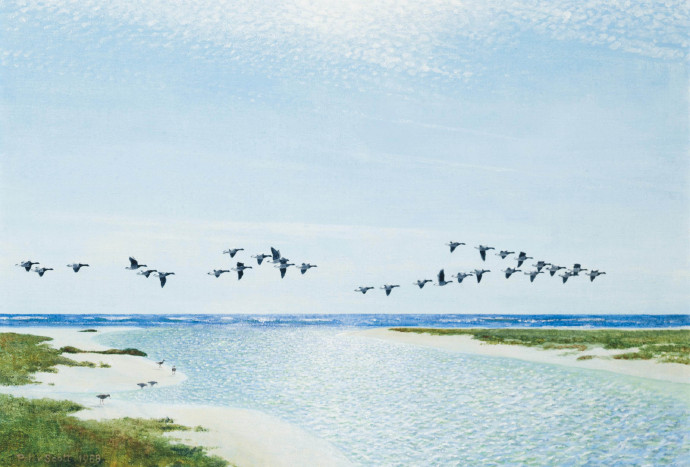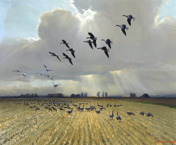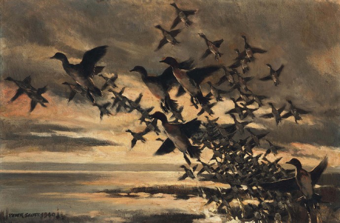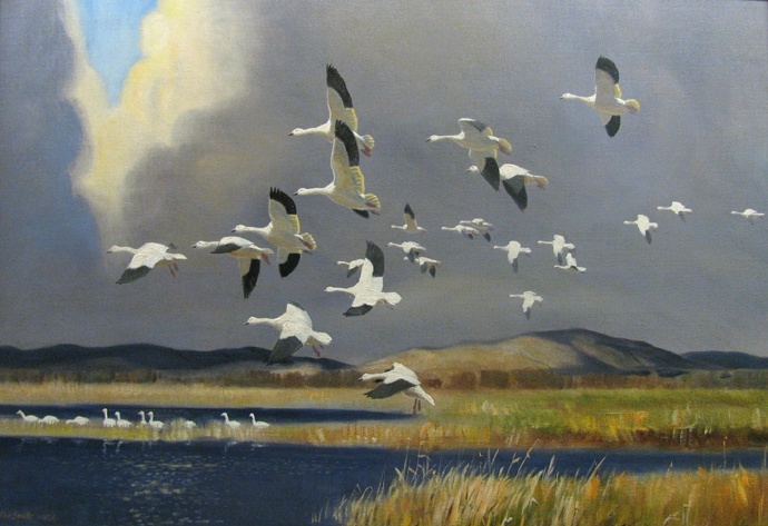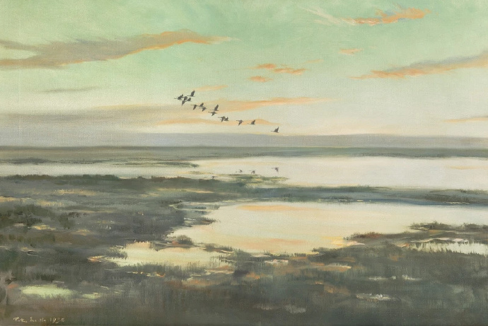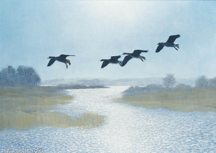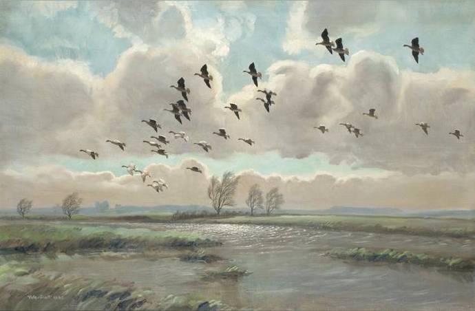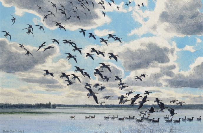 PeterMarkhamScott(1909-1989)英国画家,以画雁闻名。西洋画家画雁,比较写实,容易抵消诗意与抒情,我们东方的画家,比如边寿民,水墨意味地画着,重在抒情,我们古人的诗人写雁就有:初闻征雁已无蝉,百尺楼高水接天.青女素娥俱耐冷,月中霜里斗婵娟---云中谁寄锦书来,雁字回时,月满西楼.----冰簟银床梦不成,碧天如水夜云轻.雁声远过潇湘去,十二楼中月自明....雁在东方是沉郁的秋天情思,虽然洋画师是写实,但东方的观者的感悟,会有地域化,想的一会一样。绘画作品只是一种媒介,东西方的哈姆雷特的想法各各不同,都会从绘画的现实中发散而来,产生艺术欣赏的新意思与新成果,这也是艺术审美欣赏的特性与奇妙之处。
