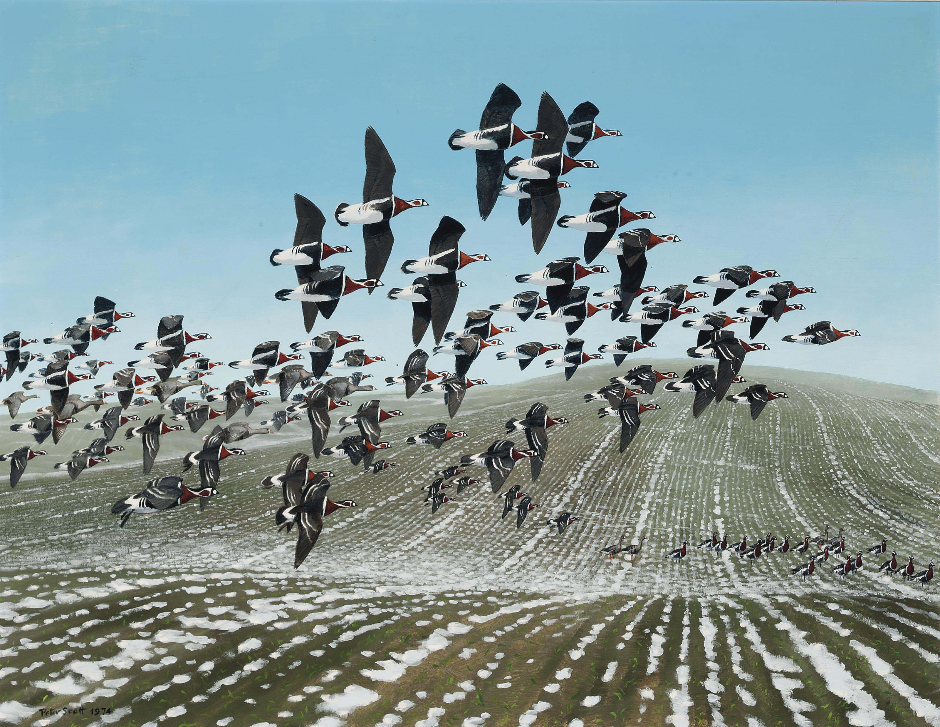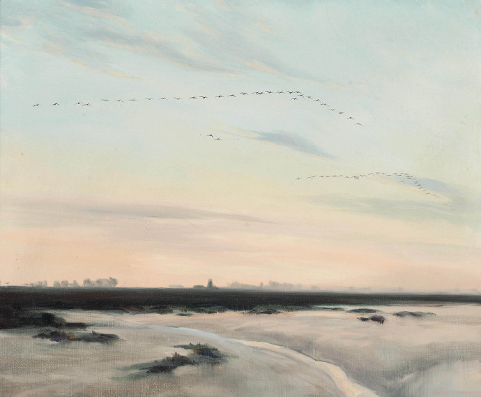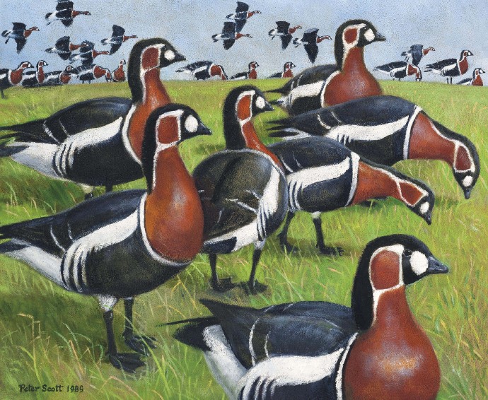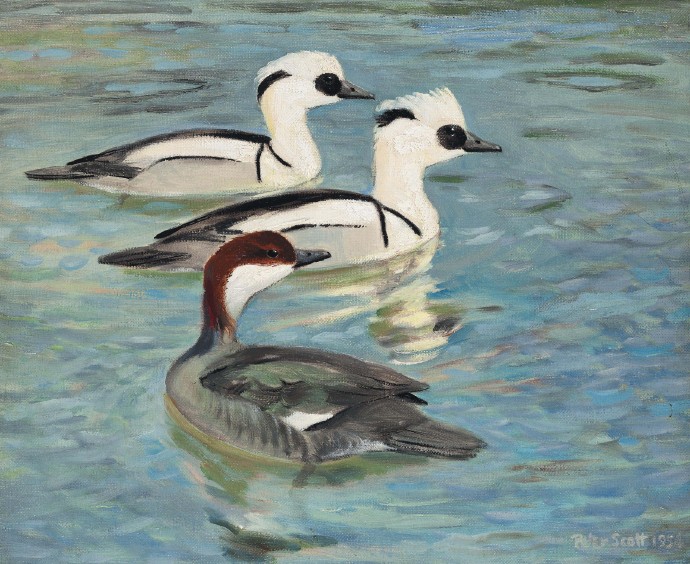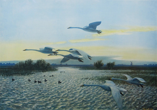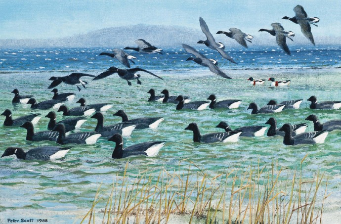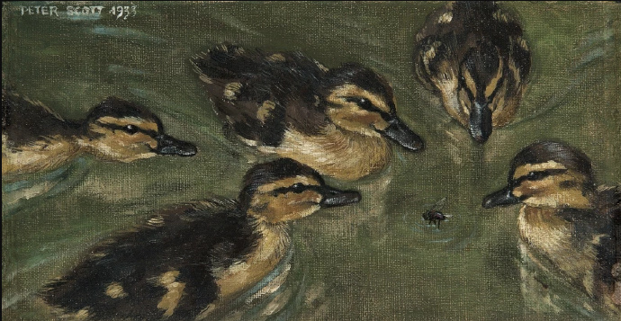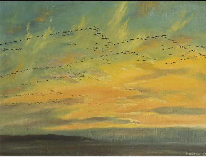 PeterMarkhamScott(1909-1989)英国画家,以画雁闻名。西洋画家画雁,比较写实,容易抵消诗意与抒情,我们东方的画家,比如边寿民,水墨意味地画着,重在抒情,我们古人的诗人写雁就有:初闻征雁已无蝉,百尺楼高水接天.青女素娥俱耐冷,月中霜里斗婵娟---云中谁寄锦书来,雁字回时,月满西楼.----冰簟银床梦不成,碧天如水夜云轻.雁声远过潇湘去,十二楼中月自明....雁在东方是沉郁的秋天情思,虽然洋画师是写实,但东方的观者的感悟,会有地域化,想的一会一样。绘画作品只是一种媒介,东西方的哈姆雷特的想法各各不同,都会从绘画的现实中发散而来,产生艺术欣赏的新意思与新成果,这也是艺术审美欣赏的特性与奇妙之处。