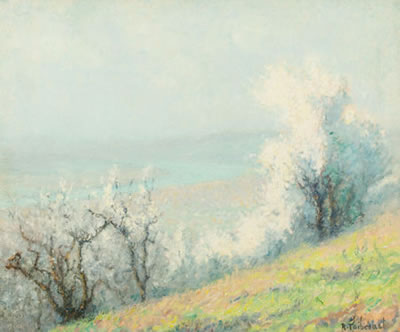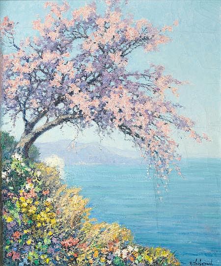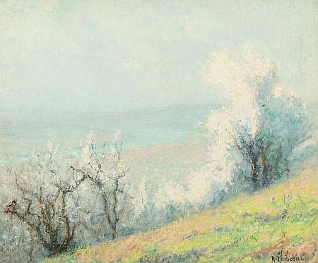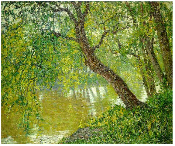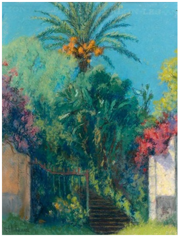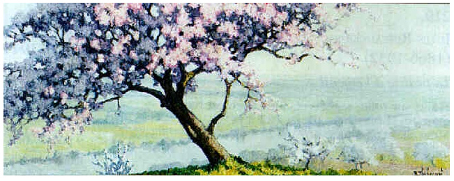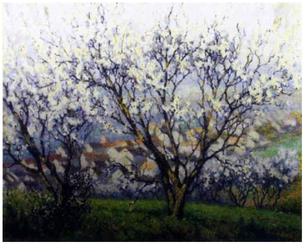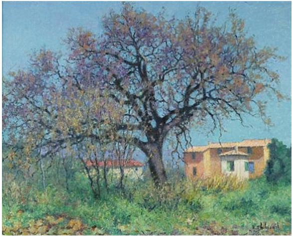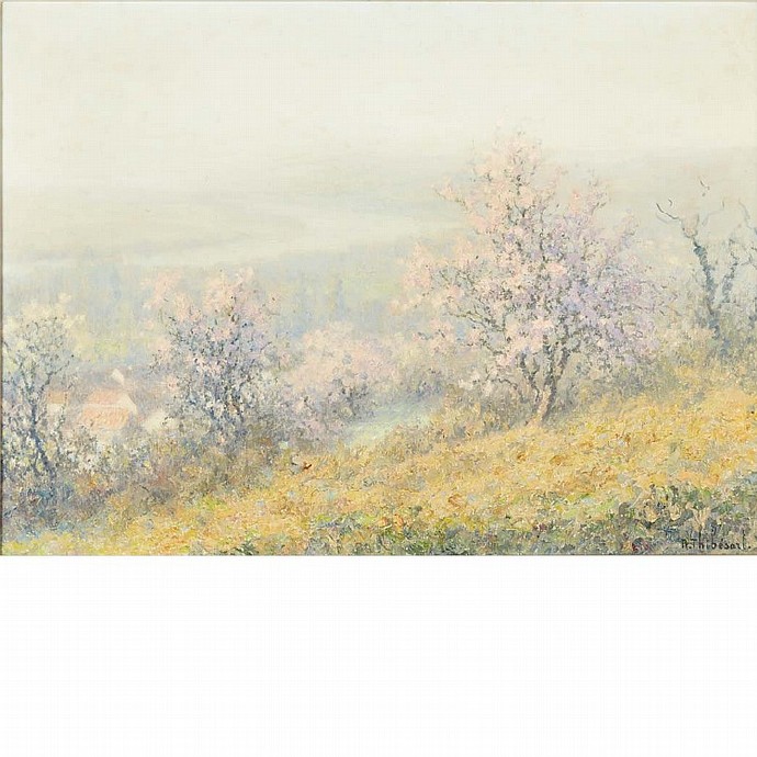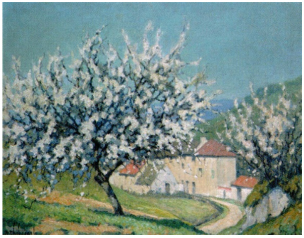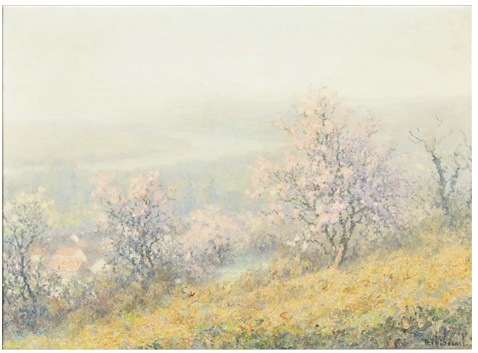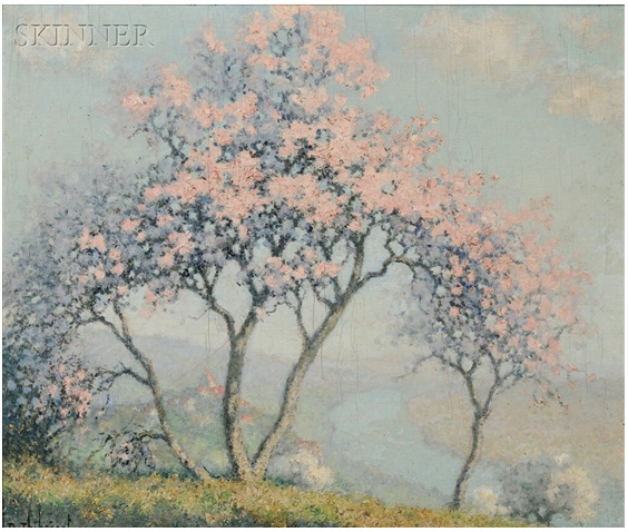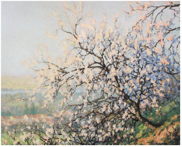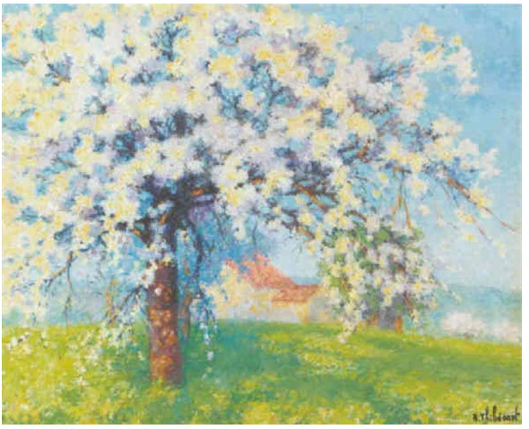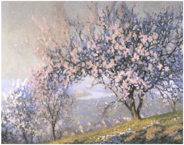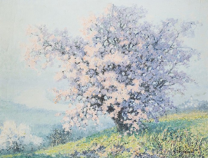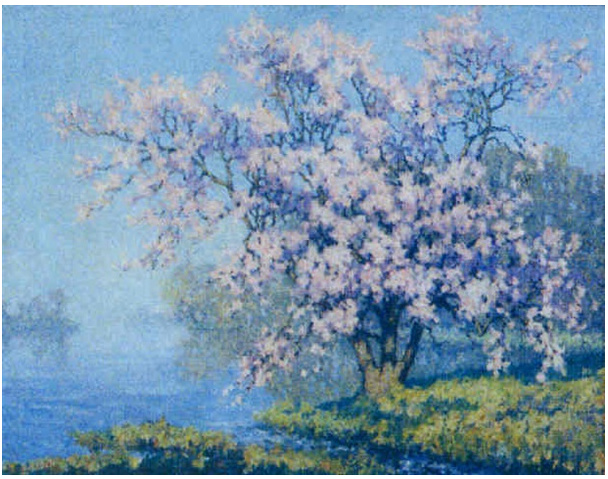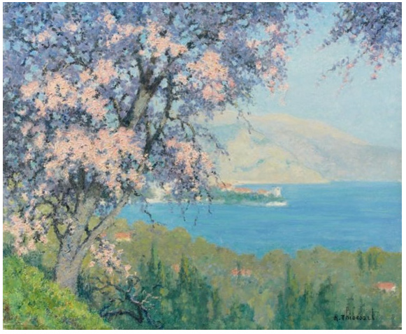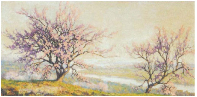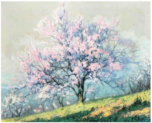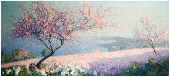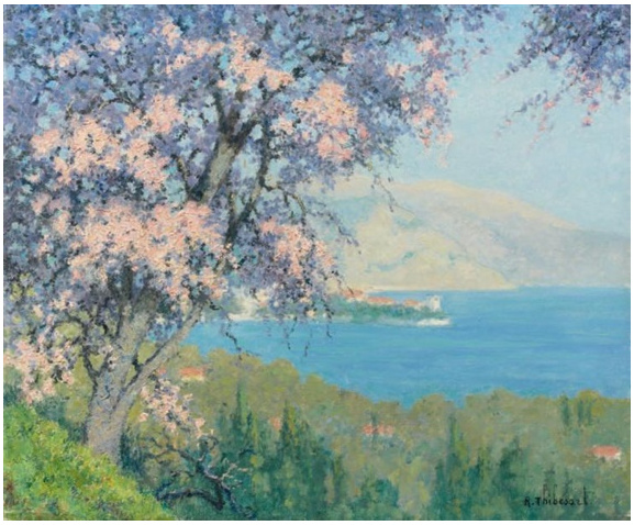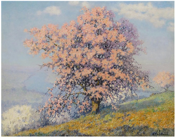 印象派的理想在东方,所以东方的意境,在印象主义作品中,也会有所张扬与体现,因这是写意油画,我们从他们的作品中看到的是抒情,是诗意的表达。可以以东方的诗,比如“一树梨花压海棠”,等诗句来形容吗,其实也是可以的,我们同样看到西洋画师画出的诗意。Raymond Thibesart (1874–1968)是法国画家,他却用油彩画出东方风情与神韵,而且他的主角,就是粉色的花树,这样淡化了西洋原本的风情,而向东方看齐,是十分有意思的。其实画东方风情,不一定是画着东方服饰的美人,或者还拿着折扇,画春花秋月其实也是追求东方境界的方式。莫奈专注画睡莲,Raymond Thibesart专注画花树,异曲同工。