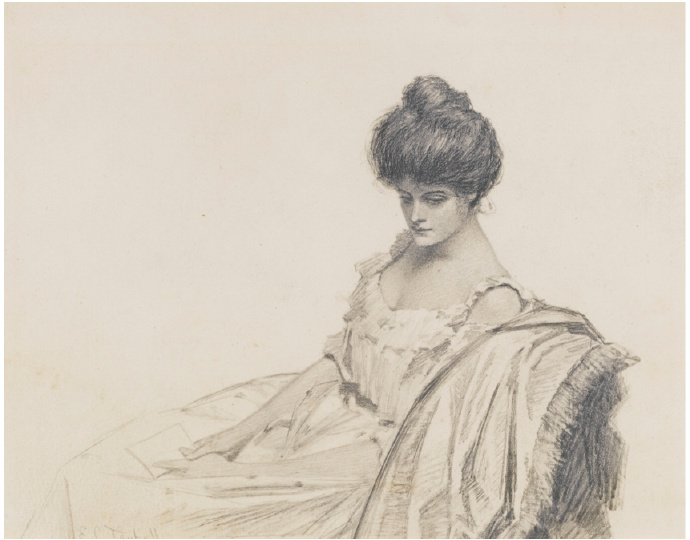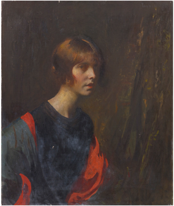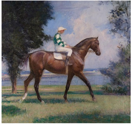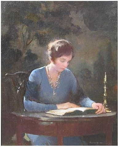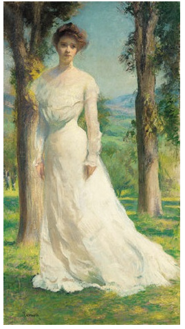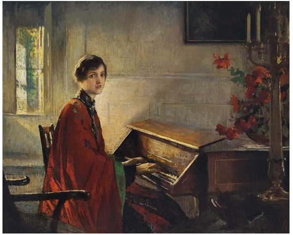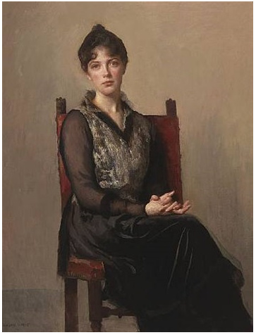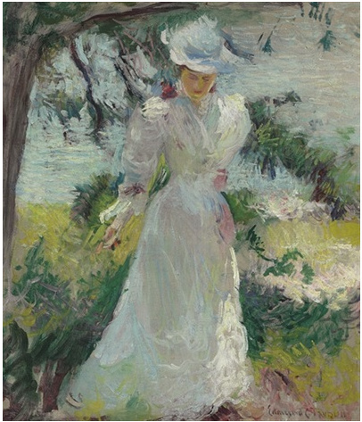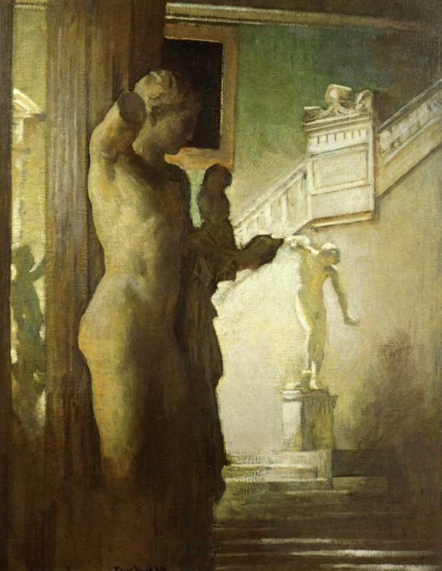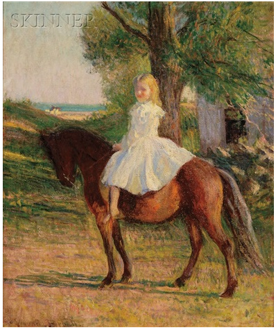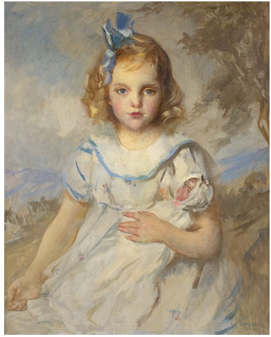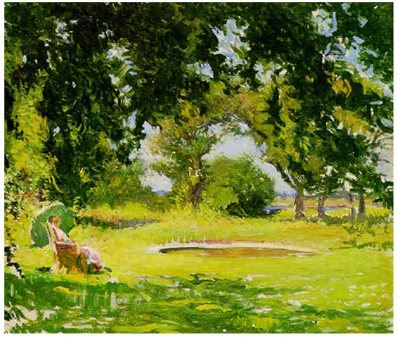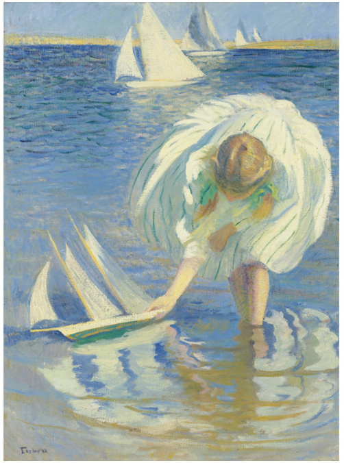 Edmund Charles Tarbell 埃德蒙·查尔斯·塔尔贝尔(1862–1938)美国画家,印象写实风格,所绘《儿童与小船》是其风味独特的作品,淡蓝的基调,图中右边中间部分绘一女孩着有条纹的白裙衣,在浅浅海滩摆弄自己的玩具船,其背景的海中景是风帆,更远处也有几片风帆,再远处是黄绿的海岸,画面上部的中景三角形的风帆与下部分三角形的玩具风帆,与呈现圆形的女孩造型,形成一种三角稳定构成,一圆与两三角形的构造方式形成独特的稳定又奇特的构成,体现画者的妙思的高超的处理构图的能力,女孩的圆,金发的头部正好在圆心,衣裙形成的圆包围着其头部,下面女孩的玩具风帆的倒影呈现半圆的形态,整体画面有现代构成的意味,虽然其画风仍然介于印象与写实之间。其淡雅的蓝色调,以群青,钴蓝渗和钛白而成,而女童的衣裙条纹,有含有粉绿的因素,以及水中的土黄,在色彩的种类上不是太多,但这种淡雅的和谐,主要吸引的力量还是在造型构成的布局合理与巧妙。关于Edmund Charles Tarbell 我前面也介绍过,主要是他的作品大多数画面有一处小道具,就是东方的瓷器,见《塔贝尔印象主义画作中的元青花》文之尾部的链接可伸延阅读。