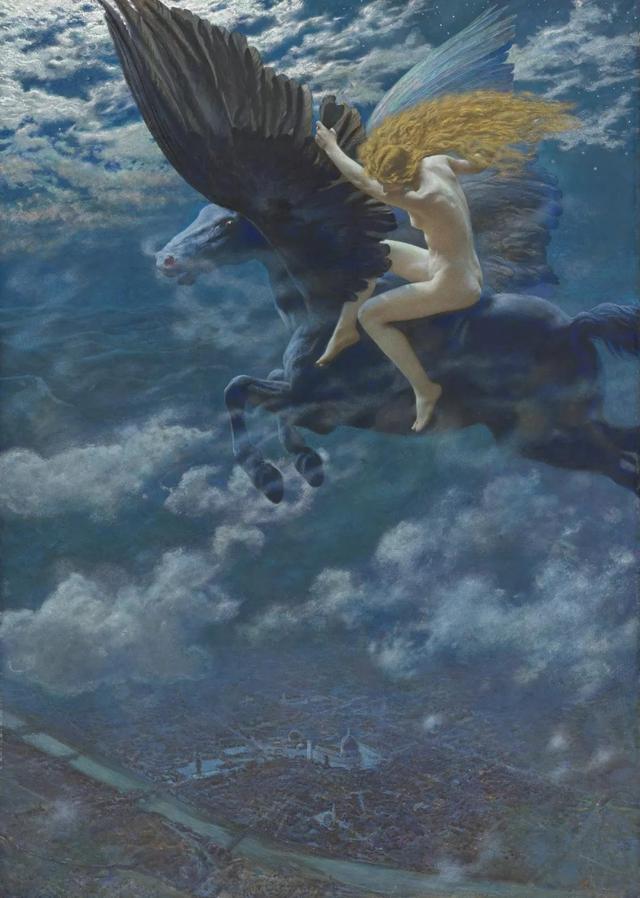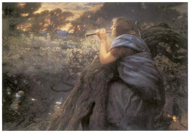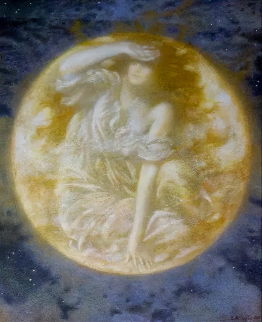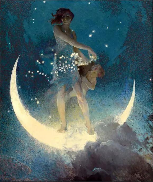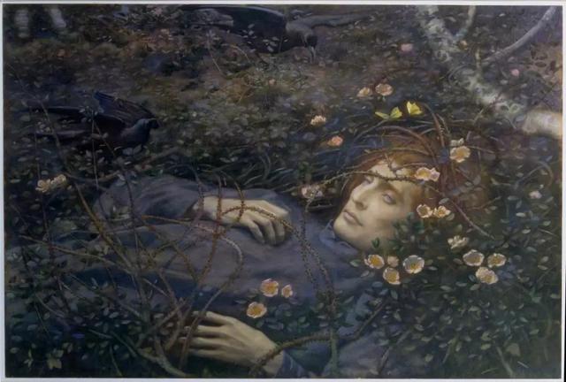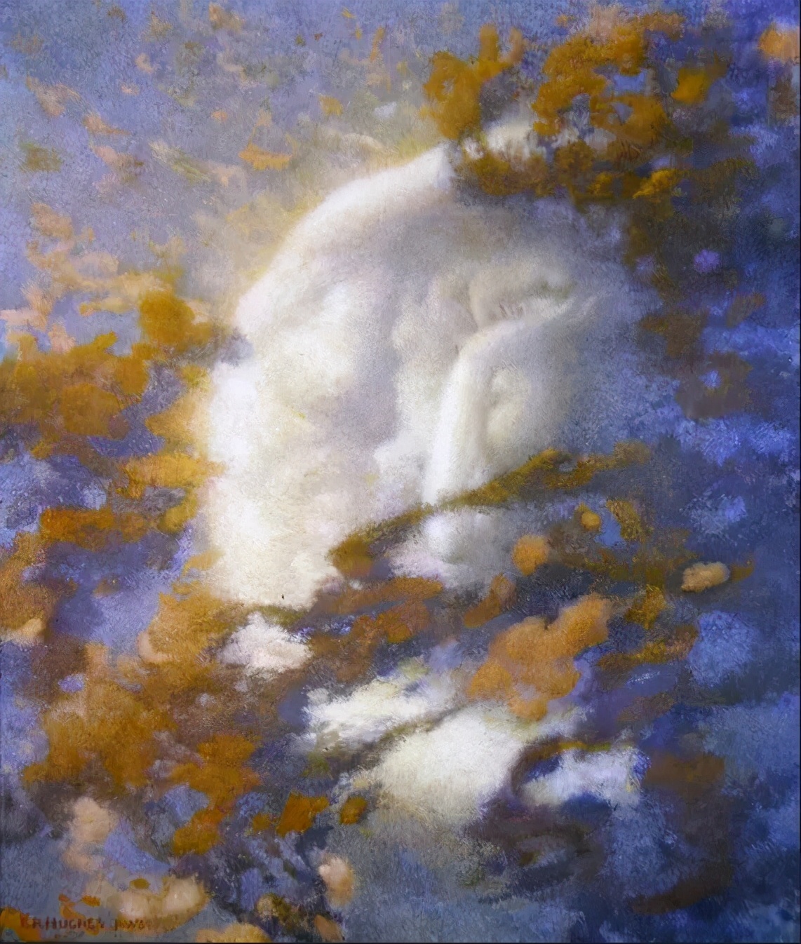 爱德华·罗伯特·休斯(Edward Robert Hughes)二代前拉菲尔画派重要画家。他的作品具有文学性与神话性,以绘画语言表现朦胧的意境,充满神秘的感觉。他的那些作品如飘渺虚无的星际世界,日月星辰,星球中的星际美人,迷蒙而淡雅,有一种难以言说的感觉。他的画已经脱去前拉菲尔一代画人的铅华与艳丽,画面倾向于素雅质朴,似乎有绘画心理的淡淡忧愁的意味。