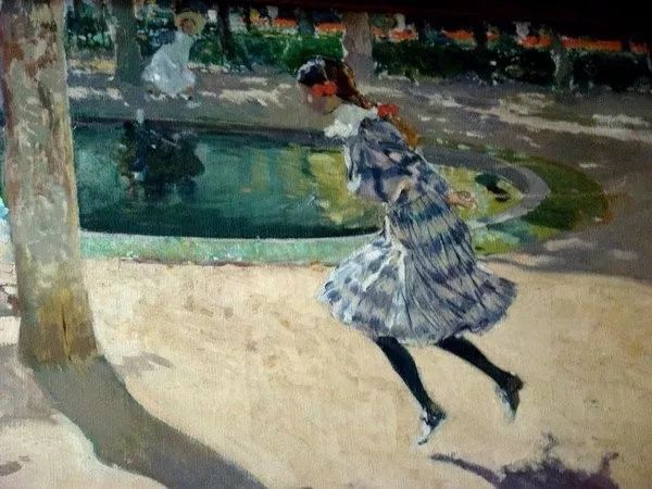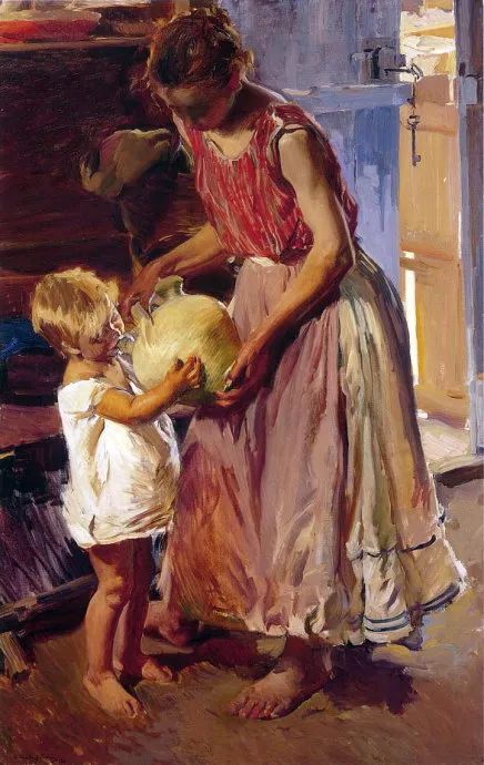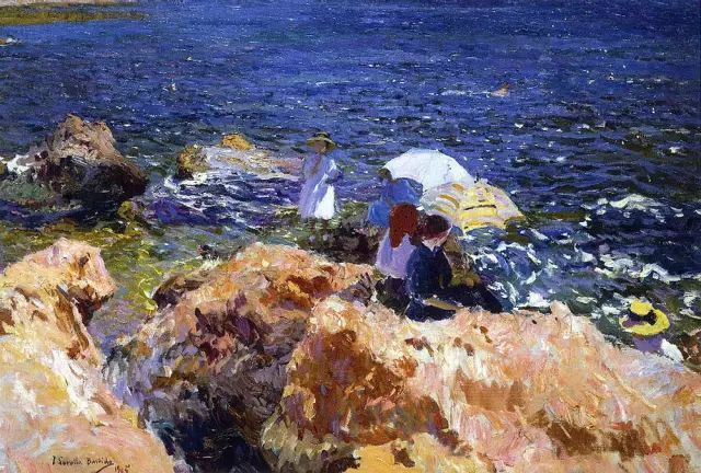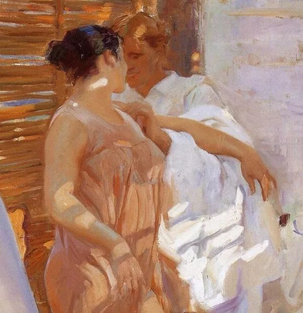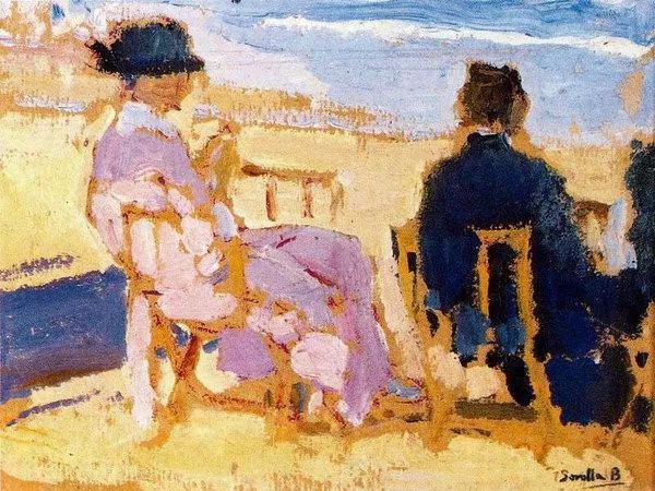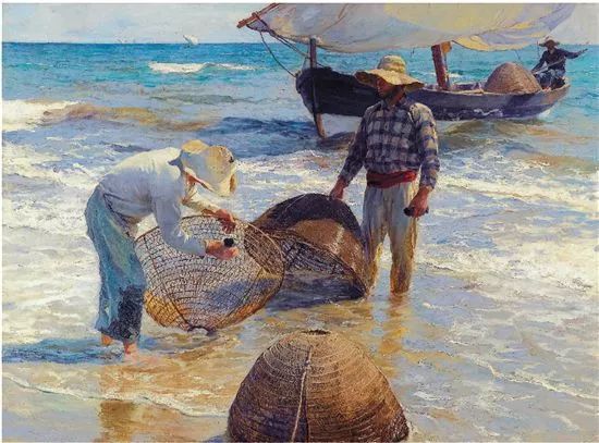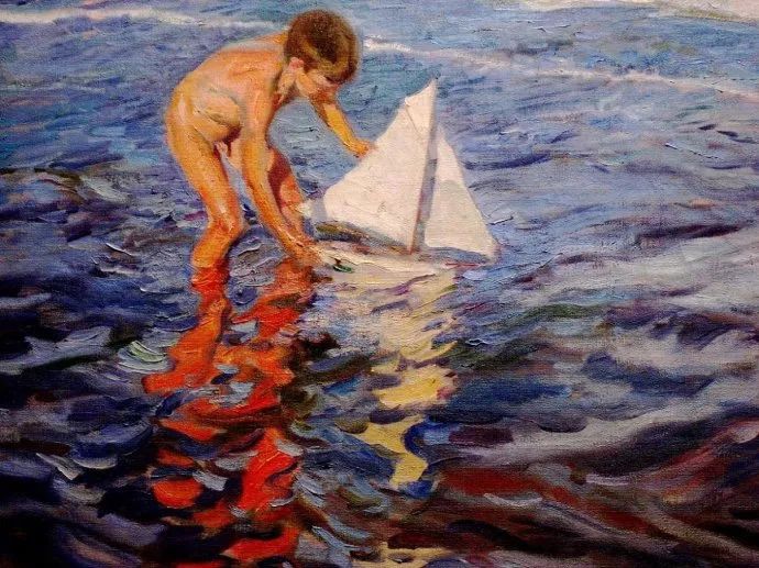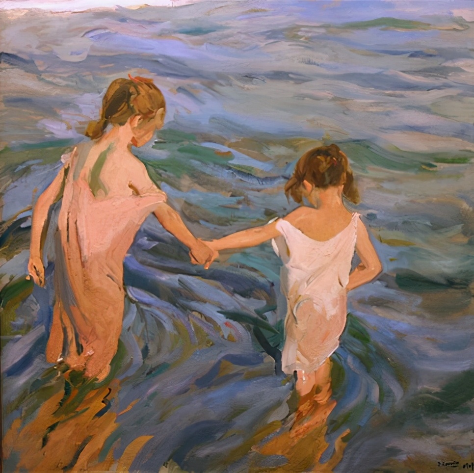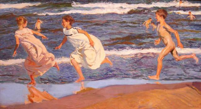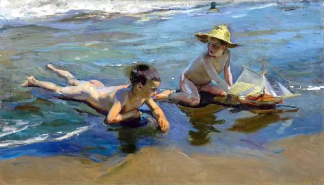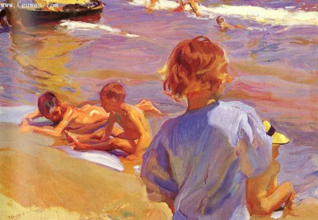 霍金·索罗亚·巴斯蒂达((Joaquín Sorolla,1863——1923))的人生作为一个孤儿,心理的感觉肯定是不好受,但他依靠艺术来沉醉自己,一生的精力都与阳光海滩加是他的笔触相交融,他是与萨金特、佐恩齐名的外光三剑客之一的画者,作品数量大,画了二千多幅的佳作,尤其是对于地中海阳光海滩的风情描绘,展示自己对于心理阳光的依赖,他的这类作品用笔充满韵律感,尤其善于运用钴蓝,还有明快的黄色尤其是桔黄,那种海边风情多绘少男少女,飘动的衣裙,赤身的裸体,在海边嬉戏,奔跑, 仿佛是回味自己的少年情怀,寻找昔日的快乐感觉,我们从他的这类作品明快的色彩与激动的笔触中,获得一种难言的共鸣,不仅仅是阳光的色调养眼,更为重要的是唤起一种心理的温暖。海与渔夫,海边的居民,是他熟悉的所在,另一个西班牙画家毕加索也是爱画海边的风情,他们有一种地域的共性,不同的是霍金·索罗亚·巴斯蒂达的作品有浓郁的人间烟火气,因为他的作品是介于写实与印象之间。