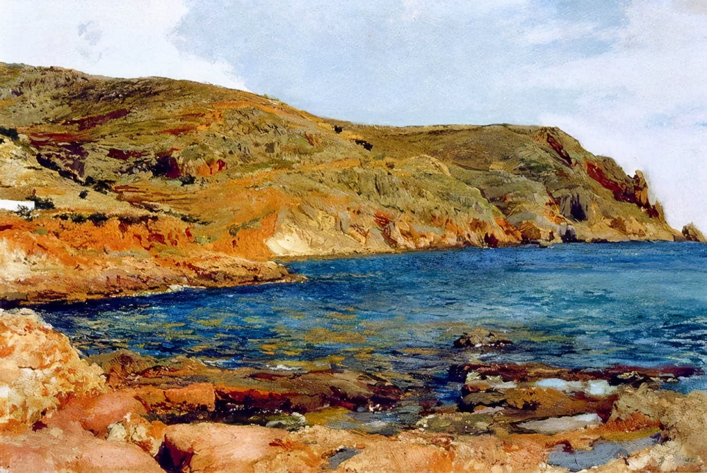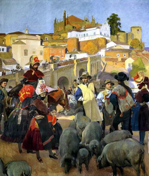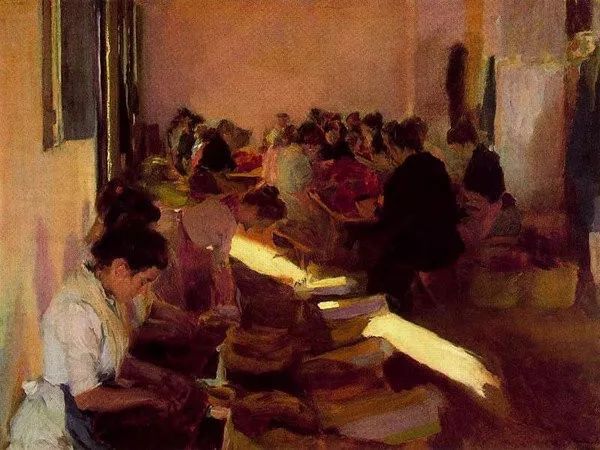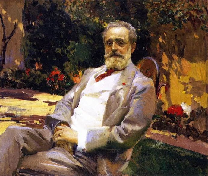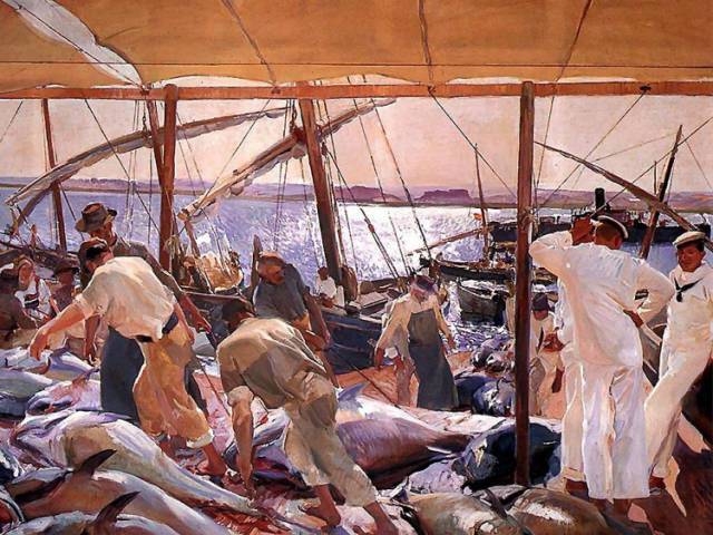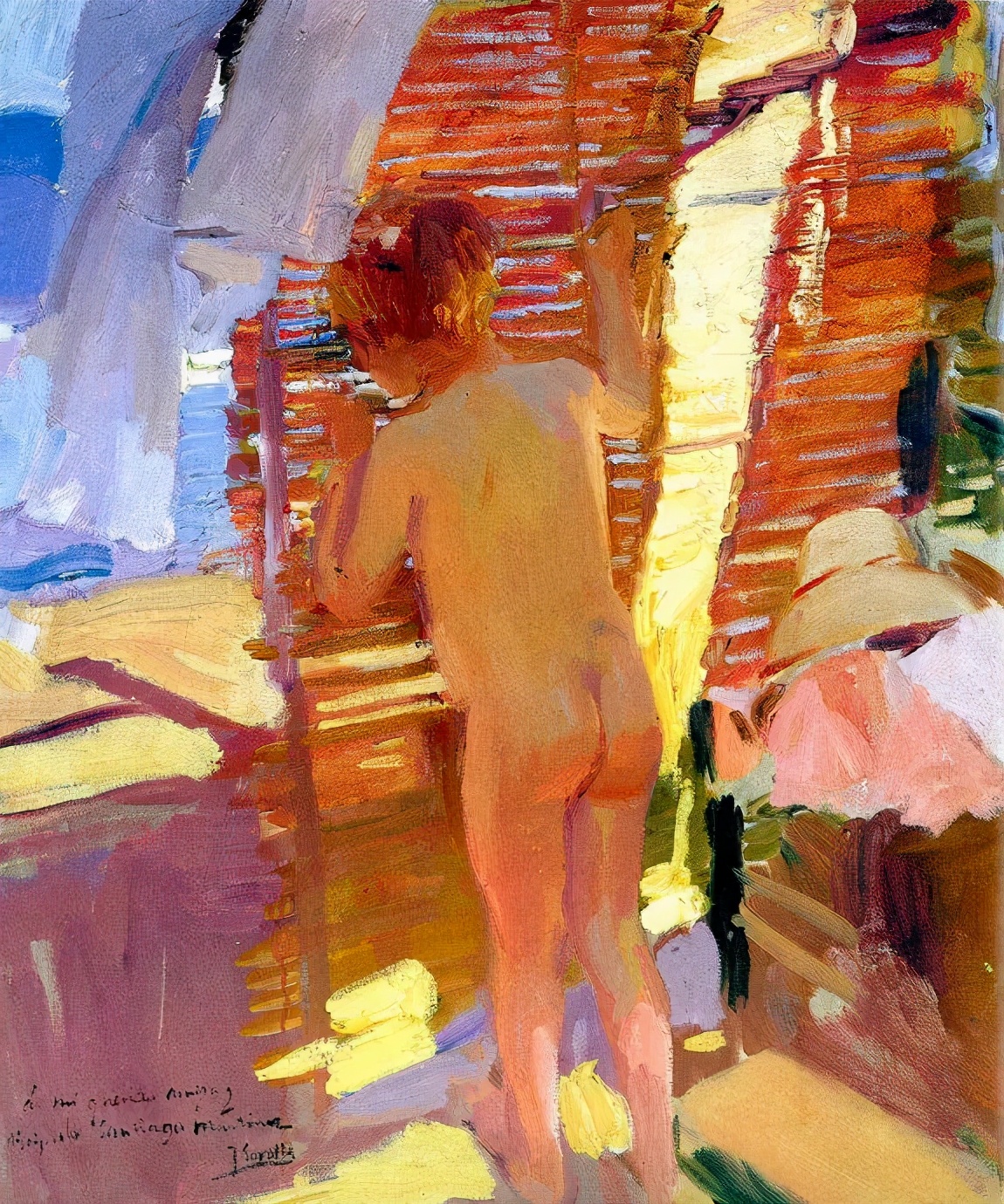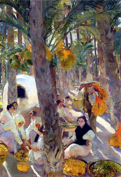 霍金·索罗亚·巴斯蒂达((Joaquín Sorolla,1863——1923))的人生作为一个孤儿,心理的感觉肯定是不好受,但他依靠艺术来沉醉自己,一生的精力都与阳光海滩加是他的笔触相交融,他是与萨金特、佐恩齐名的外光三剑客之一的画者,作品数量大,画了二千多幅的佳作,尤其是对于地中海阳光海滩的风情描绘,展示自己对于心理阳光的依赖,他的这类作品用笔充满韵律感,尤其善于运用钴蓝,还有明快的黄色尤其是桔黄,那种海边风情多绘少男少女,飘动的衣裙,赤身的裸体,在海边嬉戏,奔跑, 仿佛是回味自己的少年情怀,寻找昔日的快乐感觉,我们从他的这类作品明快的色彩与激动的笔触中,获得一种难言的共鸣,不仅仅是阳光的色调养眼,更为重要的是唤起一种心理的温暖。海与渔夫,海边的居民,是他熟悉的所在,另一个西班牙画家毕加索也是爱画海边的风情,他们有一种地域的共性,不同的是霍金·索罗亚·巴斯蒂达的作品有浓郁的人间烟火气,因为他的作品是介于写实与印象之间。