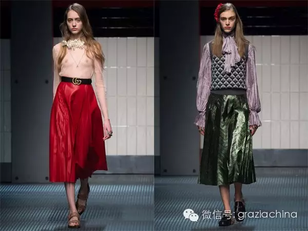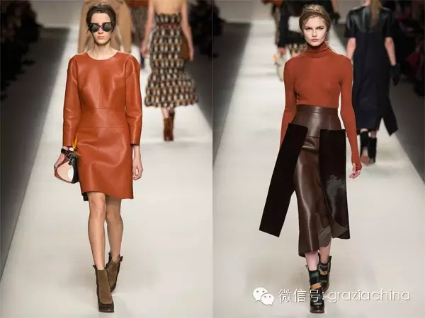 宣言式皮裙,这样的裙装必须用这样昂贵高调的材料来体现,最好是整张皮,加上镶嵌碎皮拼出各种图案,同样的还有皮夹克。千万不要质疑它的实用性,雪纺衬衫、针织上衣、皮夹克、长大衣,它才是高级百搭品。