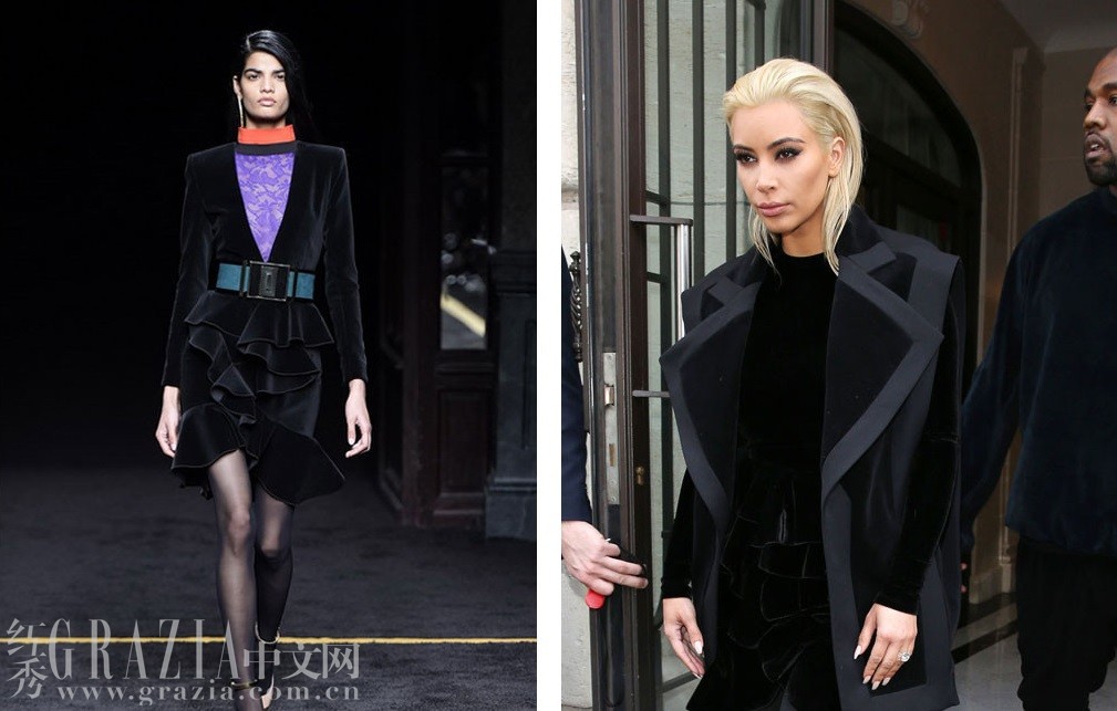 Balmain秀当天,Kim Kardashian穿该品牌2015秋冬系列亮相。(姐妹同款)