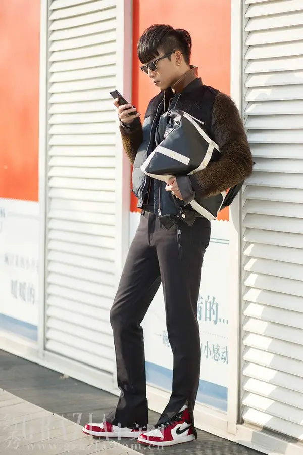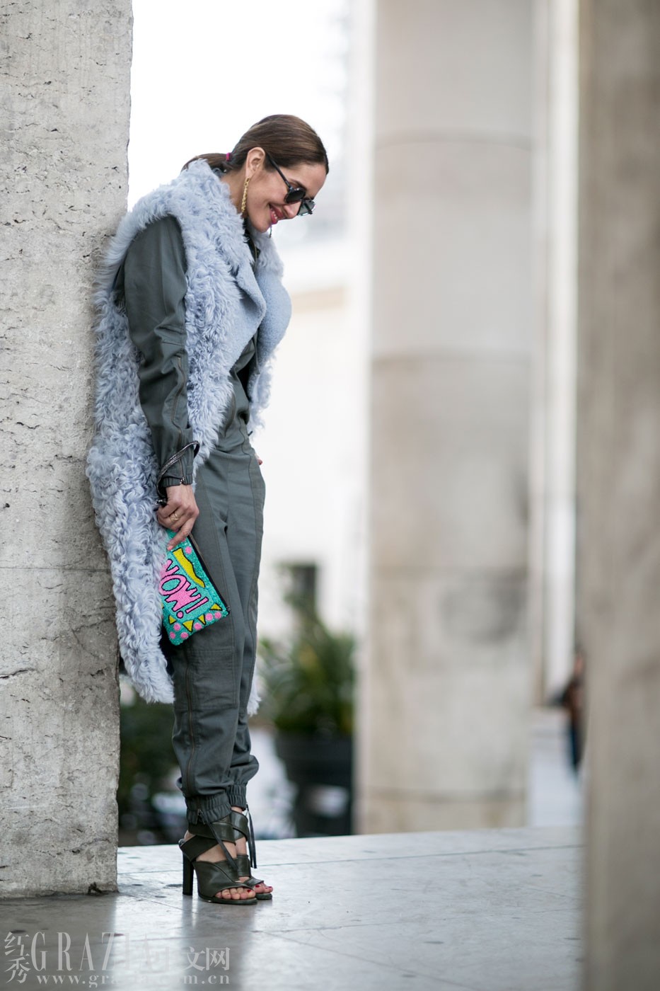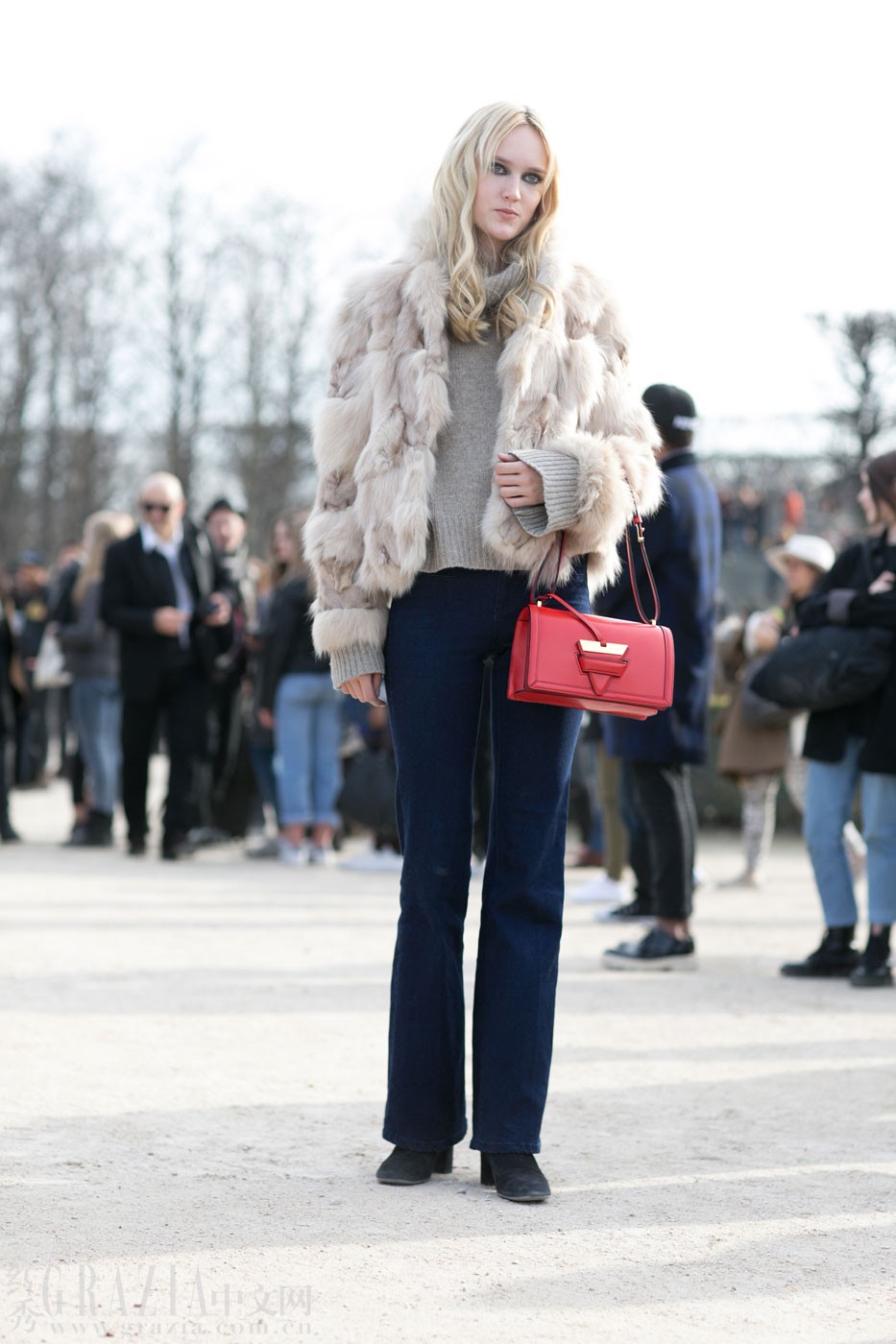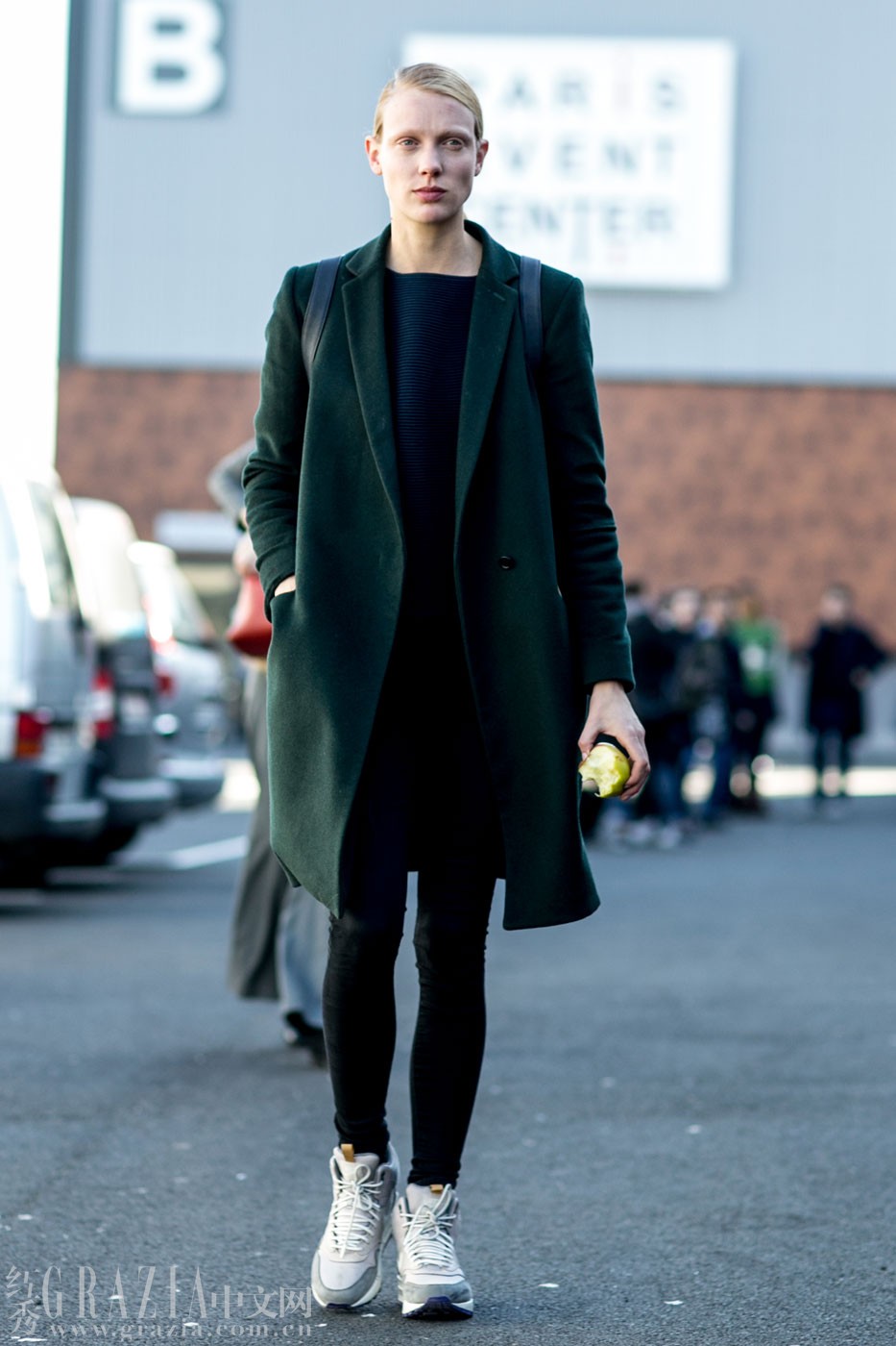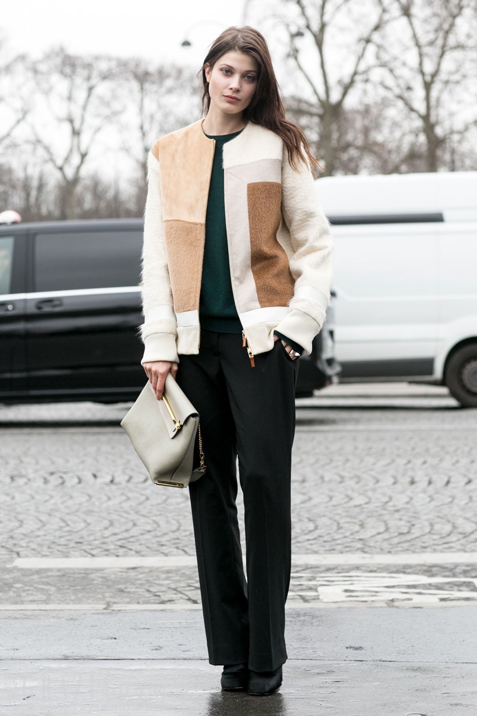 秘诀:棒球皮草外套和运动鞋的搭配,让整体既气派又随性。手拿一款黑白相间的柔软皮革包,既可以装下够多物品,又和整体造型非常协调。