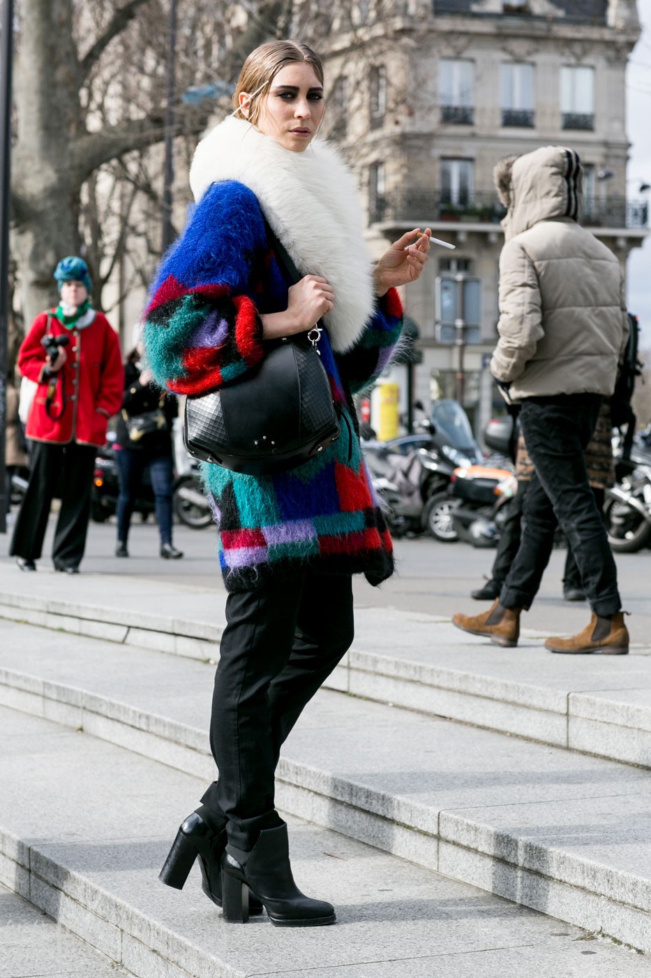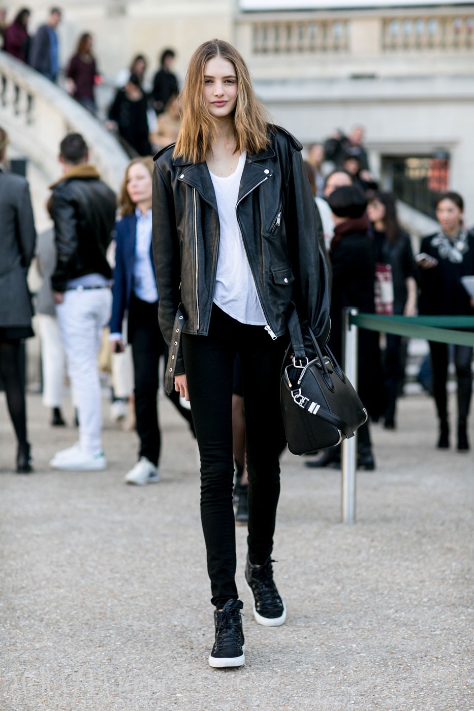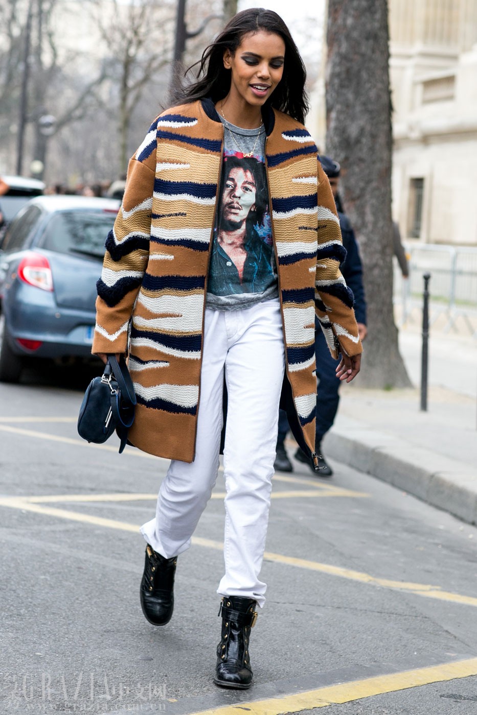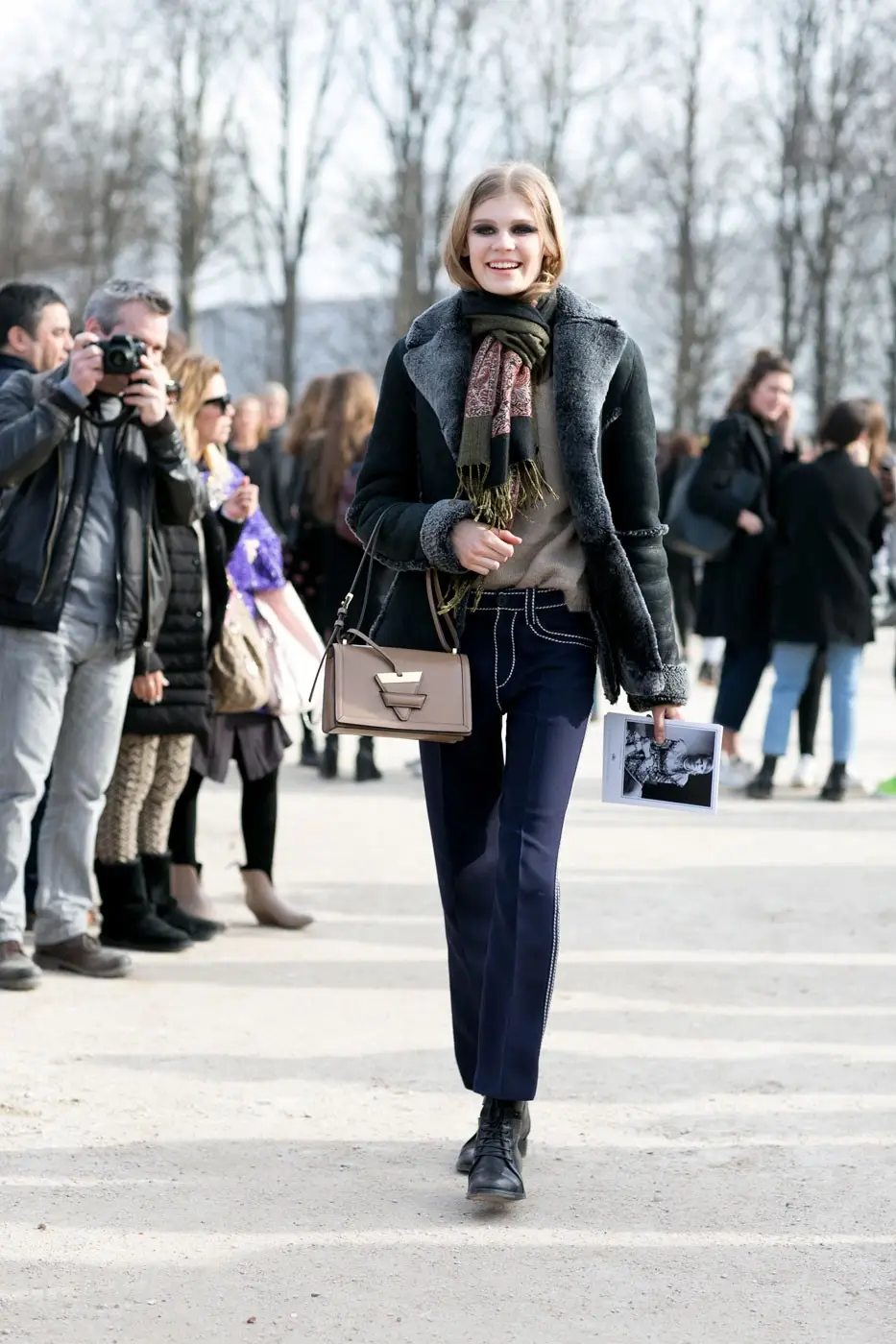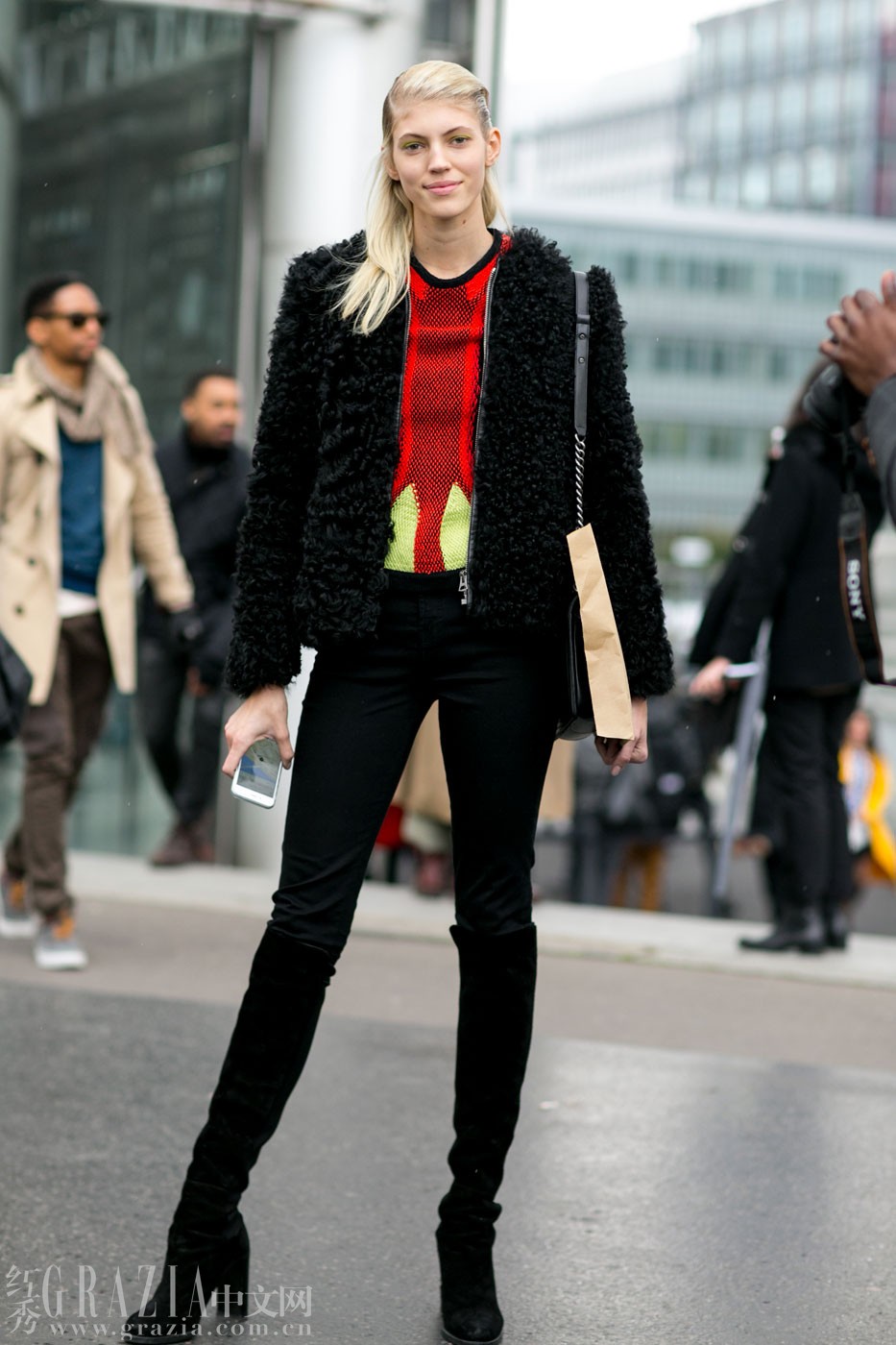 秘诀:棒球皮草外套和运动鞋的搭配,让整体既气派又随性。手拿一款黑白相间的柔软皮革包,既可以装下够多物品,又和整体造型非常协调。