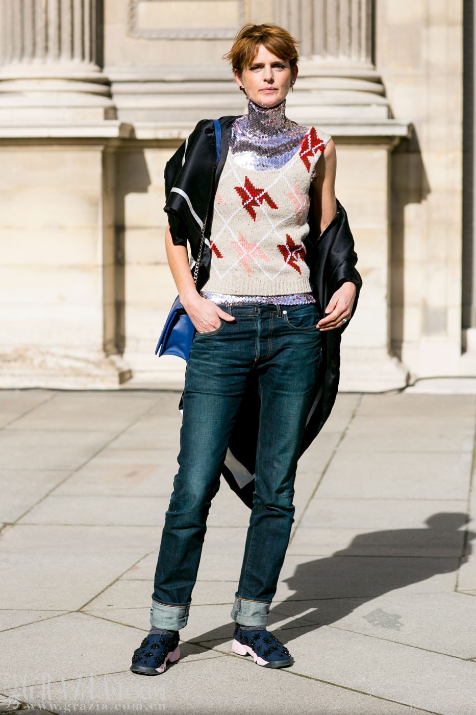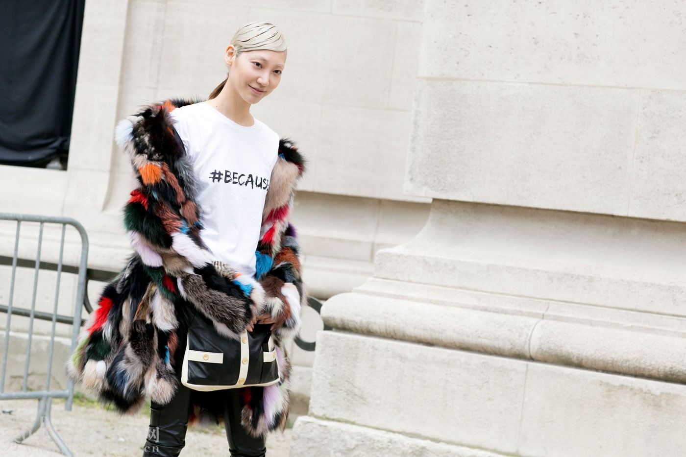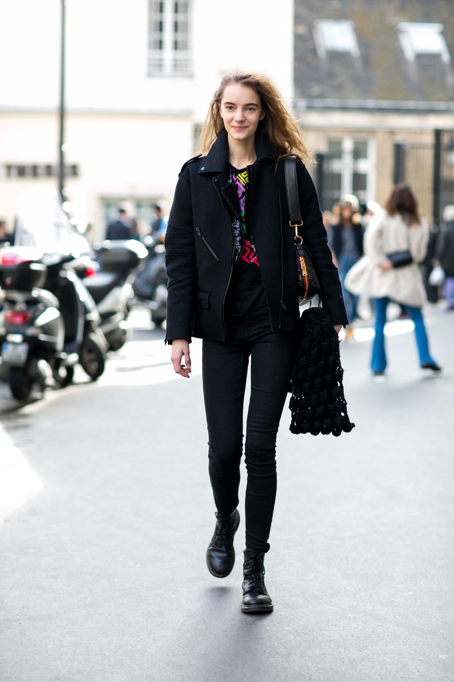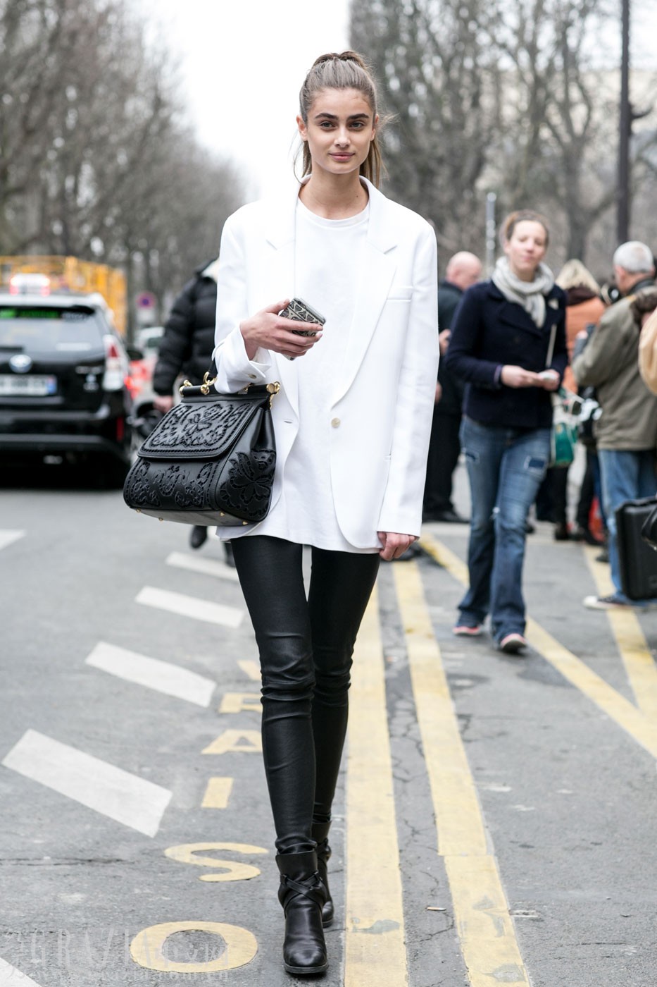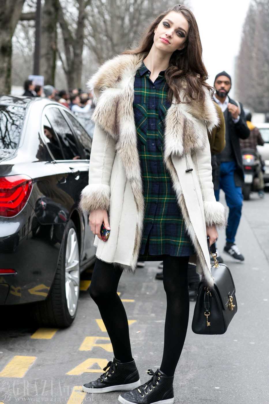 秘诀:棒球皮草外套和运动鞋的搭配,让整体既气派又随性。手拿一款黑白相间的柔软皮革包,既可以装下够多物品,又和整体造型非常协调。