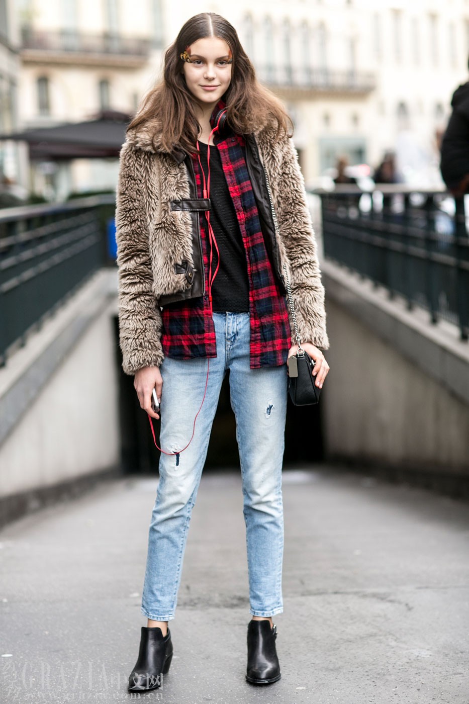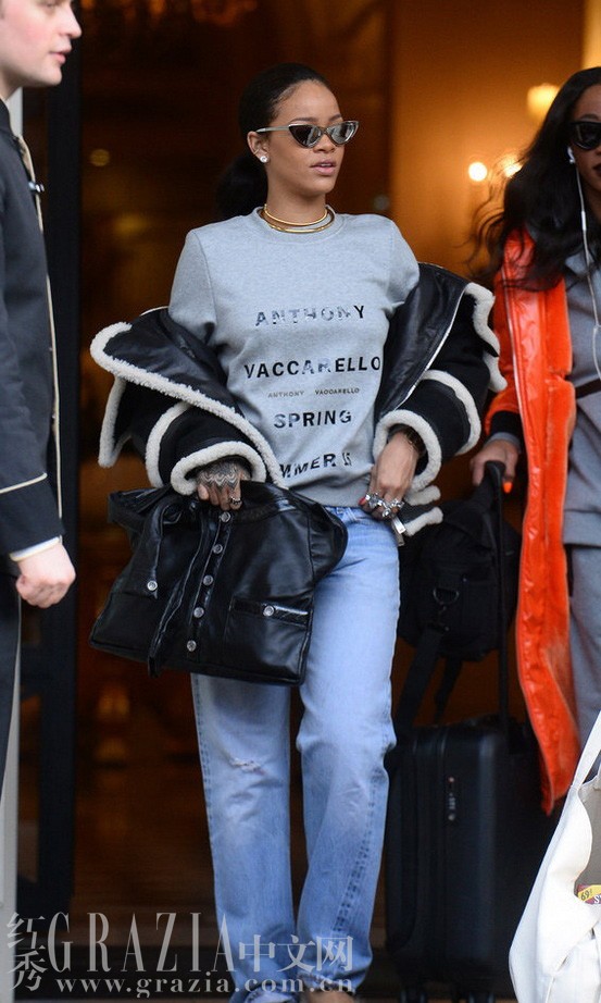 秘诀:蕾哈娜总是勇于尝试最大胆的搭配方法,字母T恤、牛仔、皮毛外套的组合是街头混搭的典范,抓起一只皮包,宣示“I don't care!”