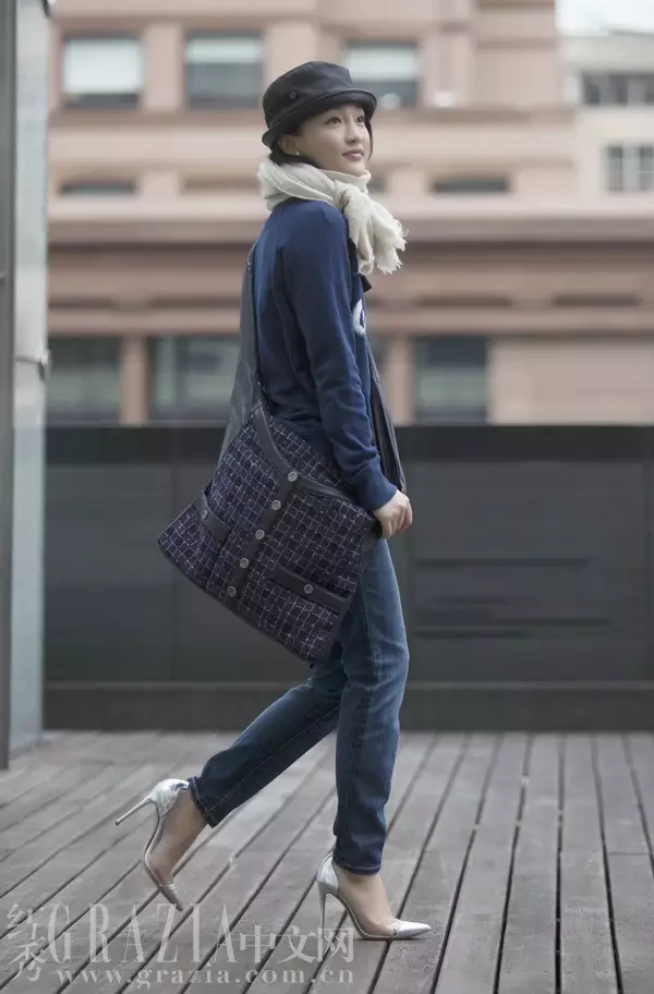 秘诀:高跟鞋配休闲装,包要同色才自然。个子娇小的女生可以借助高跟鞋和帽子来“增高”,将肩带长度调整到包靠着臀部的位置为佳。