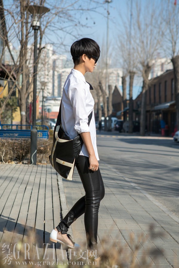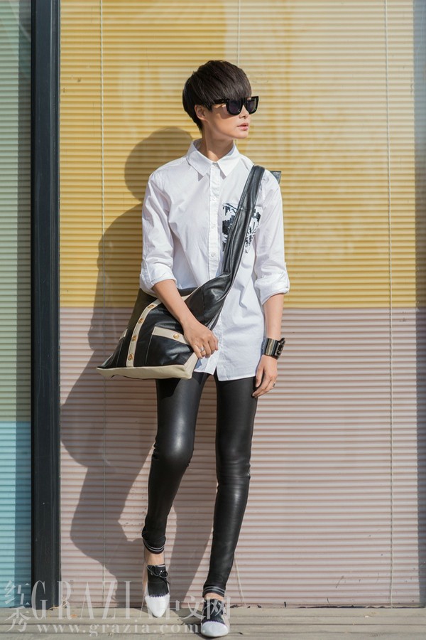 秘诀:穿衣打扮总是走着最美中性风的春春,选择了衬衫和皮裤的组合,色彩上走着黑与白的经典搭配。选择的包袋当然也要是皮革与黑白组合的款式。