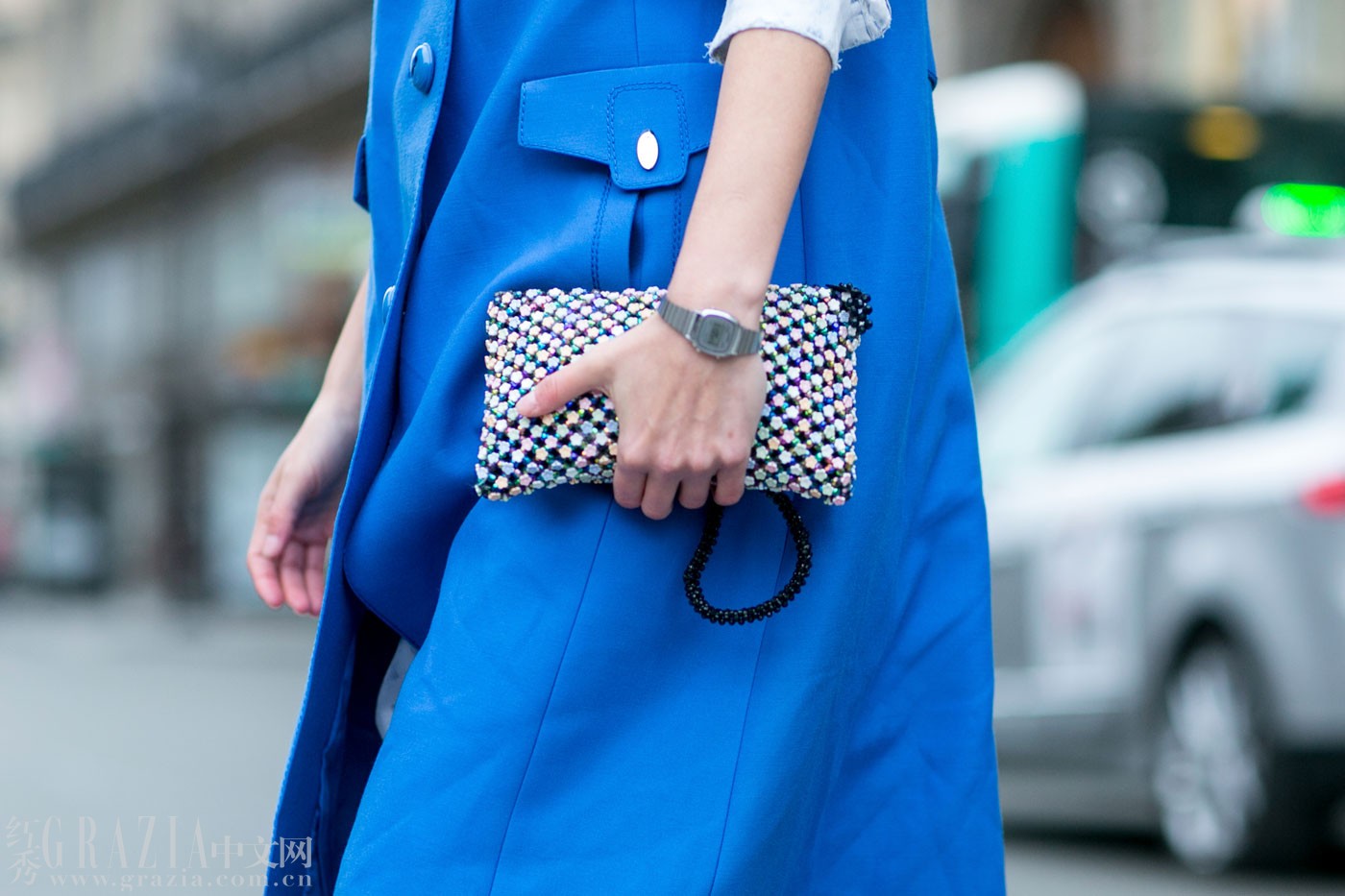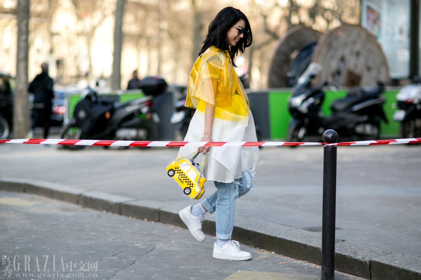 秘诀:刷存在感最好的方式就是挑选独特吸睛的配饰,以及用个性的方式来表现它们。田原选择了手拿包回眸一笑,春日街拍必杀技!