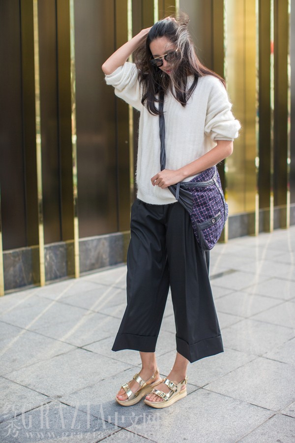 秘诀:每天肩背包厌烦了?没关系,挑一款和整体色调统一的包系在腰间,不论是购物还是出游都轻松方便。