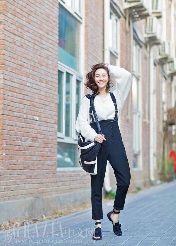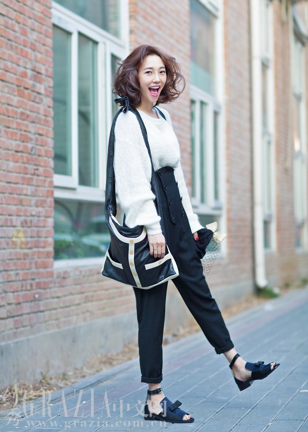 秘诀:高腰萝卜裤搭配薄毛衣和平底鞋,既舒适又充满假小子的感觉,选择一款色彩简单的包,单肩一背就出门吧!