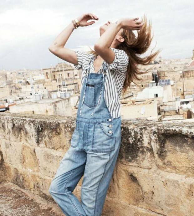 背带裤这东西,真心就是给大胸妹准备的,一件简单的白色T恤配上一条背带裤,足以让男人们鼻血横流。但是平胸妹子如果想挑战的话,难度真的不是一般的大。个人建议,妹子们可以如图中这样,用上衣斜搭在肩上,然后将自己的发型弄得凌乱一点,配上牛仔背带裤,给人一种美女技工的感觉,同样也是会备受男人注意的。