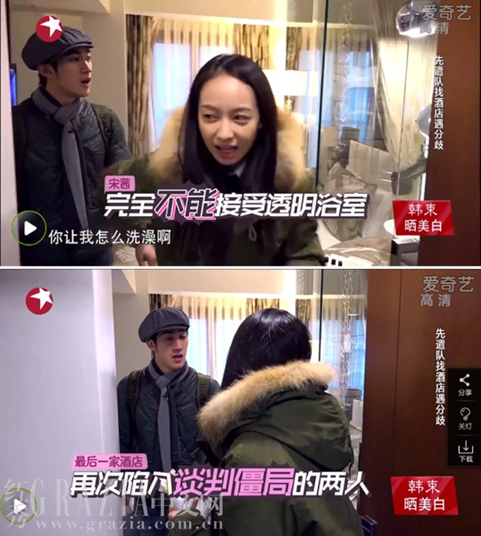 宋茜只能硬着头皮先来到李治廷看中的酒店,最后以厕所是透明的为由拒绝了这家酒店,最后两人还是去了宋茜刚才提议的那家。事实上酒店作为整个节目拍摄的大本营,一般都是编导钦定,不太可能让明星在节目中真的随便选的。