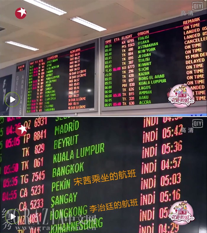 据此推断宋茜和李治廷是同一天到达土耳其的。那么时间先后相差多少呢?从节目中对神秘姐姐航班信息的镜头特写中,我们可以知道宋茜的航班应该就在这些信息中。其中只有一班从北京飞来的班机,就是宋茜乘坐的;而李治廷乘坐的从香港飞来的班机也在图上,两个航班落地相隔时间前后还不到20分钟。两个小伙伴下飞机时间如此相近,宋茜喝杯咖啡就能等到李治廷了!如果真的是真人秀,李治廷和宋茜为什么不一起愉快的在机场碰头呢?为啥他们两个要分开走,再到pera palace hotel汇合呢?